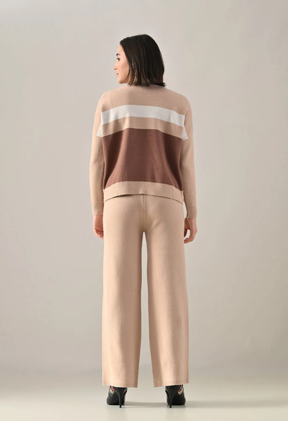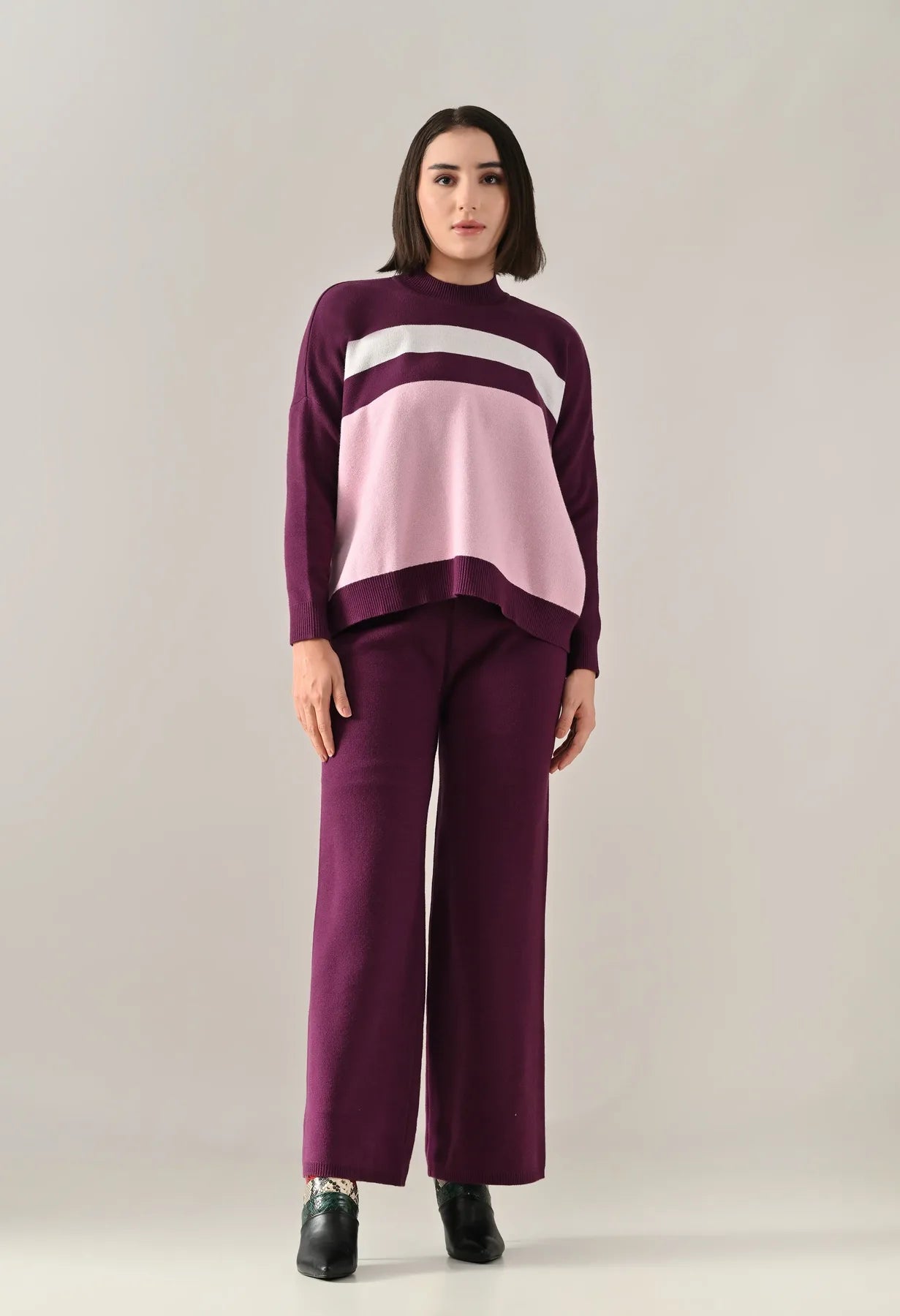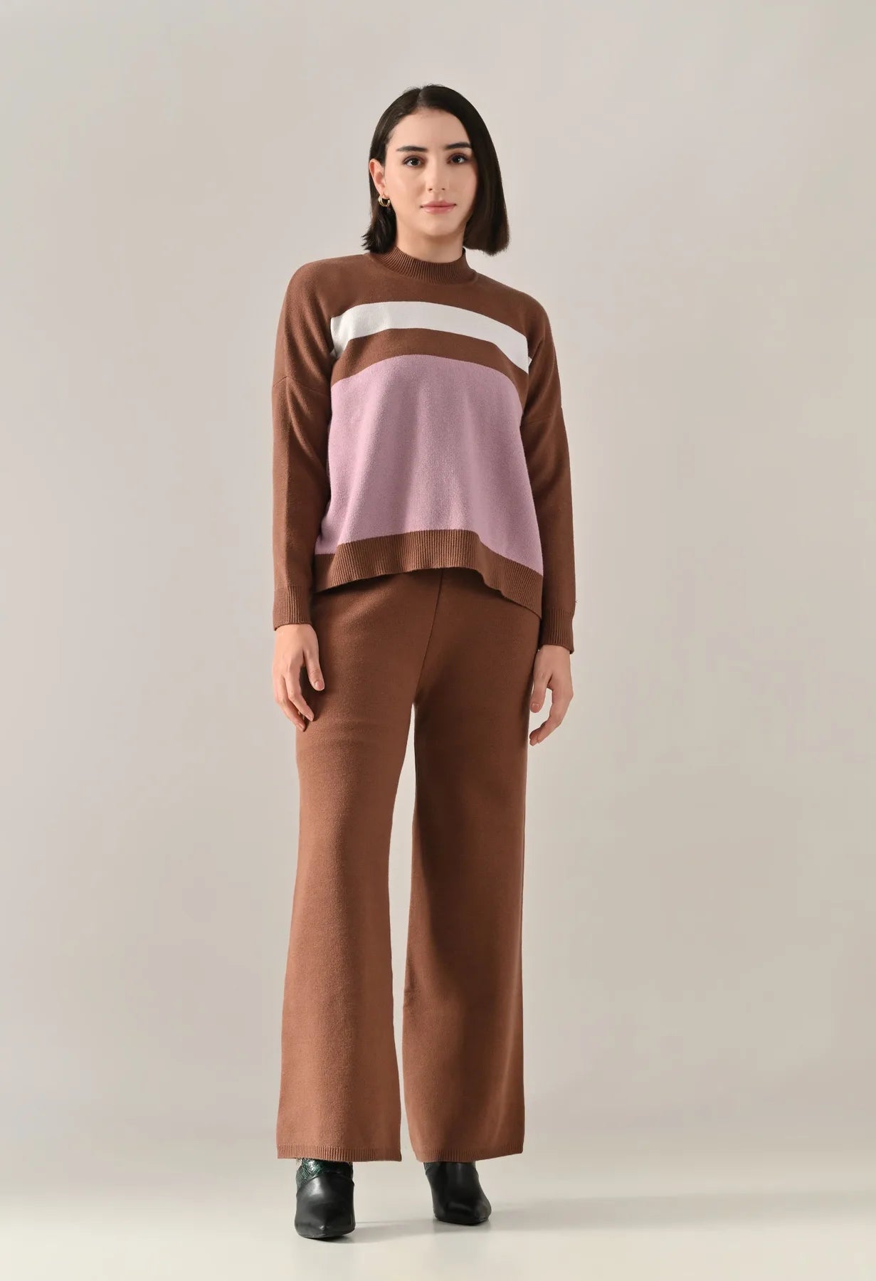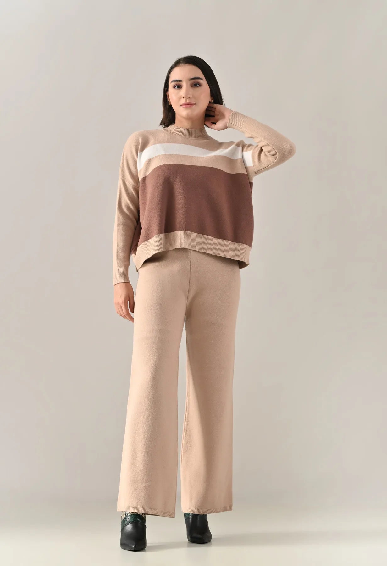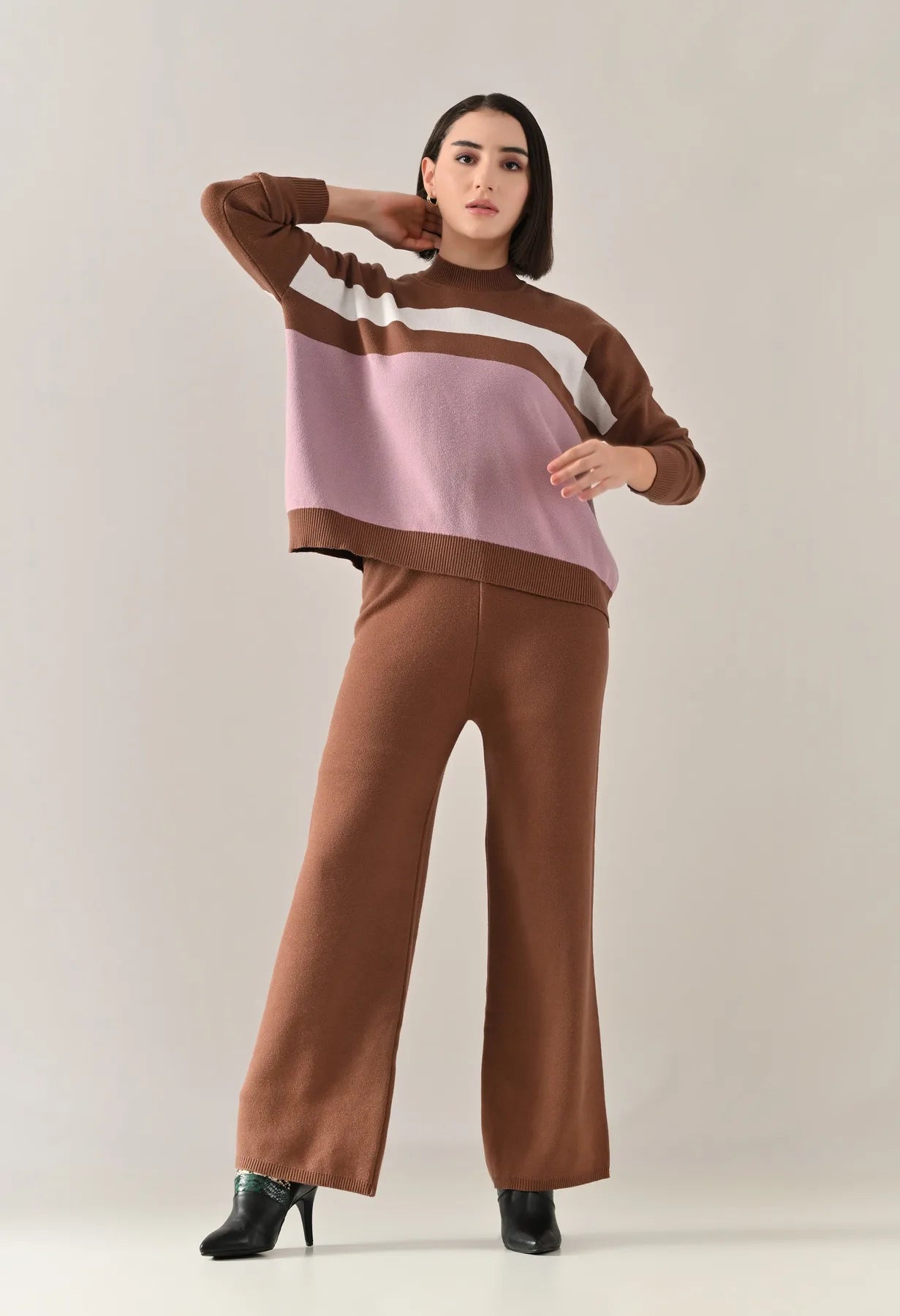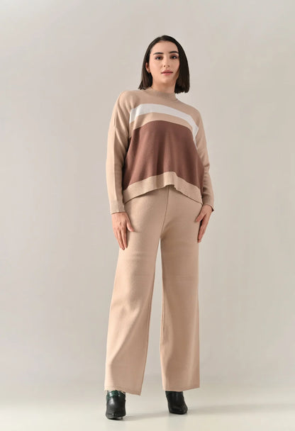 A trendy stripe knitted co-ord set featuring a mock neck with rib detailing, short Length, baggy loose-fit style with full sleeves. The top showcases a stripe pattern at the front with a regular ribbed hem for a structured finish. Paired with straight solid lower designed with a broad elasticated waist. Crafted from soft, comfortable, and stretchable fabric, this set combines cozy texture with modern design for effortless everyday style.
