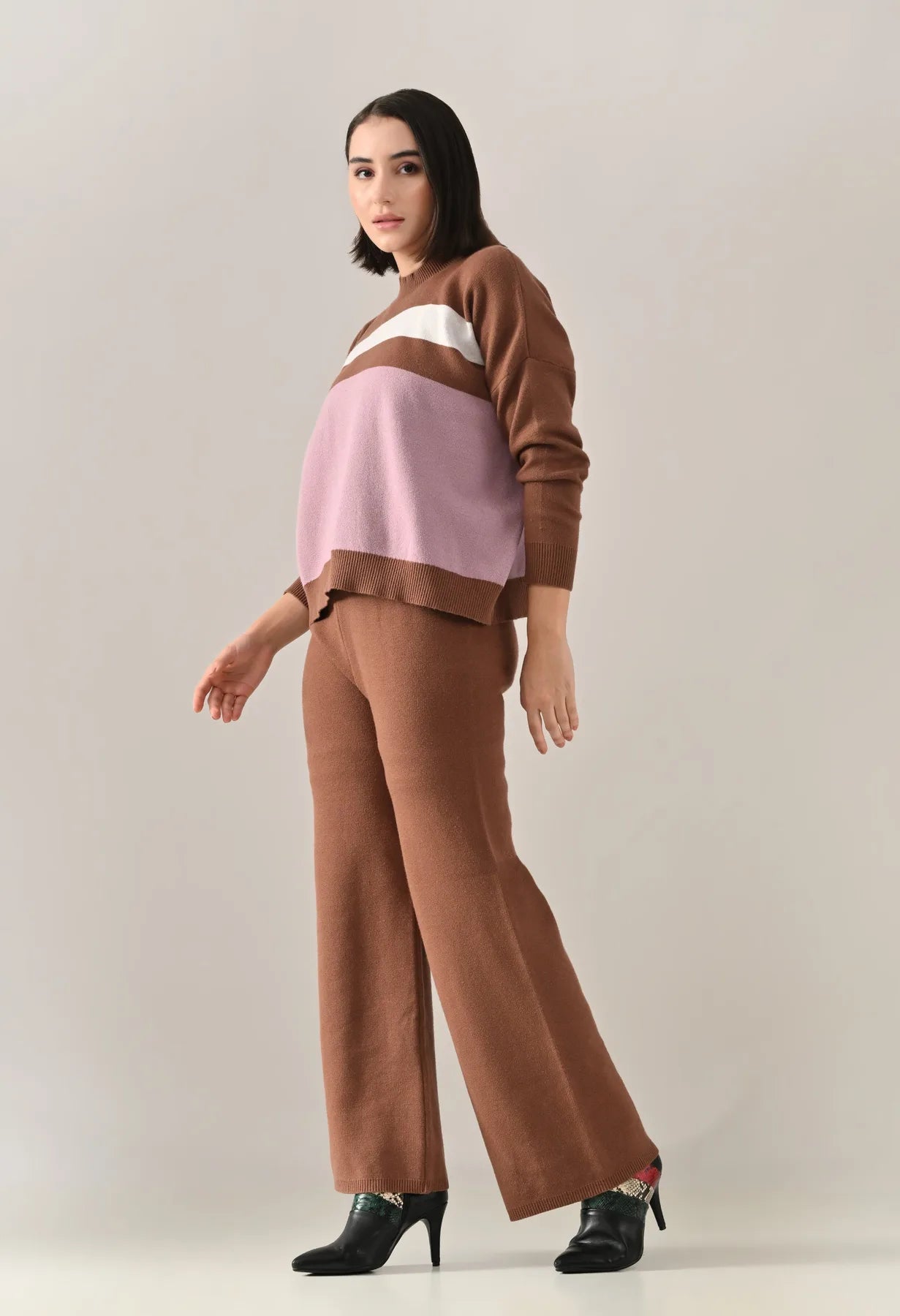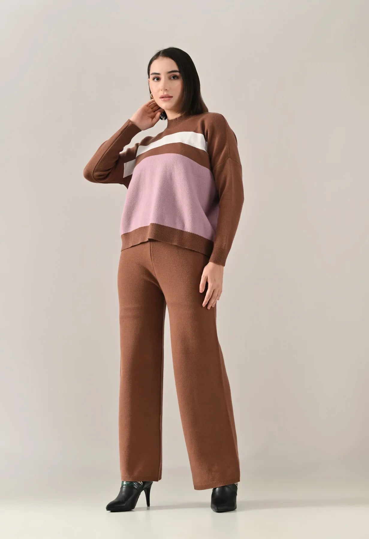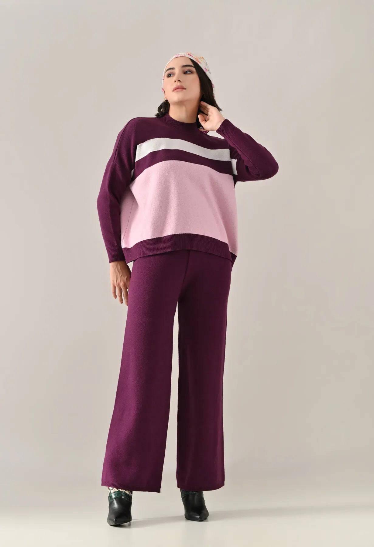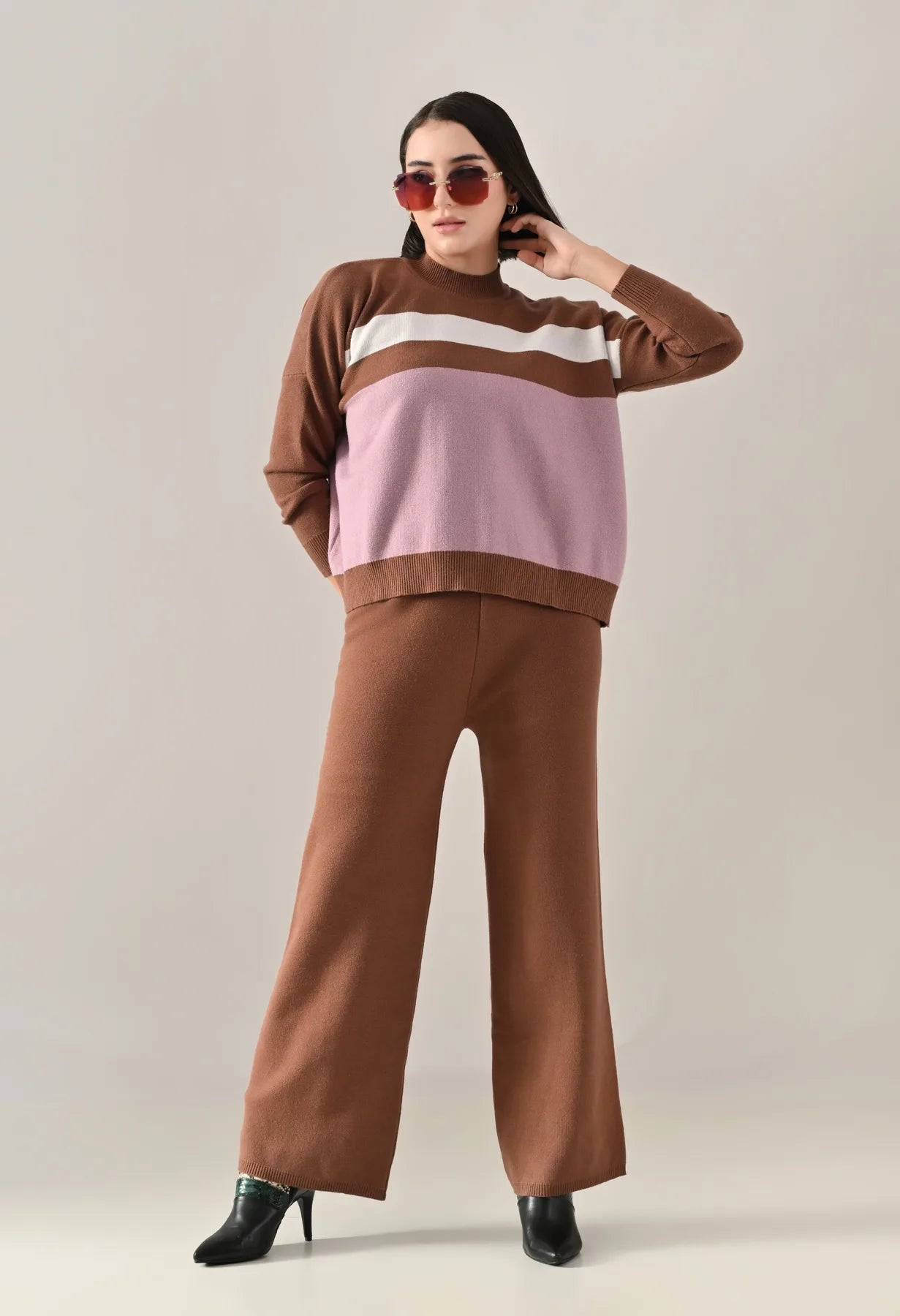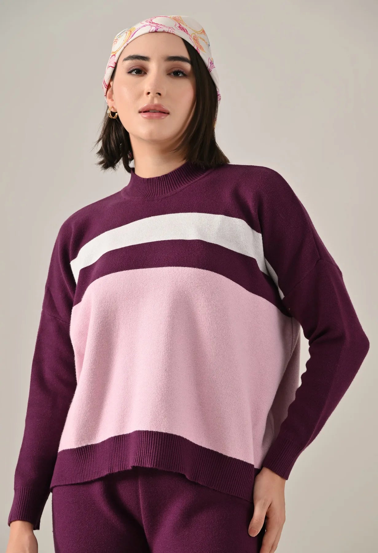 A trendy stripe knitted co-ord set featuring a mock neck with rib detailing, short Length, baggy loose-fit style with full sleeves. The top showcases a stripe pattern at the front with a regular ribbed hem for a structured finish. Paired with straight solid lower designed with a broad elasticated waist. Crafted from soft, comfortable, and stretchable fabric, this set combines cozy texture with modern design for effortless everyday style.