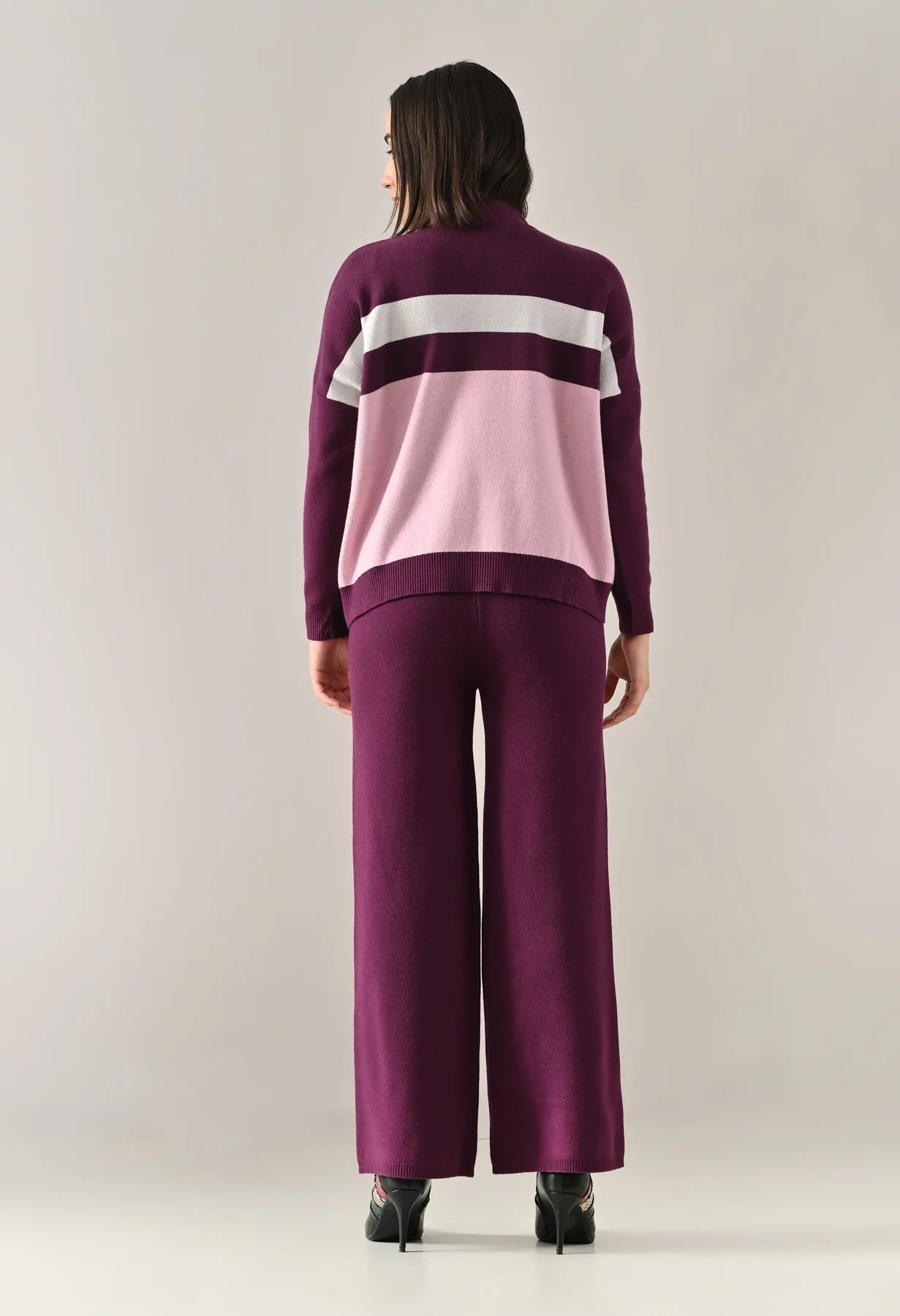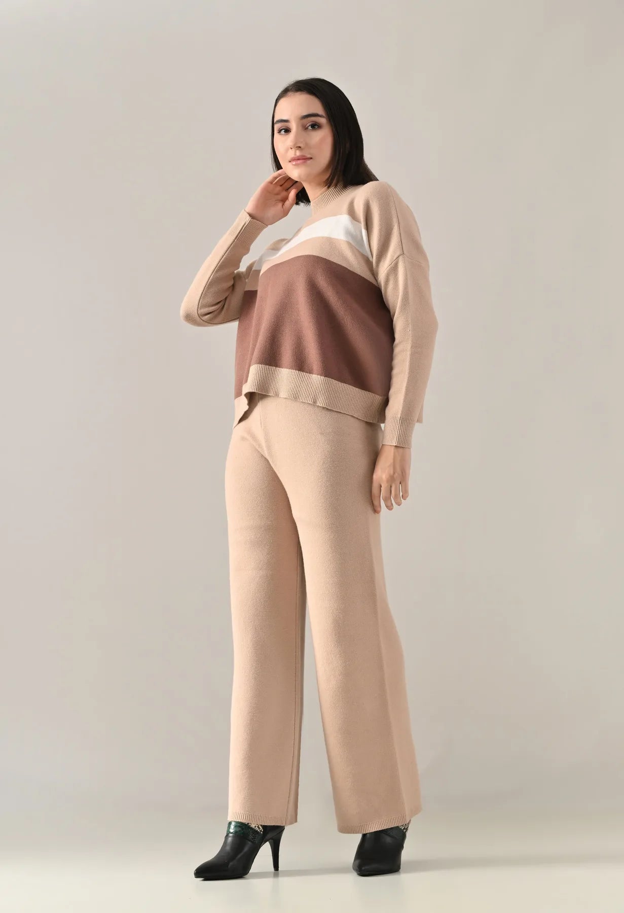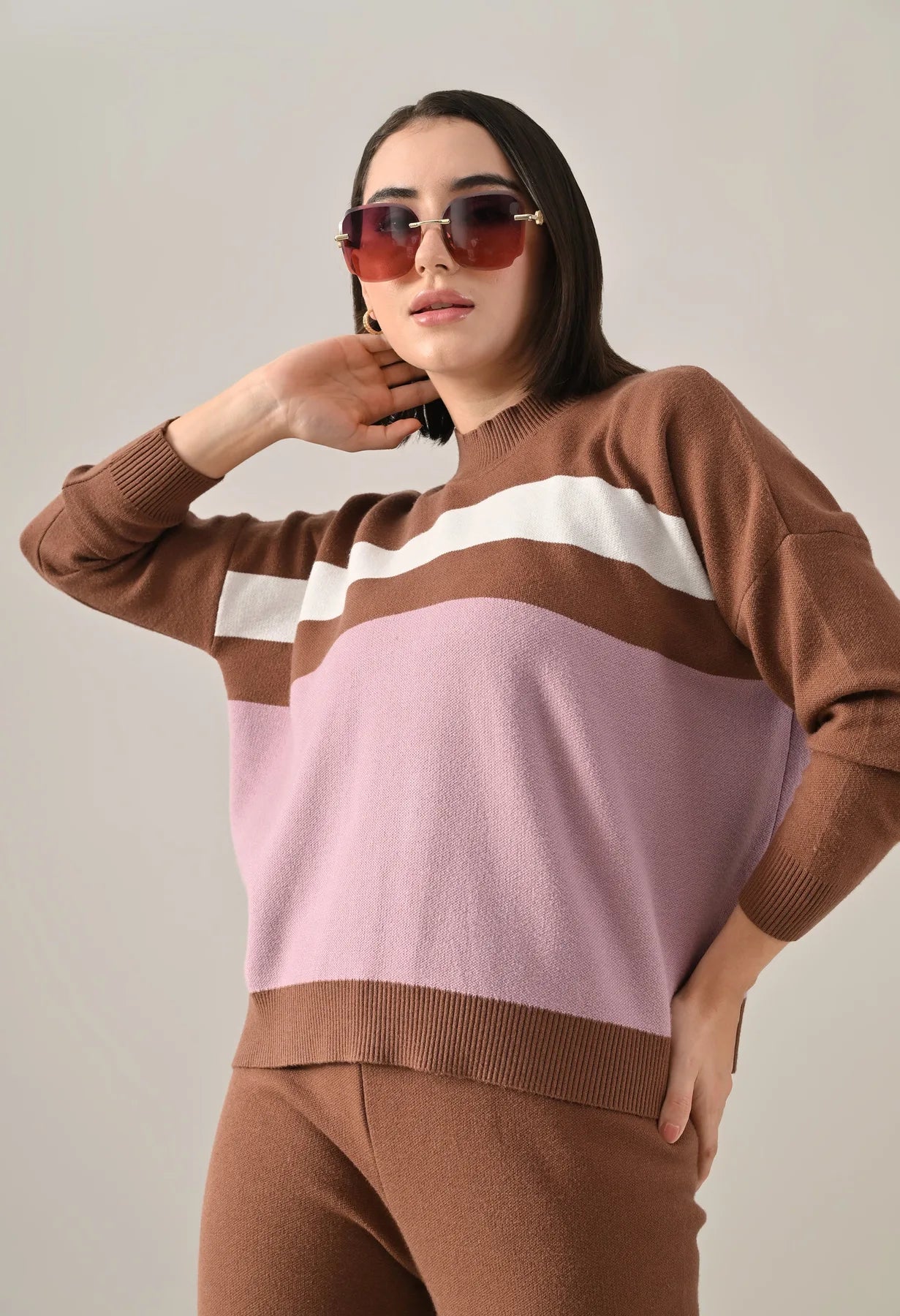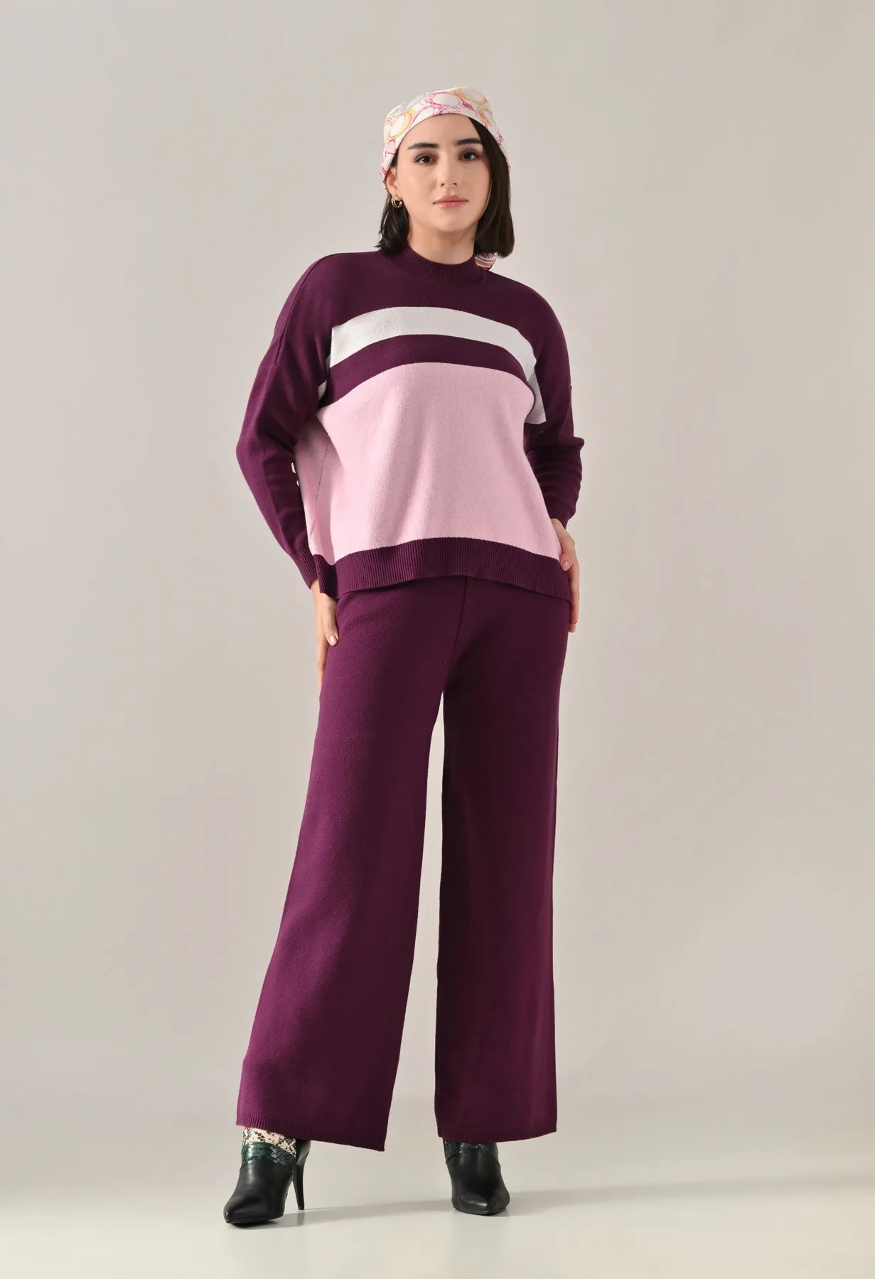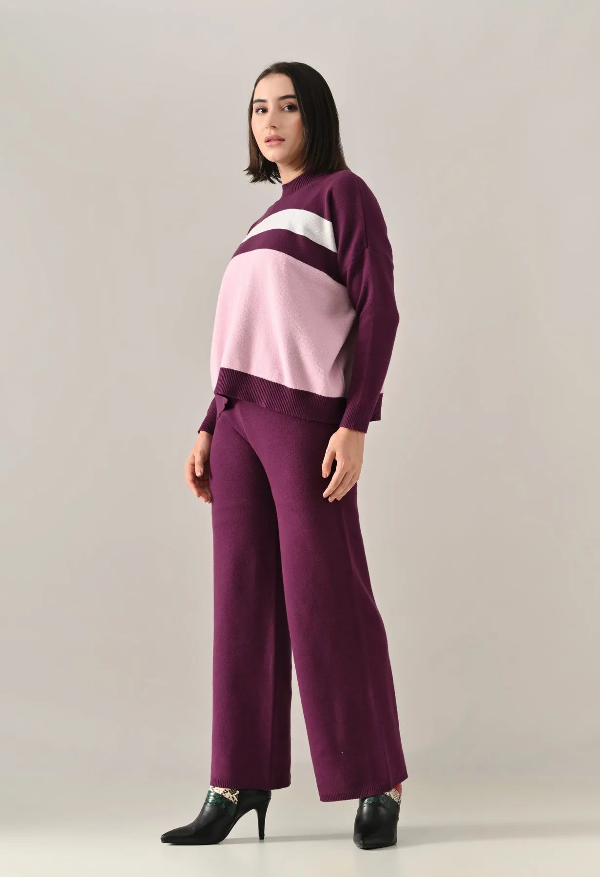 A trendy stripe knitted co-ord set featuring a mock neck with rib detailing, short Length, baggy loose-fit style with full sleeves. The top showcases a stripe pattern at the front with a regular ribbed hem for a structured finish. Paired with straight solid lower designed with a broad elasticated waist. Crafted from soft, comfortable, and stretchable fabric, this set combines cozy texture with modern design for effortless everyday style.