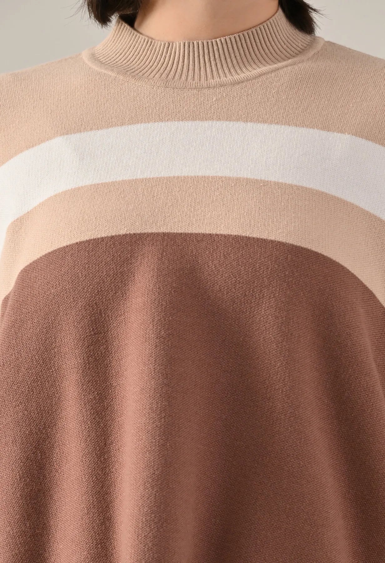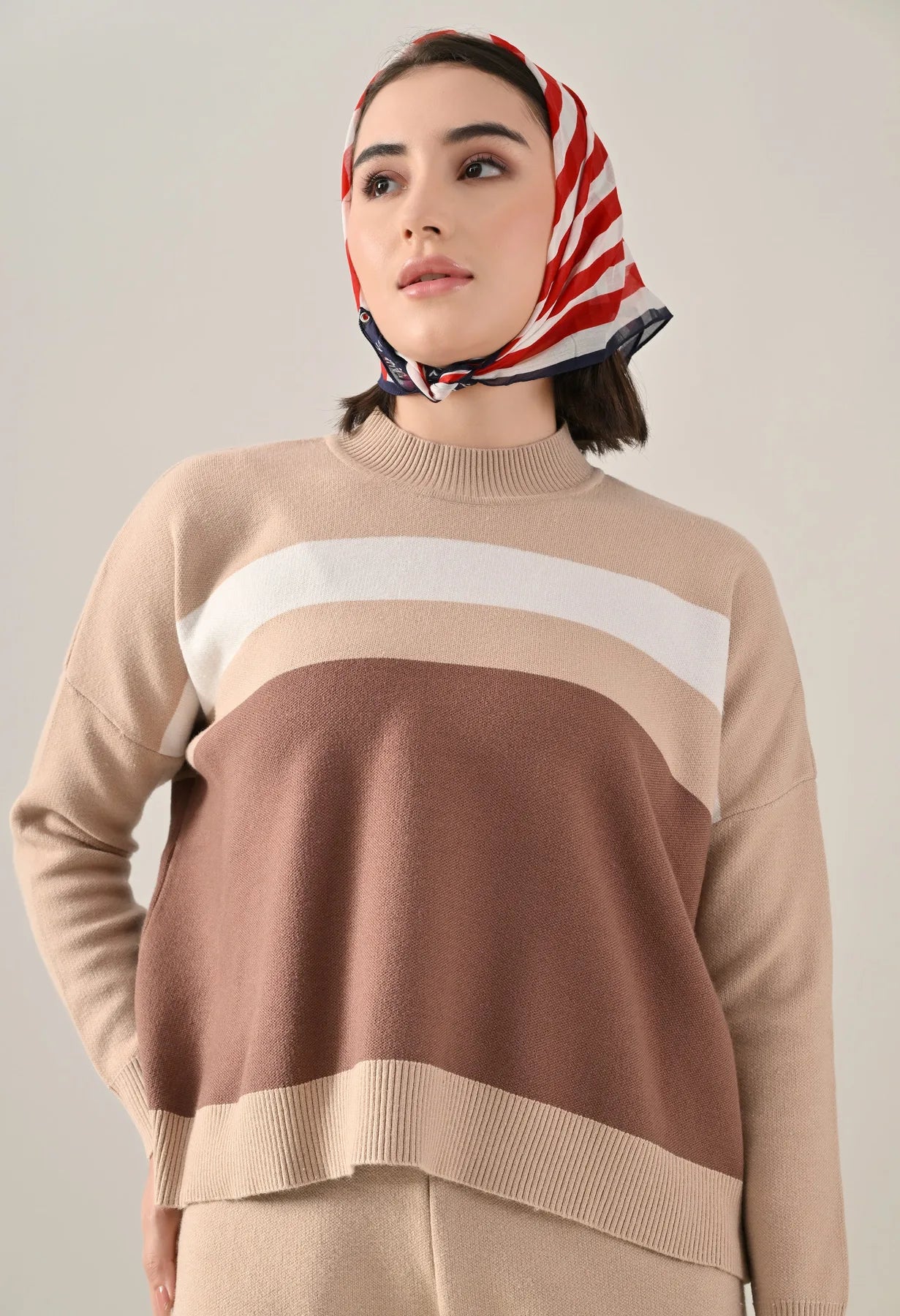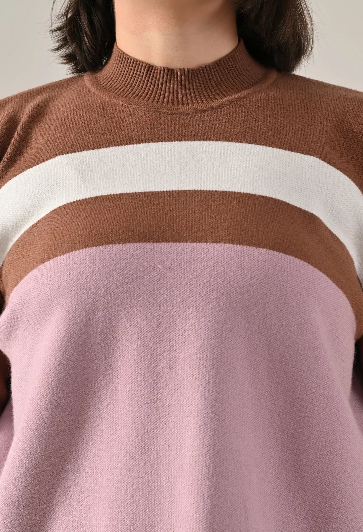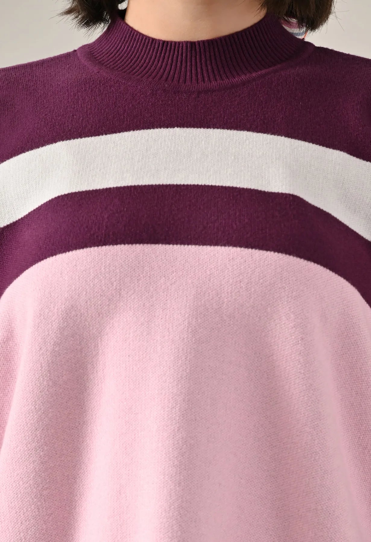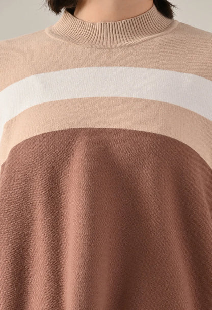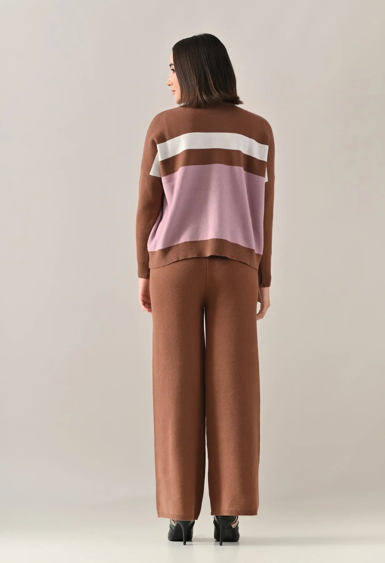 A trendy stripe knitted co-ord set featuring a mock neck with rib detailing, short Length, baggy loose-fit style with full sleeves. The top showcases a stripe pattern at the front with a regular ribbed hem for a structured finish. Paired with straight solid lower designed with a broad elasticated waist. Crafted from soft, comfortable, and stretchable fabric, this set combines cozy texture with modern design for effortless everyday style.