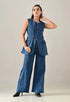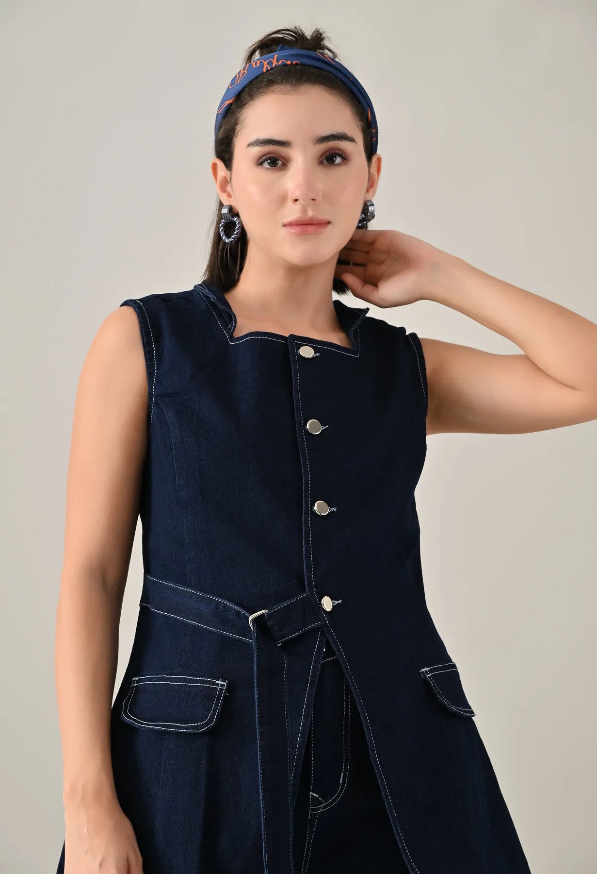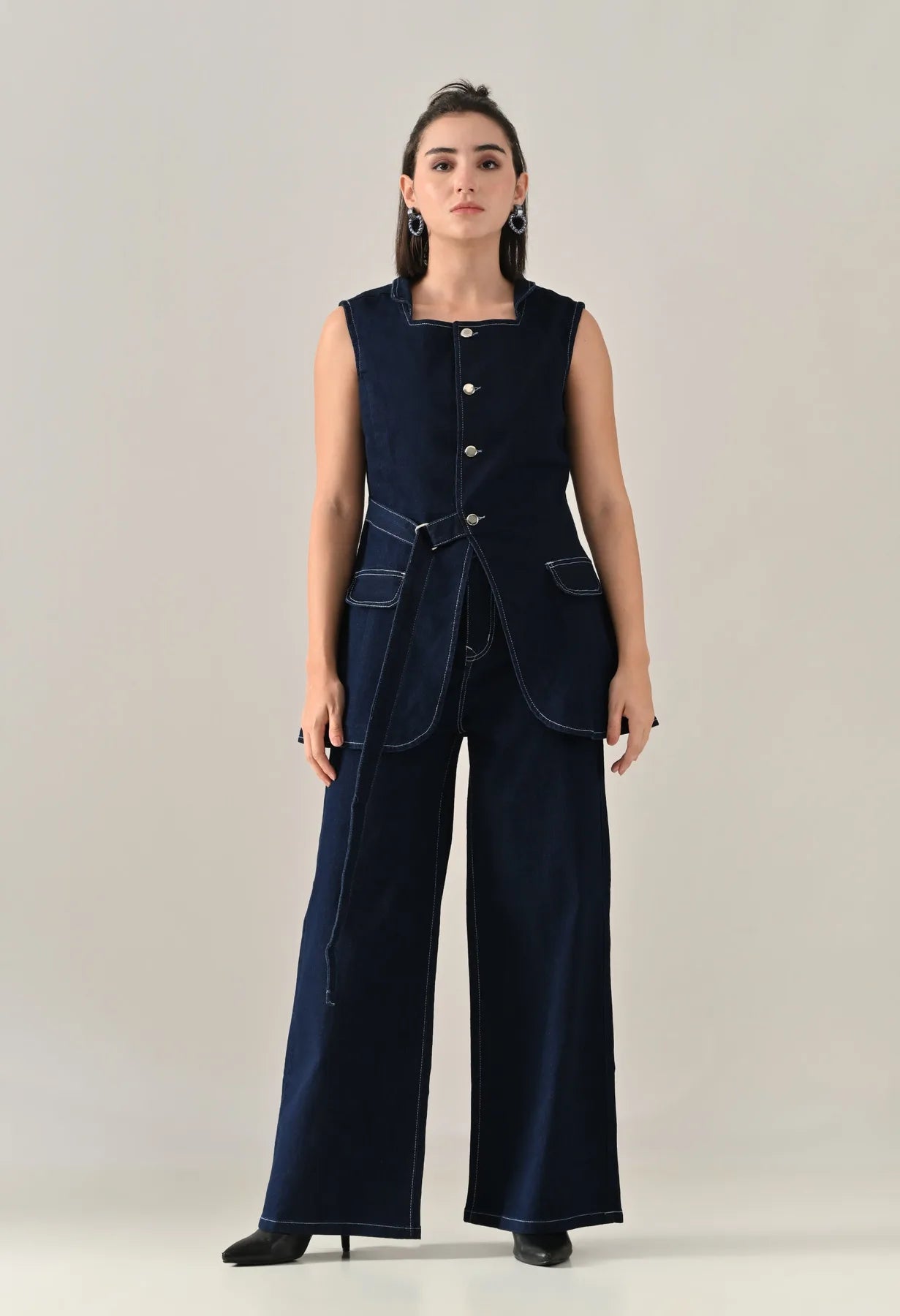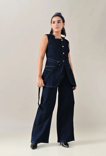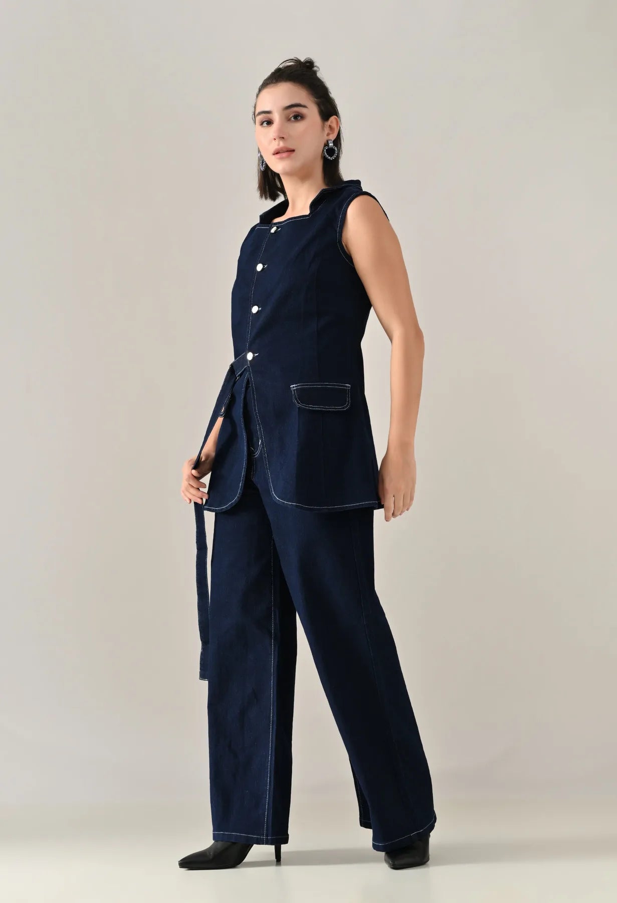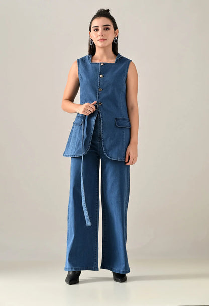 A stylish enzyme-wash denim cord set featuring a straight neckline with band collar and sleeveless design for a clean, structured look. The top includes an open front with eye kaaj and silver button, adjustable front strap, and two showy pocket flaps that add a utilitarian charm. Designed with princess seams at front and back for a flattering fit. The coordinating bottoms feature a waistband with open fly and zipper, silver rivets and shank button, five belt loops, and functional pockets including two front, two back, and one coin pocket. Finished with contrast stitching details, this set offers a soft, comfortable, and stretchable feel — blending classic denim texture with modern appeal.