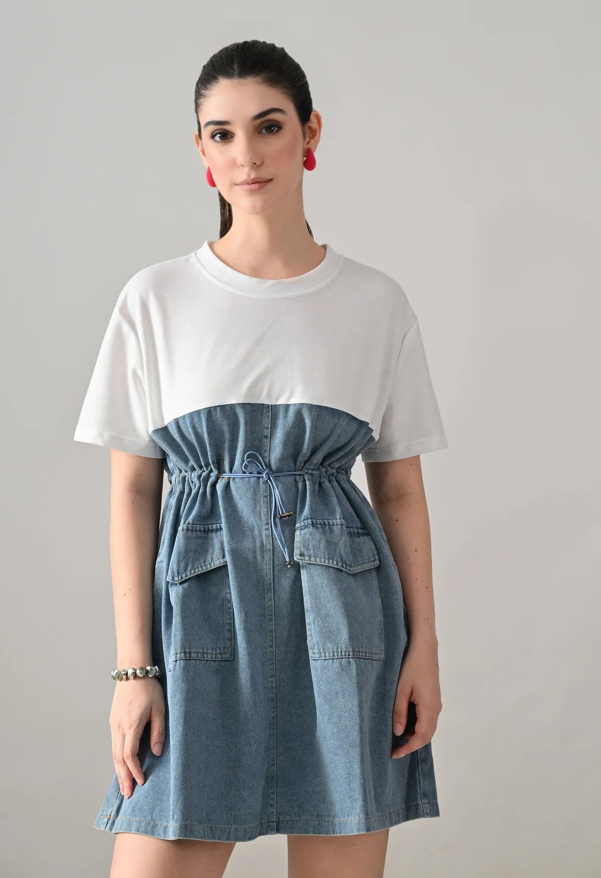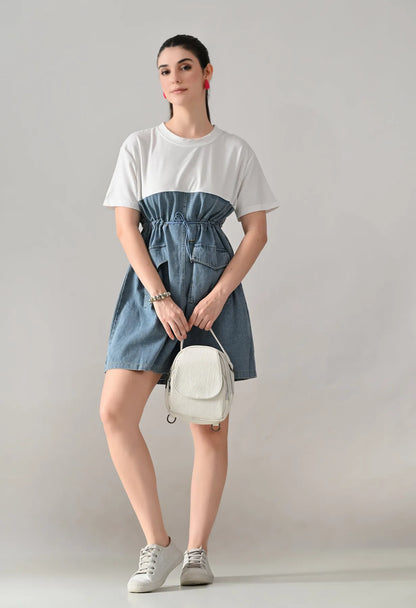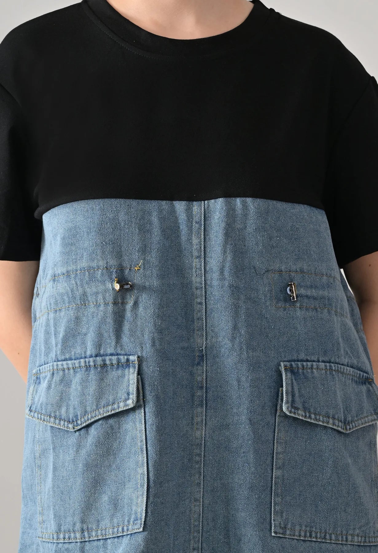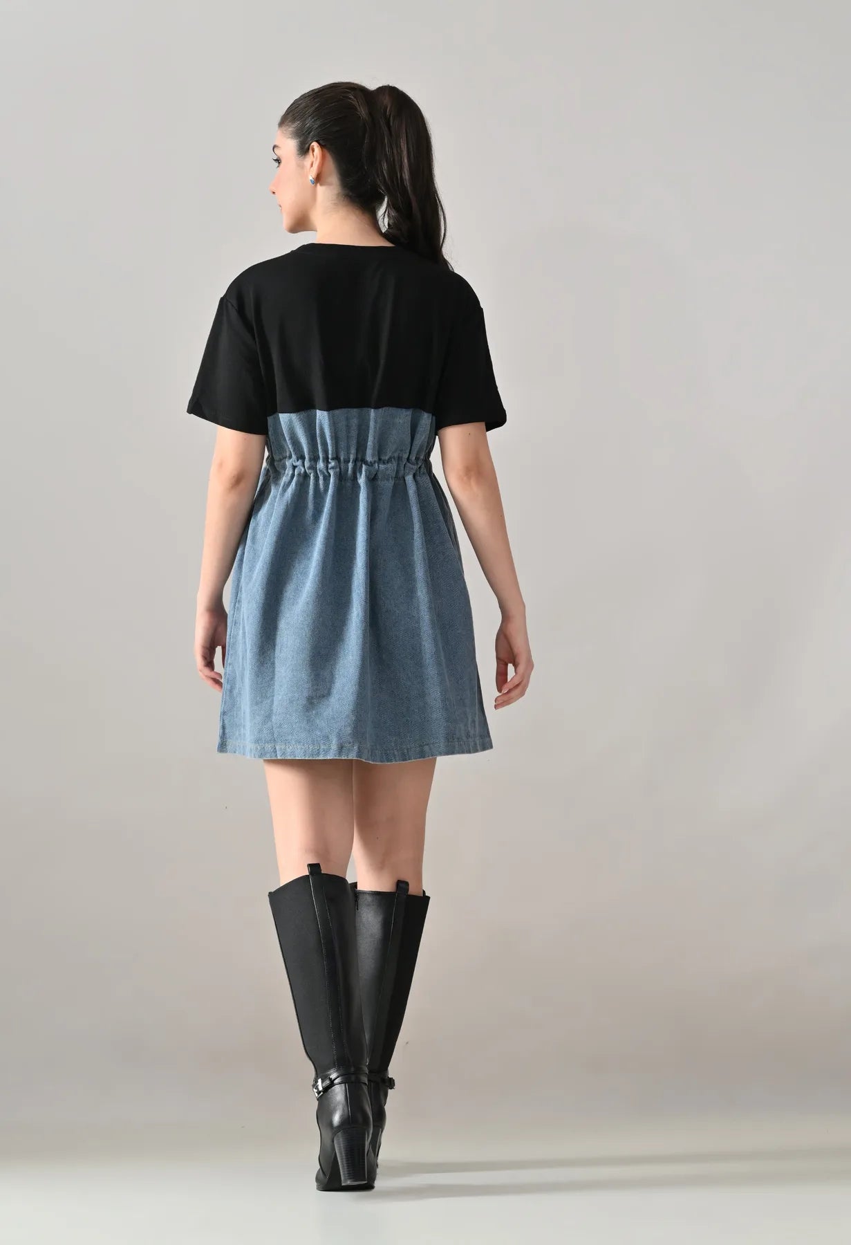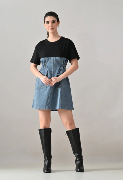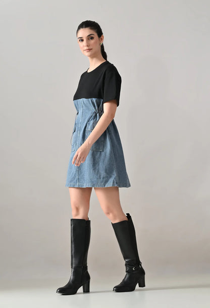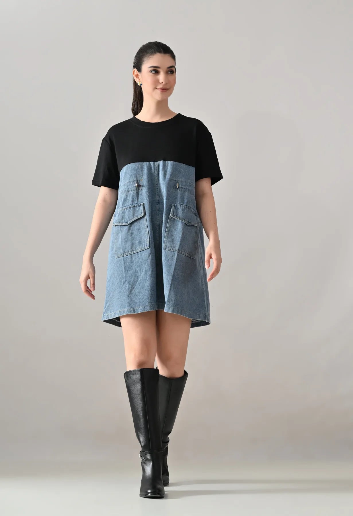 A stylish dual-tone denim dress that combines a stretchable black top panel with a structured denim bottom. Featuring a round neckline, short sleeves, and a slight A-line fit, it’s designed with an elasticated waist for size adjustment and front flap patch pockets for a utility-chic look. Crafted in non-stretch denim for durability, this short-length dress blends casual comfort with everyday fashion.