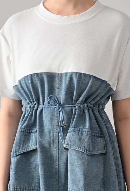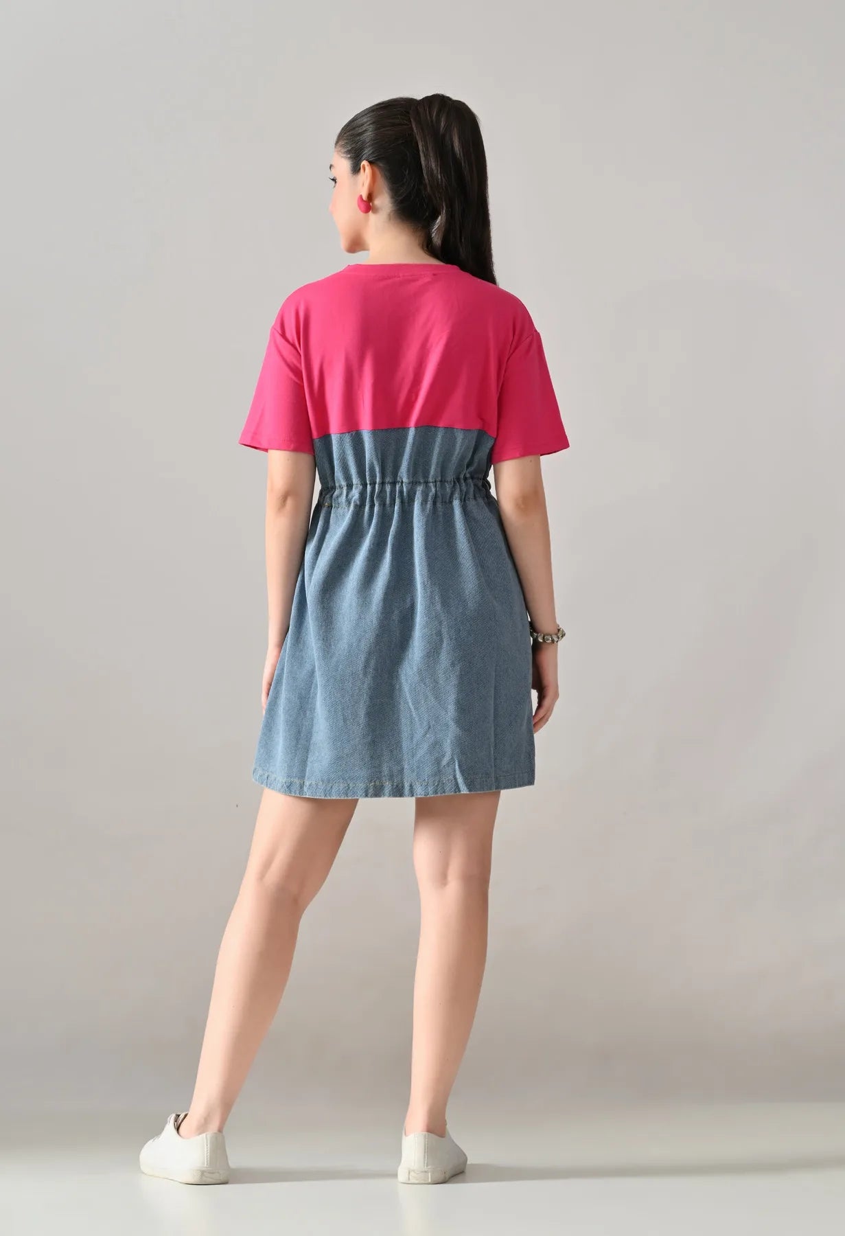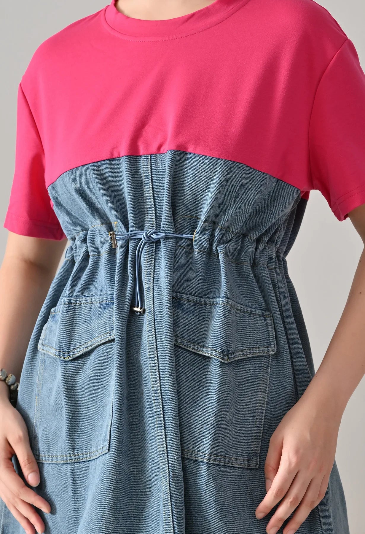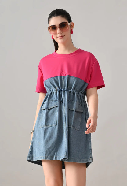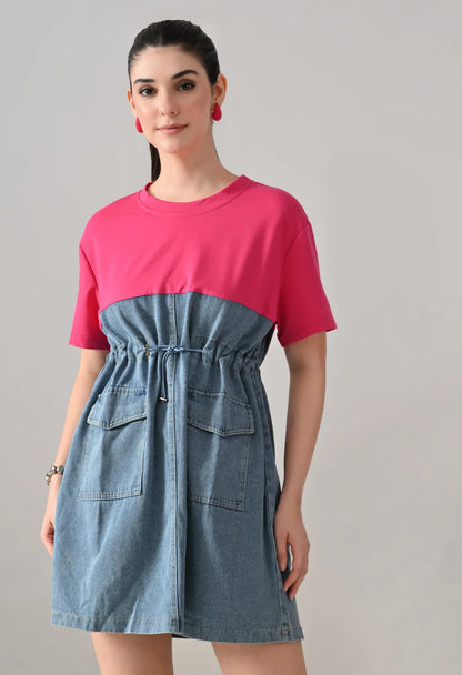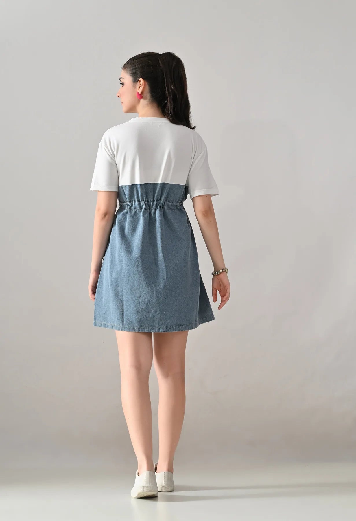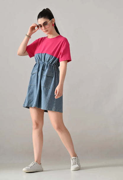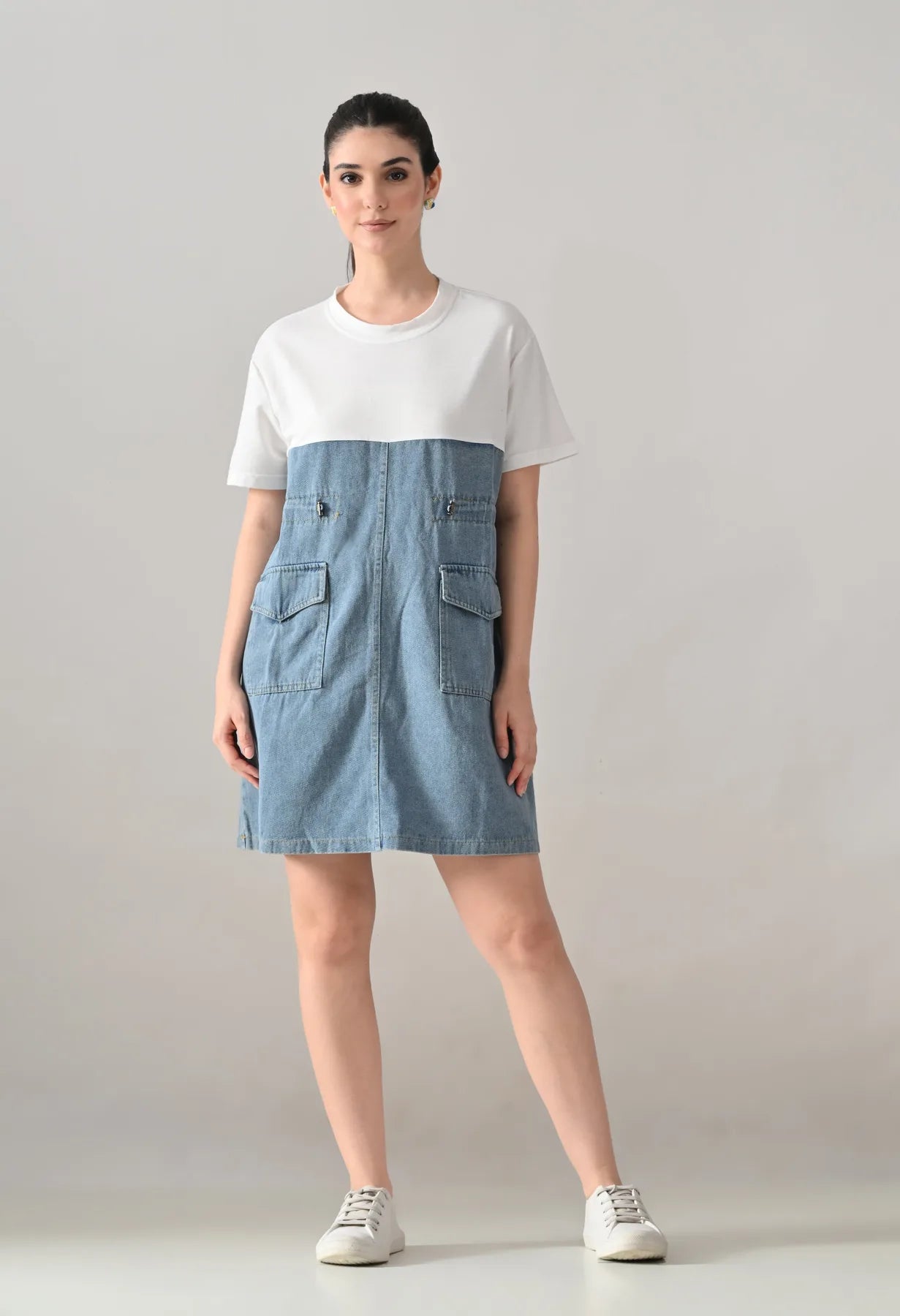 A stylish dual-tone denim dress that combines a stretchable black top panel with a structured denim bottom. Featuring a round neckline, short sleeves, and a slight A-line fit, it’s designed with an elasticated waist for size adjustment and front flap patch pockets for a utility-chic look. Crafted in non-stretch denim for durability, this short-length dress blends casual comfort with everyday fashion.