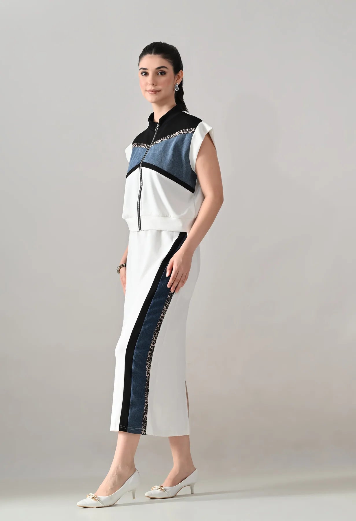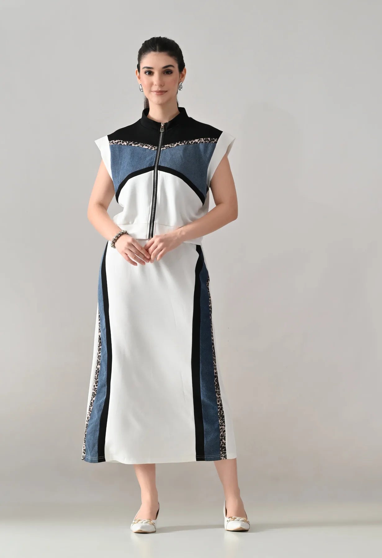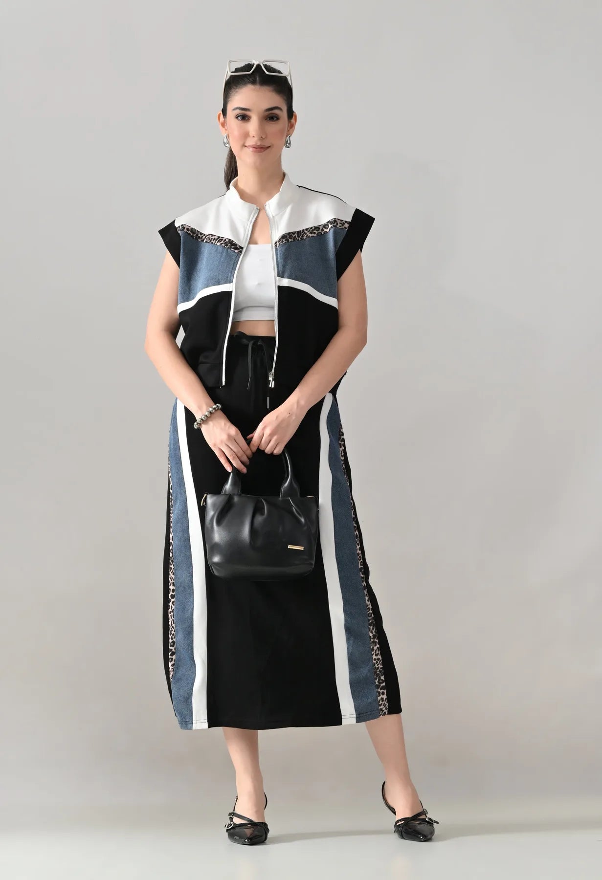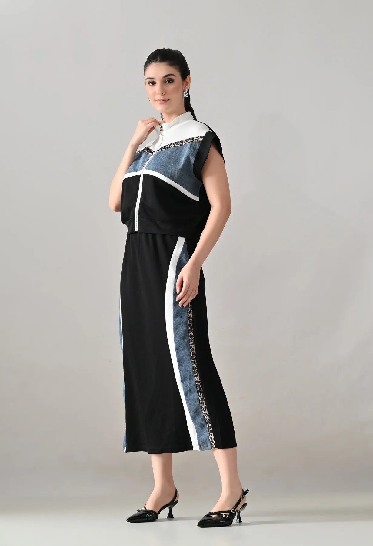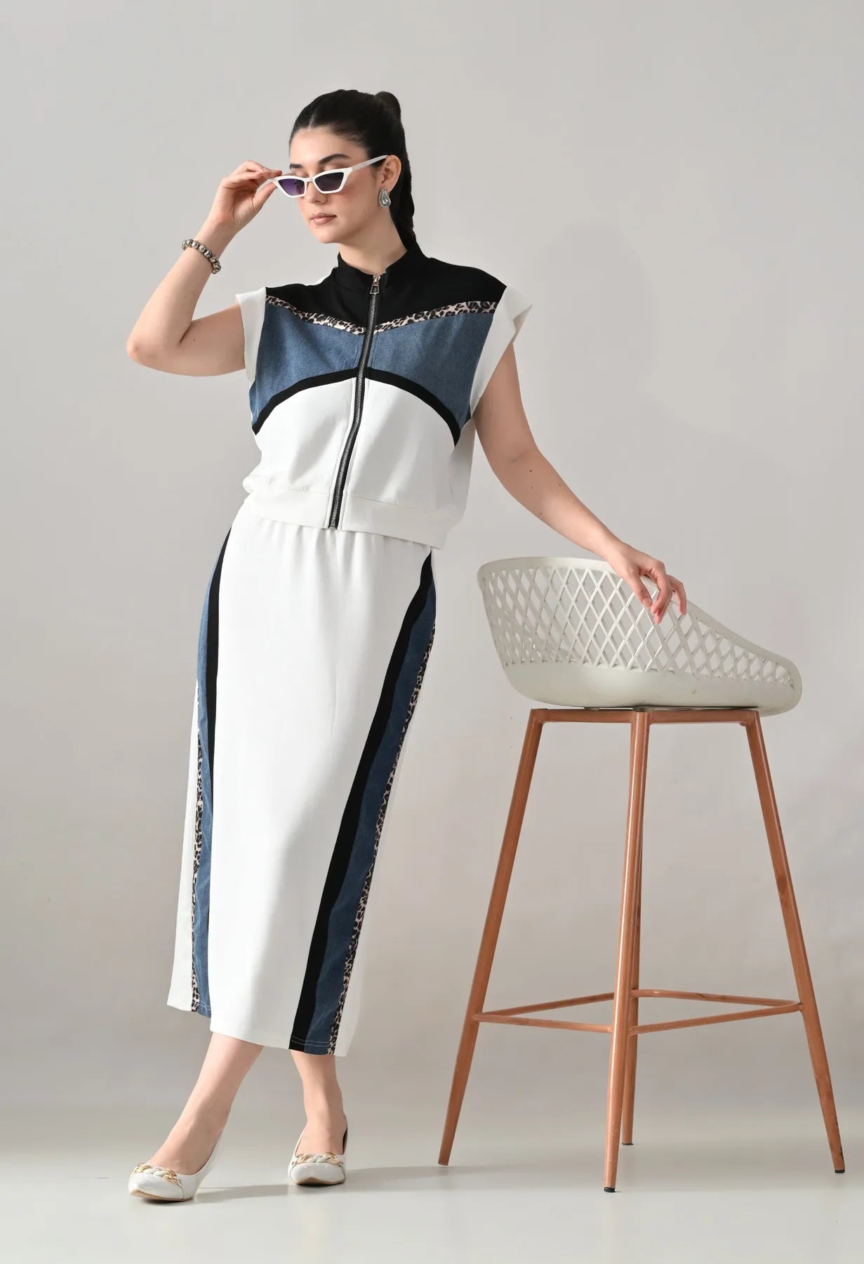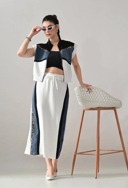 Make a bold statement in this edgy denim co-ord set, designed with striking paneled detailing and sharp white piping. The sleeveless zip-up crop top pairs effortlessly with the high-waist skirt, creating a sleek and elongating silhouette. Perfect for modern, fashion-forward looks with a daring twist.