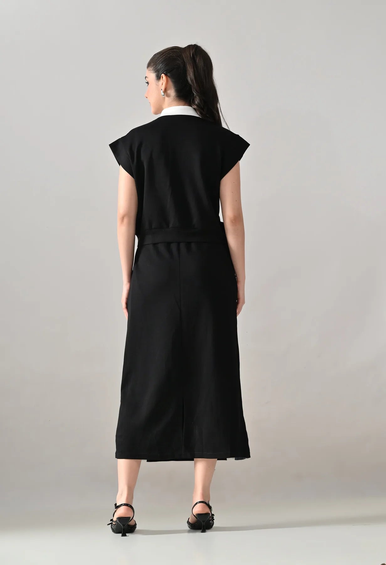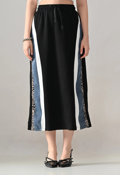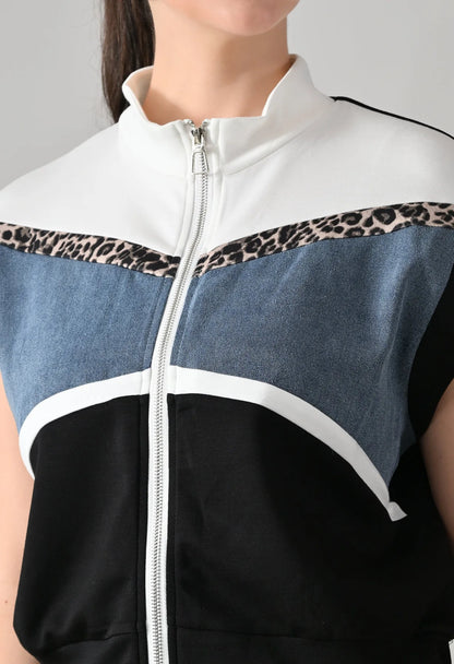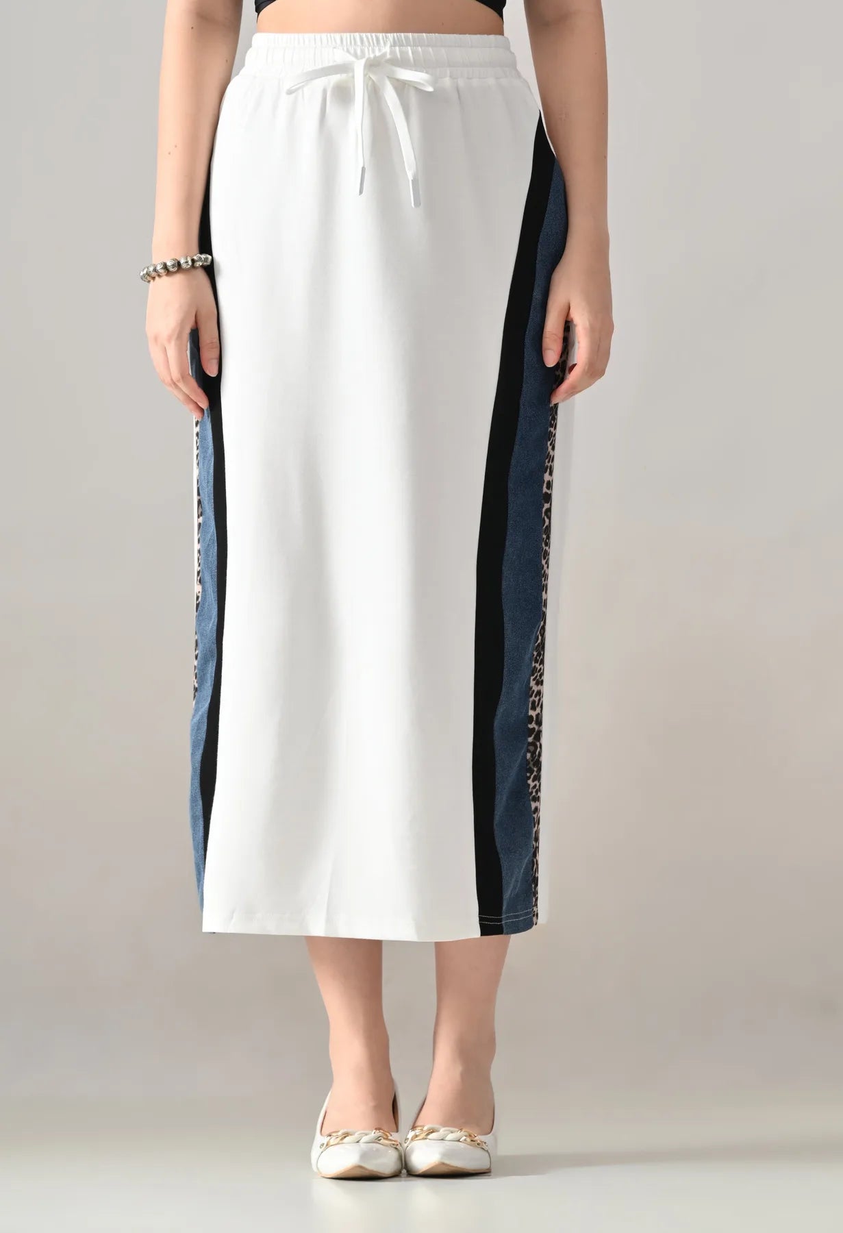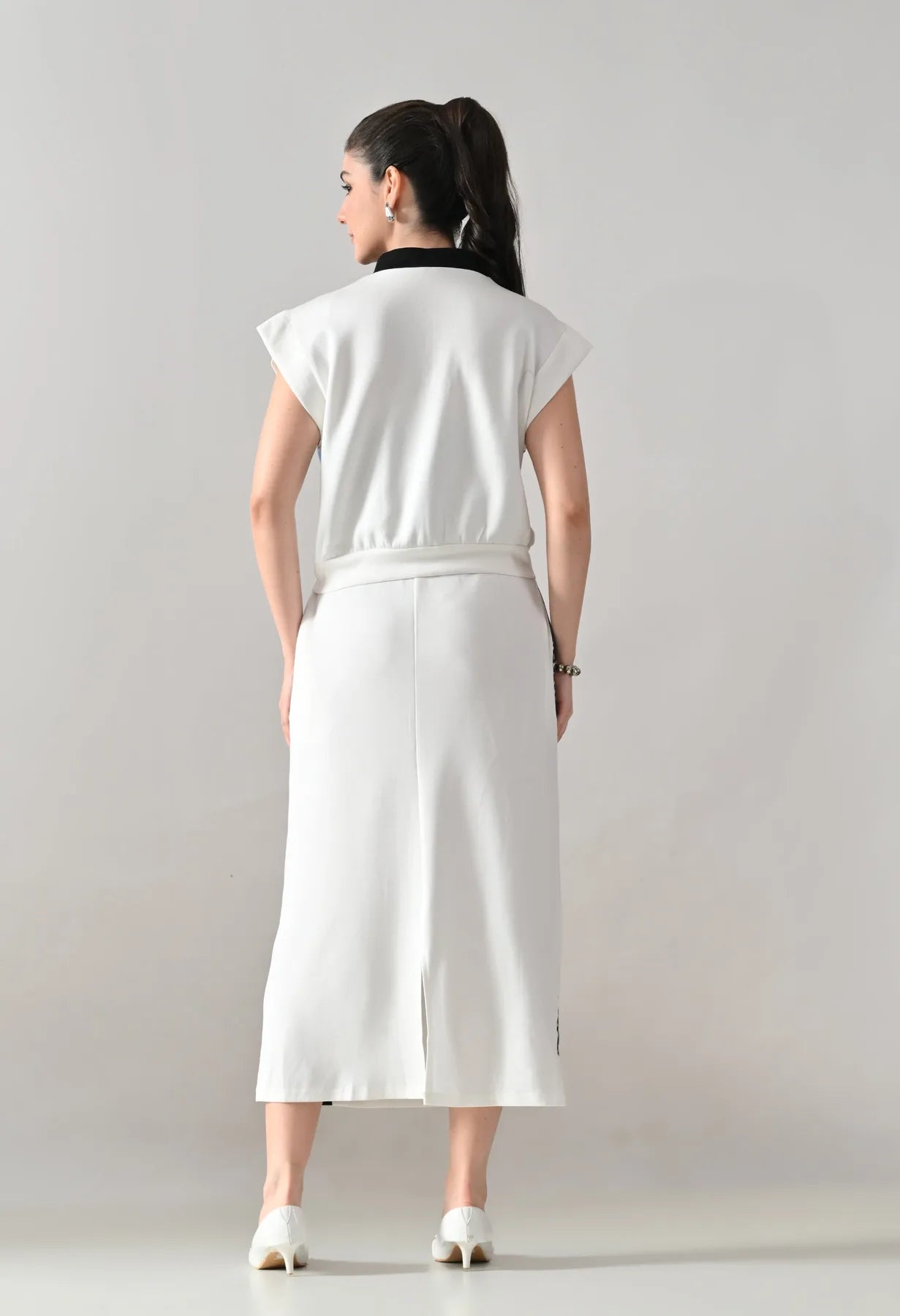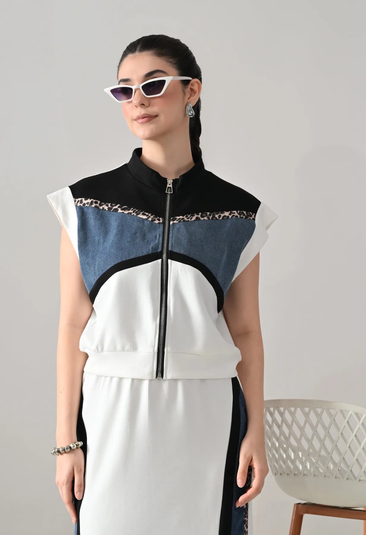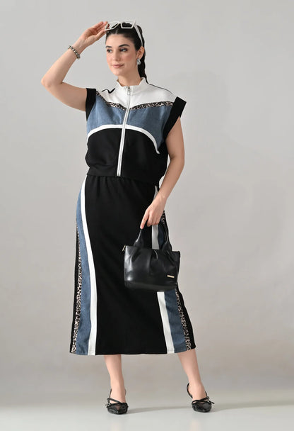 Make a bold statement in this edgy denim co-ord set, designed with striking paneled detailing and sharp white piping. The sleeveless zip-up crop top pairs effortlessly with the high-waist skirt, creating a sleek and elongating silhouette. Perfect for modern, fashion-forward looks with a daring twist.