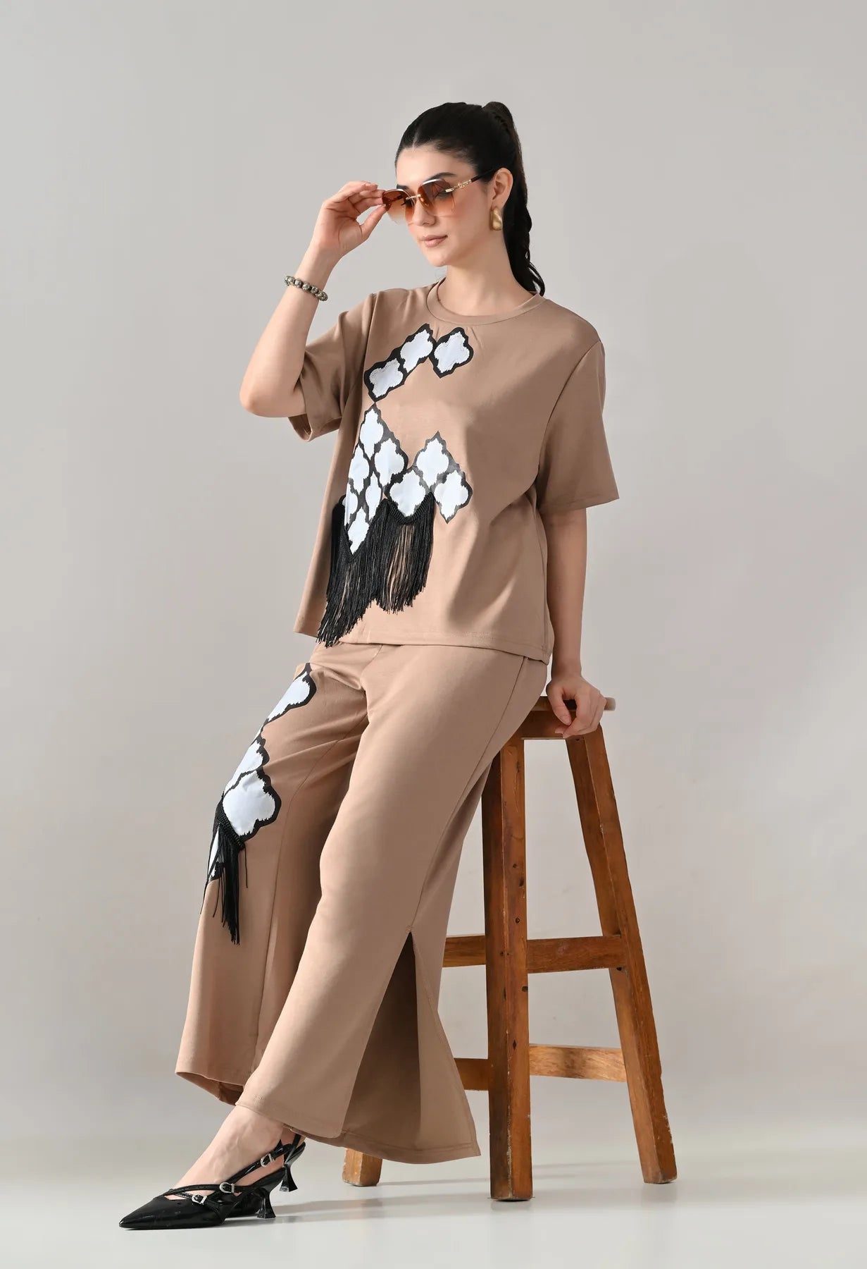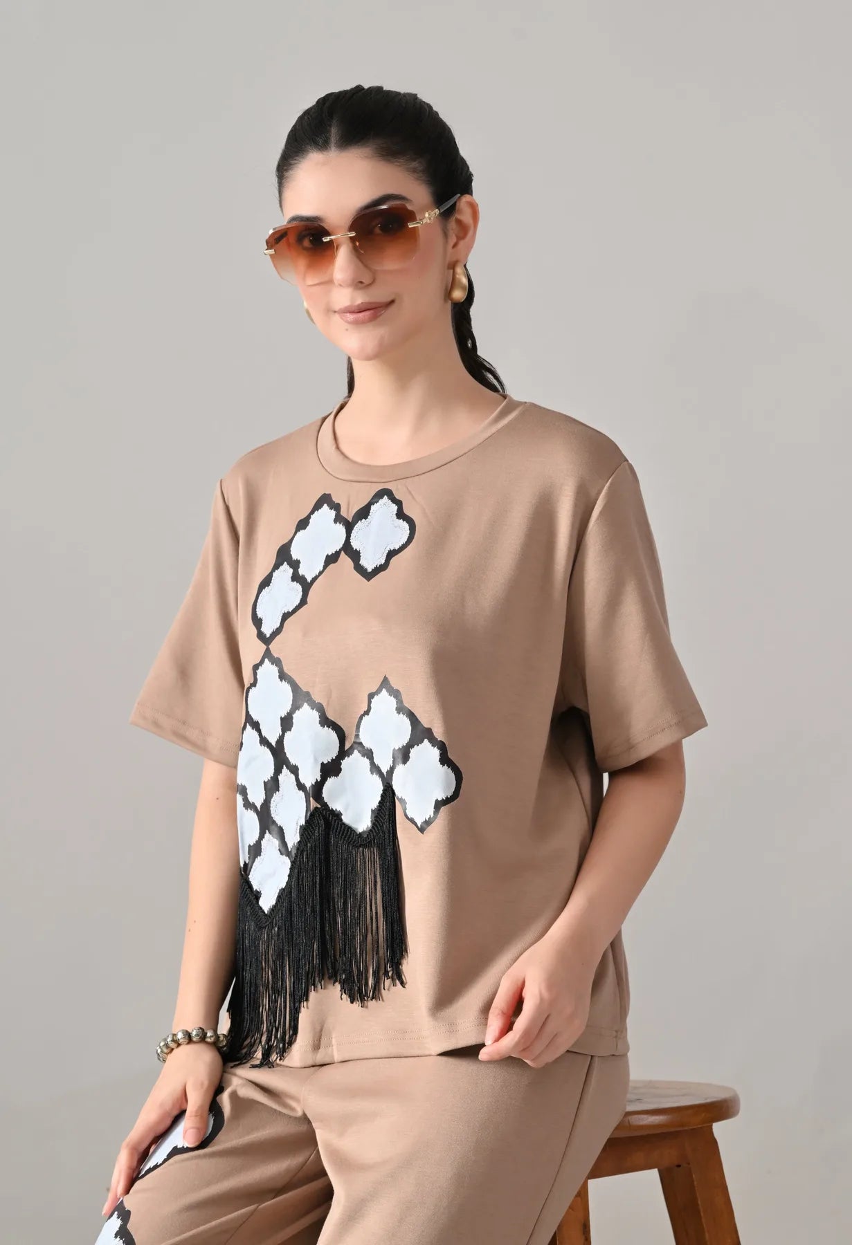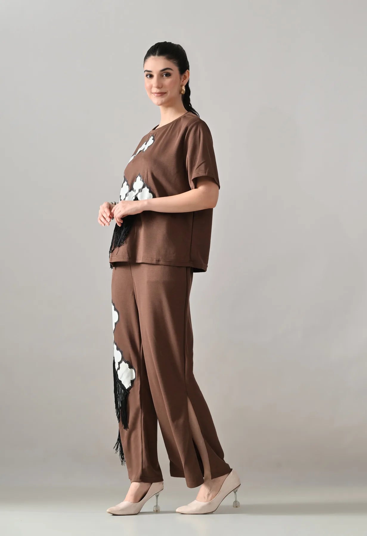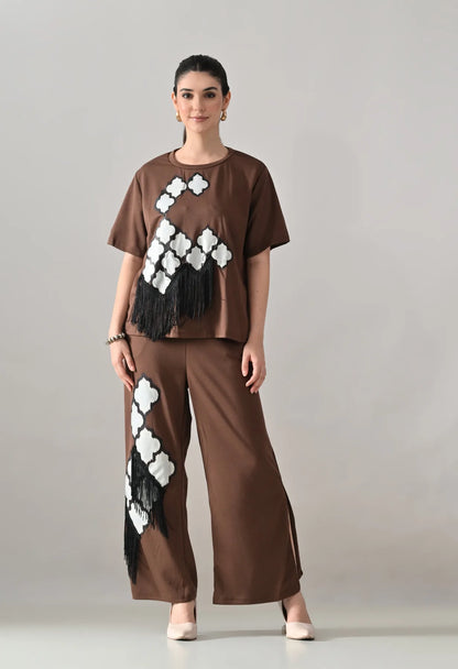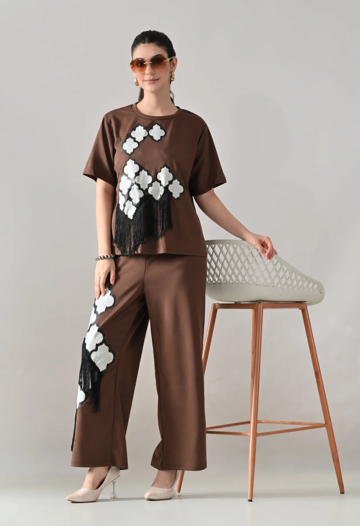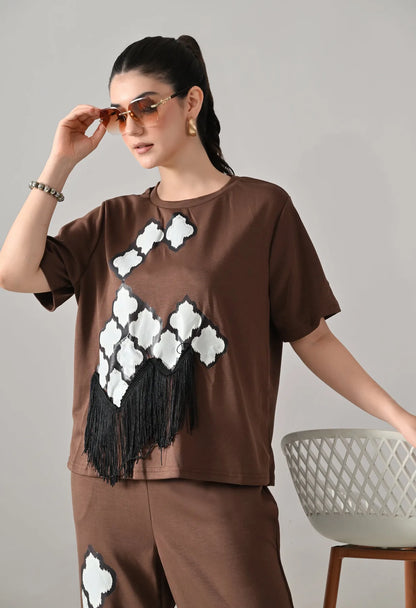 Turn heads in this mocha brown fringed co-ord set, designed with bold clover applique motifs and playful fringe accents. Featuring a relaxed-fit t-shirt and straight-cut bottoms, it blends comfort with statement style — perfect for brunches, casual evenings, or chic everyday wear.