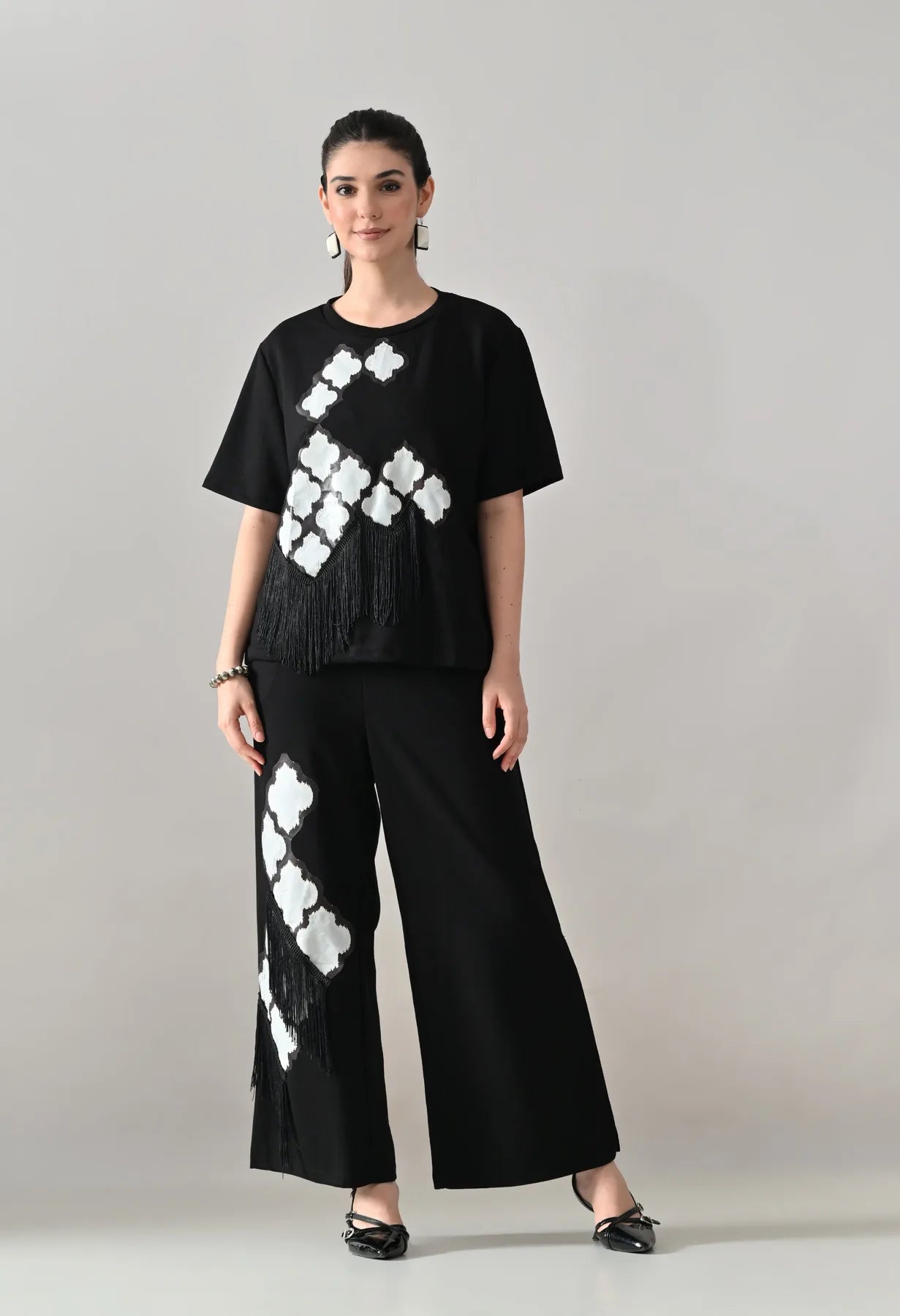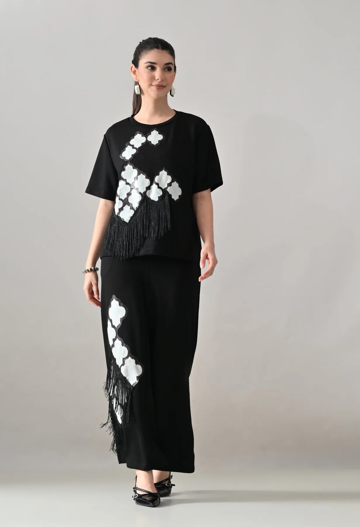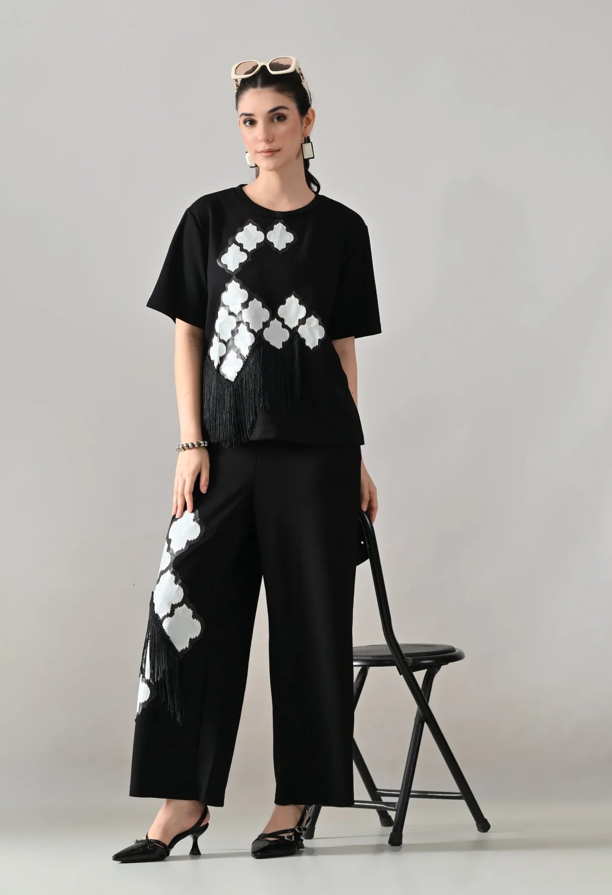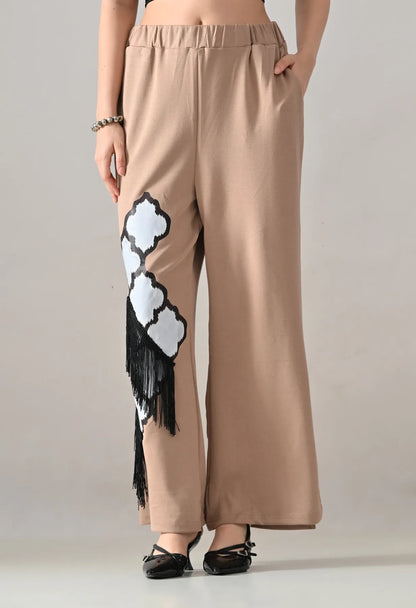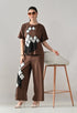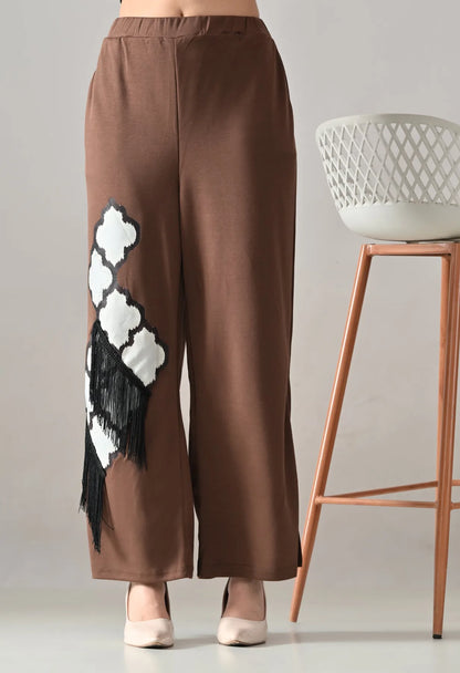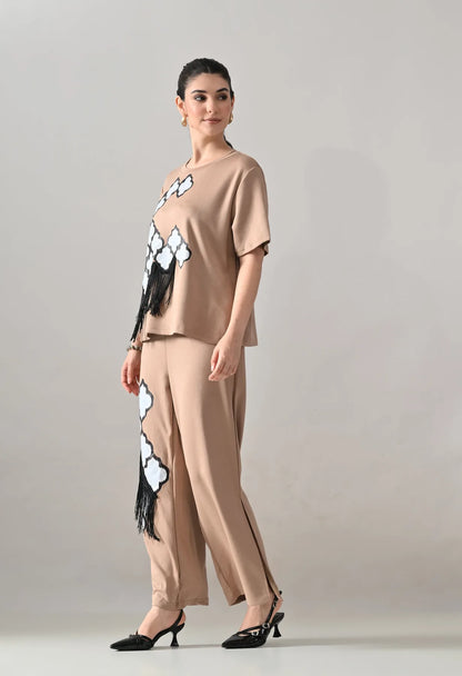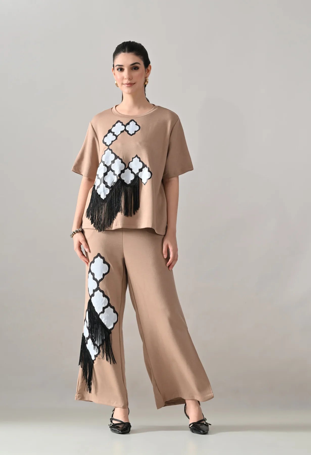 Turn heads in this mocha brown fringed co-ord set, designed with bold clover applique motifs and playful fringe accents. Featuring a relaxed-fit t-shirt and straight-cut bottoms, it blends comfort with statement style — perfect for brunches, casual evenings, or chic everyday wear.