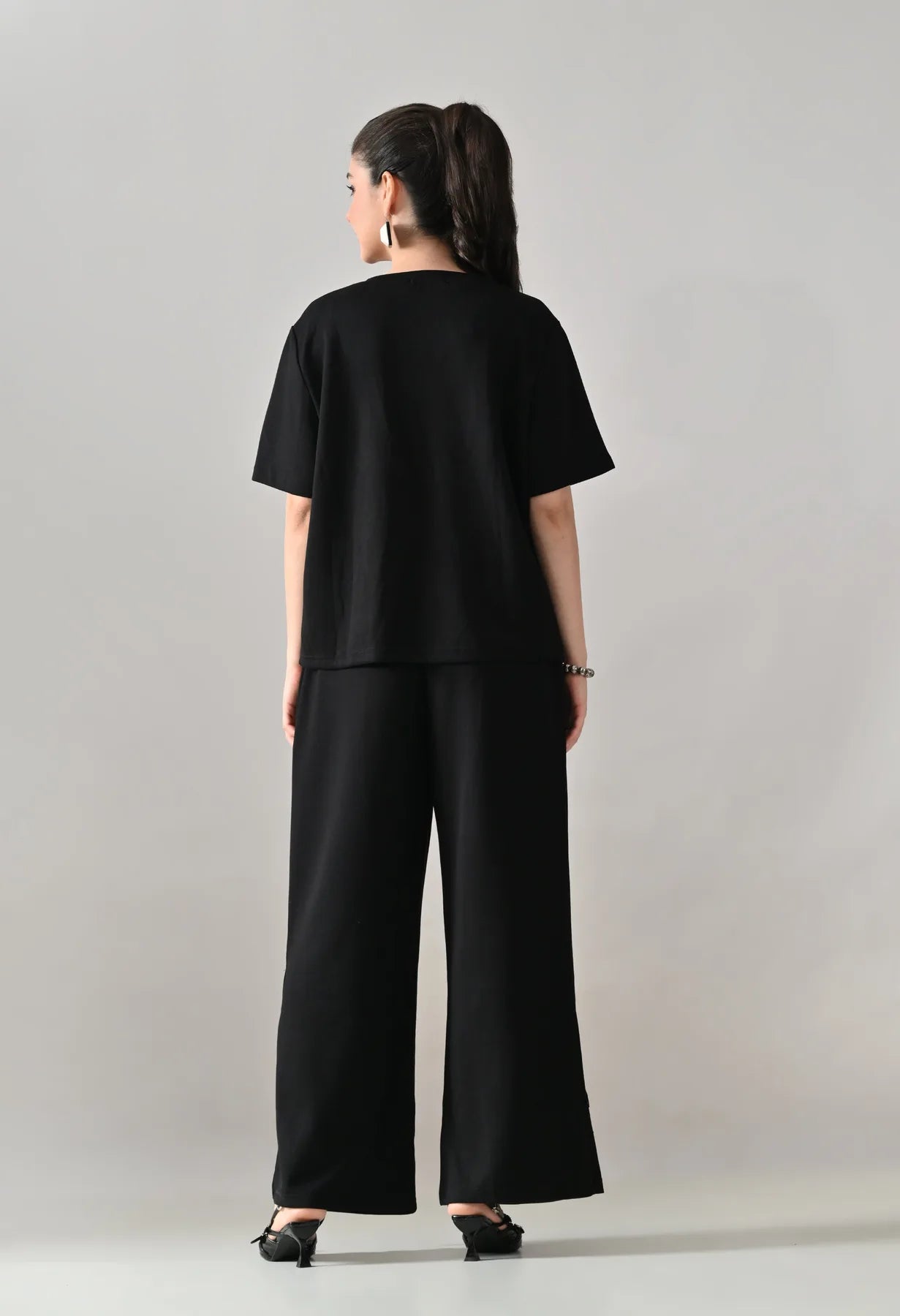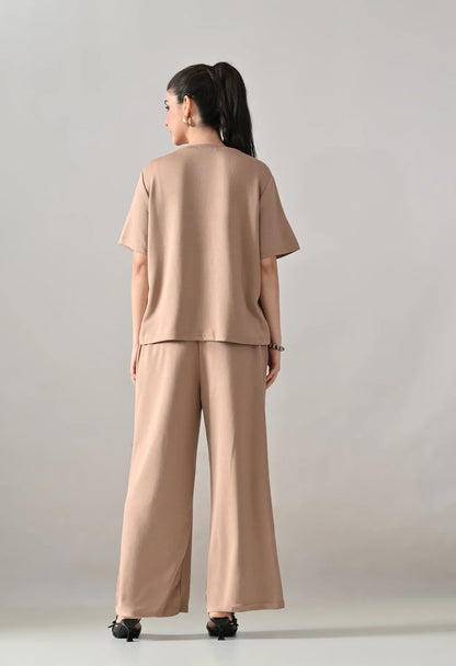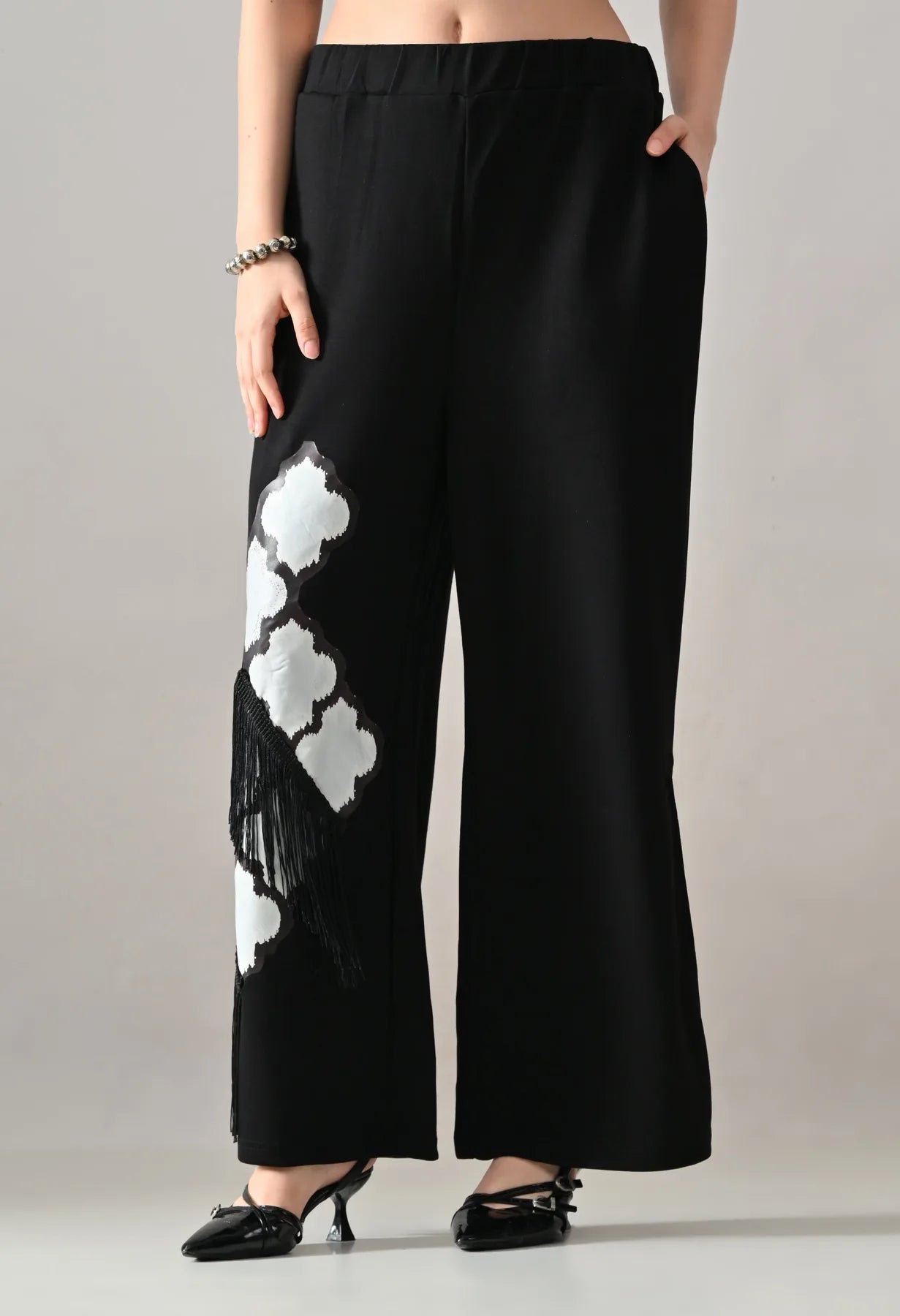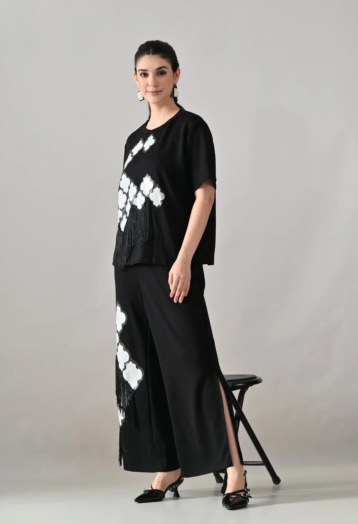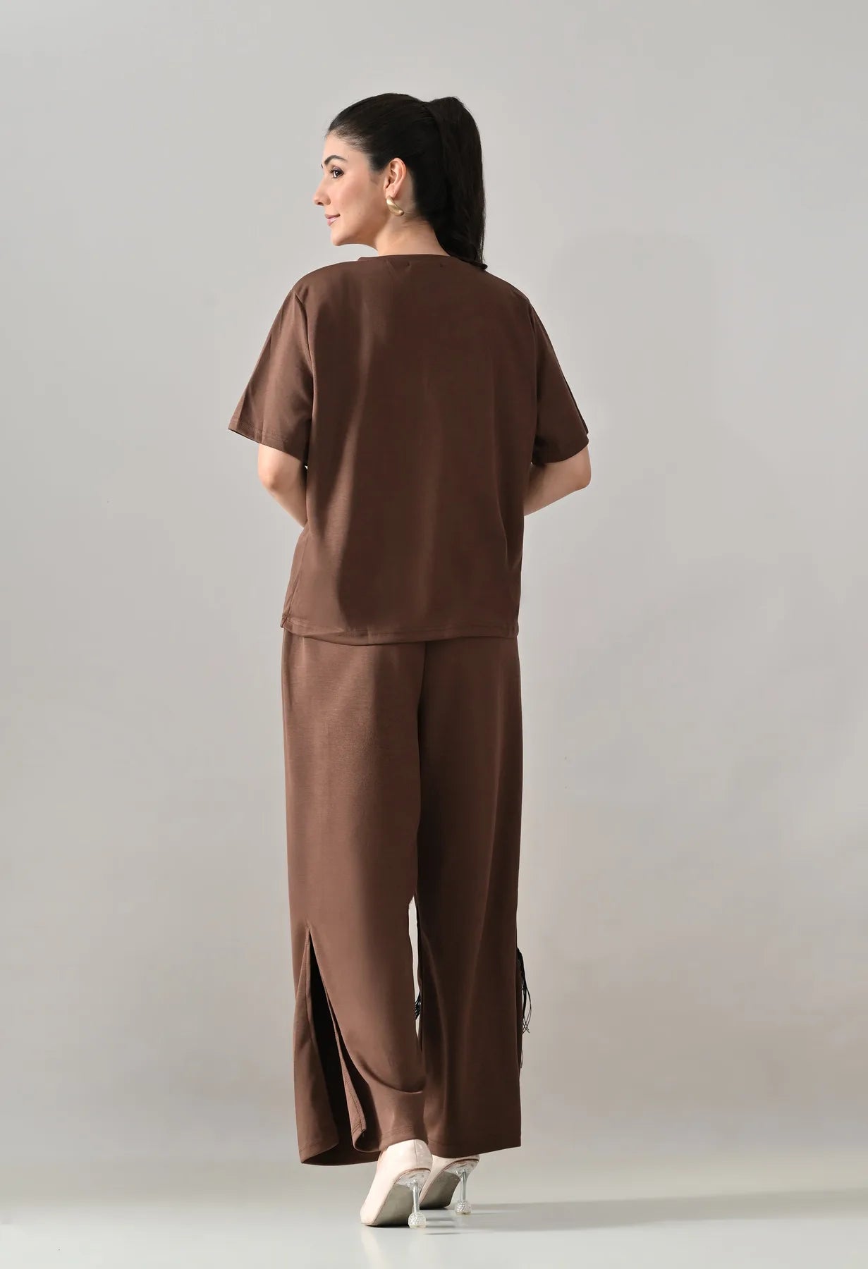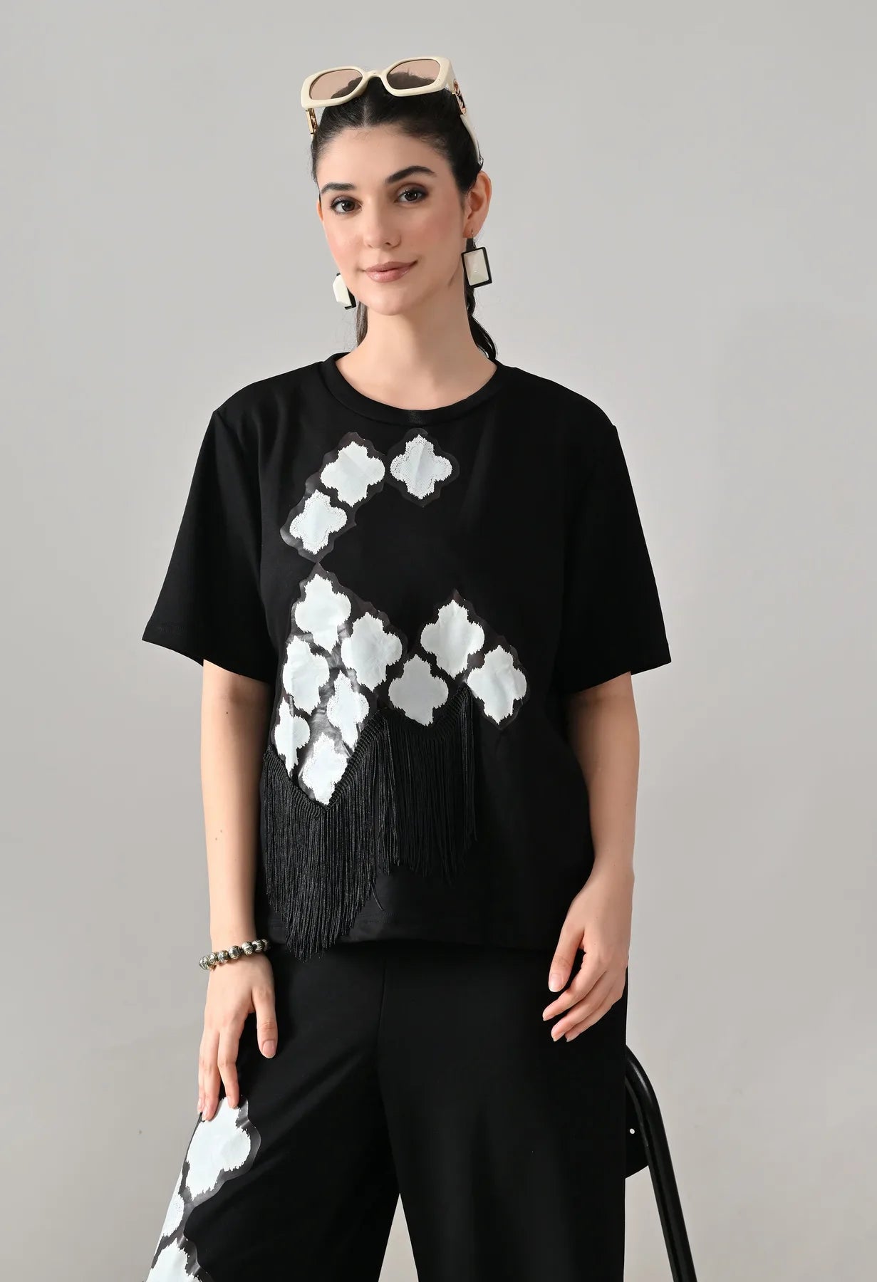 Turn heads in this mocha brown fringed co-ord set, designed with bold clover applique motifs and playful fringe accents. Featuring a relaxed-fit t-shirt and straight-cut bottoms, it blends comfort with statement style — perfect for brunches, casual evenings, or chic everyday wear.