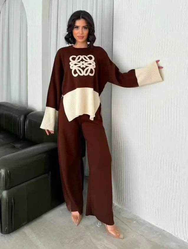 Elevate your style with our chic Colorblock Knitted Two-Piece Set – perfect for autumn and winter. Featuring a round neckline, side-slit top, and elasticated waistband pants, it’s your go-to for casual days, cozy evenings, or holiday lounging