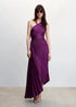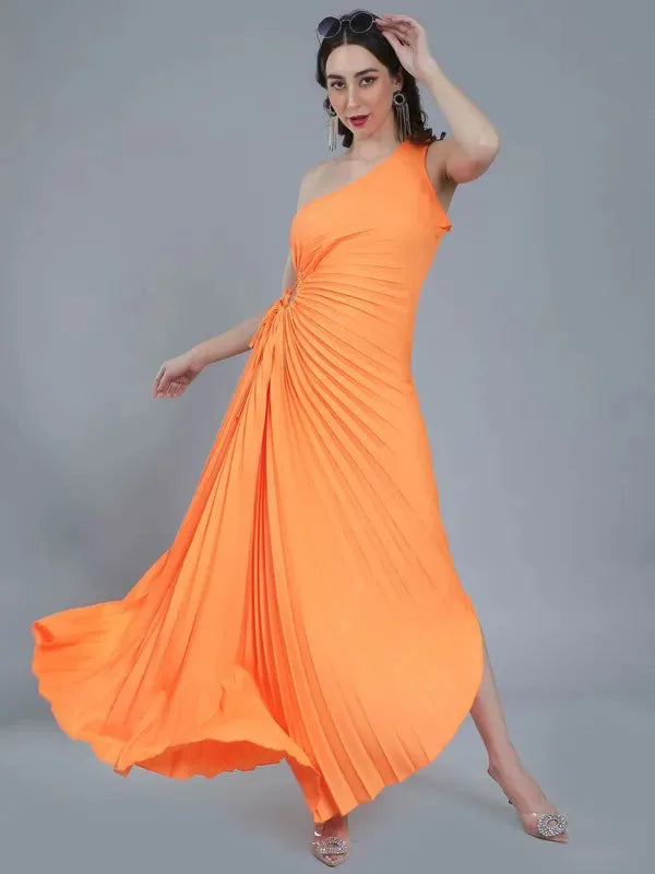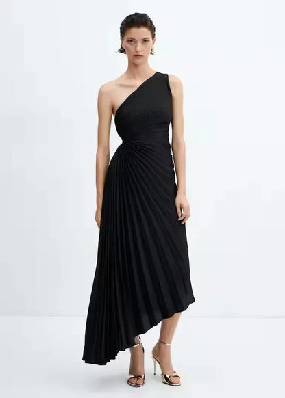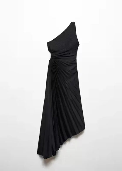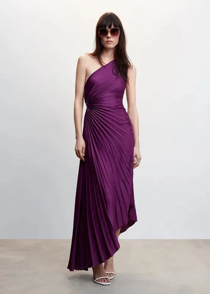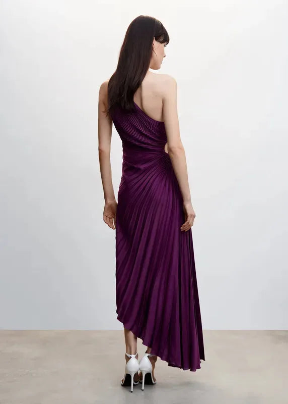 Quality fabric, pleated with a side cutout and one-shouldered neckline lends glamour and a beautiful, draping line to this asymmetric maxi dress.