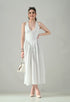 Turn heads in the Graceful Halo Midi Dress, crafted to blend elegance and comfort. Featuring a flattering U-shaped neckline with halter tie-back strings, this sleeveless dress offers a chic and adjustable fit. The bodice is fitted till the waist with soft, lined, stretchable fabric, flowing into a midi-length flared skirt with delicate gathers. Finished in non-stretch fabric below the waist, it adds graceful movement and structure — making it the perfect outfit for both day and evening occasions.