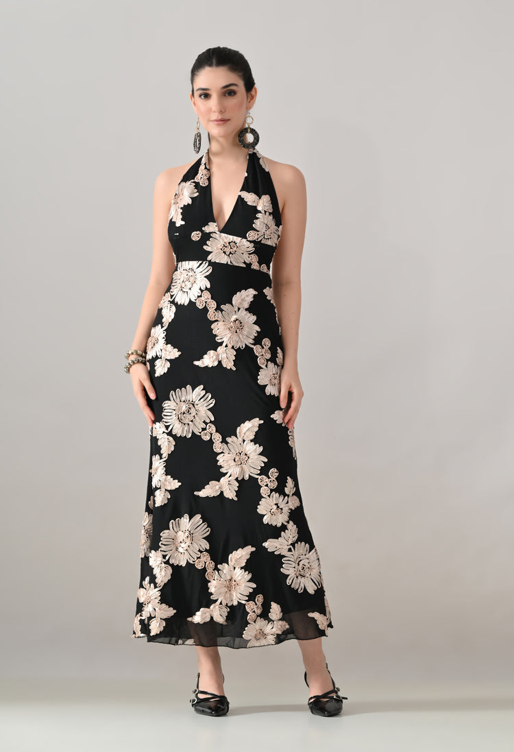 Make an entrance in the Midnight Bloom Halter Maxi, a bold yet elegant silhouette designed for after-dark allure. Crafted in a sleek black base with oversized blush floral motifs, the halter neckline flatters while the fitted waist flows into a graceful, ankle-grazing skirt. It’s a statement of effortless sophistication—perfect for cocktail nights, date dinners, or any moment you want all eyes on you.