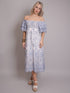 Elevate your style with this elegant off-shoulder embroidered dress, perfect for summer, holidays, and evening wear. Featuring intricate embroidery, a smocked bodice, a flattering midi length, and a chic cut-out detailing at the back for an added touch of allure.