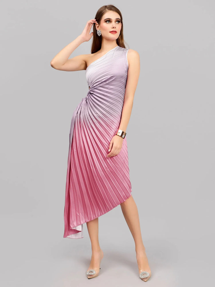 Quality fabric, pleated with a side cutout and one-shouldered neckline lends glamour and a beautiful, draping line to this asymmetric maxi dress.