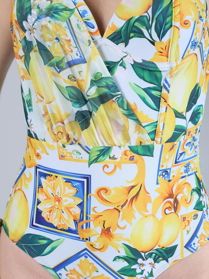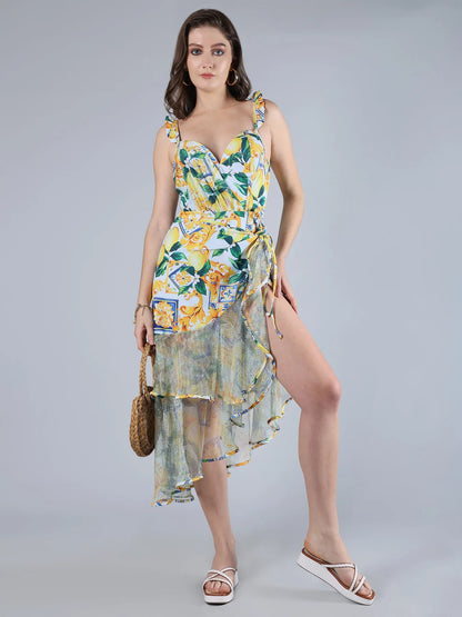Elevate your beachwear with the Paradise Monokini with Sarong, featuring a plunging neckline, pleated straps, and a chic ruffled wrap-around sarong. Designed with slightly padded support and stretchable fabric, it’s perfect for elegant summer and holiday vibes.