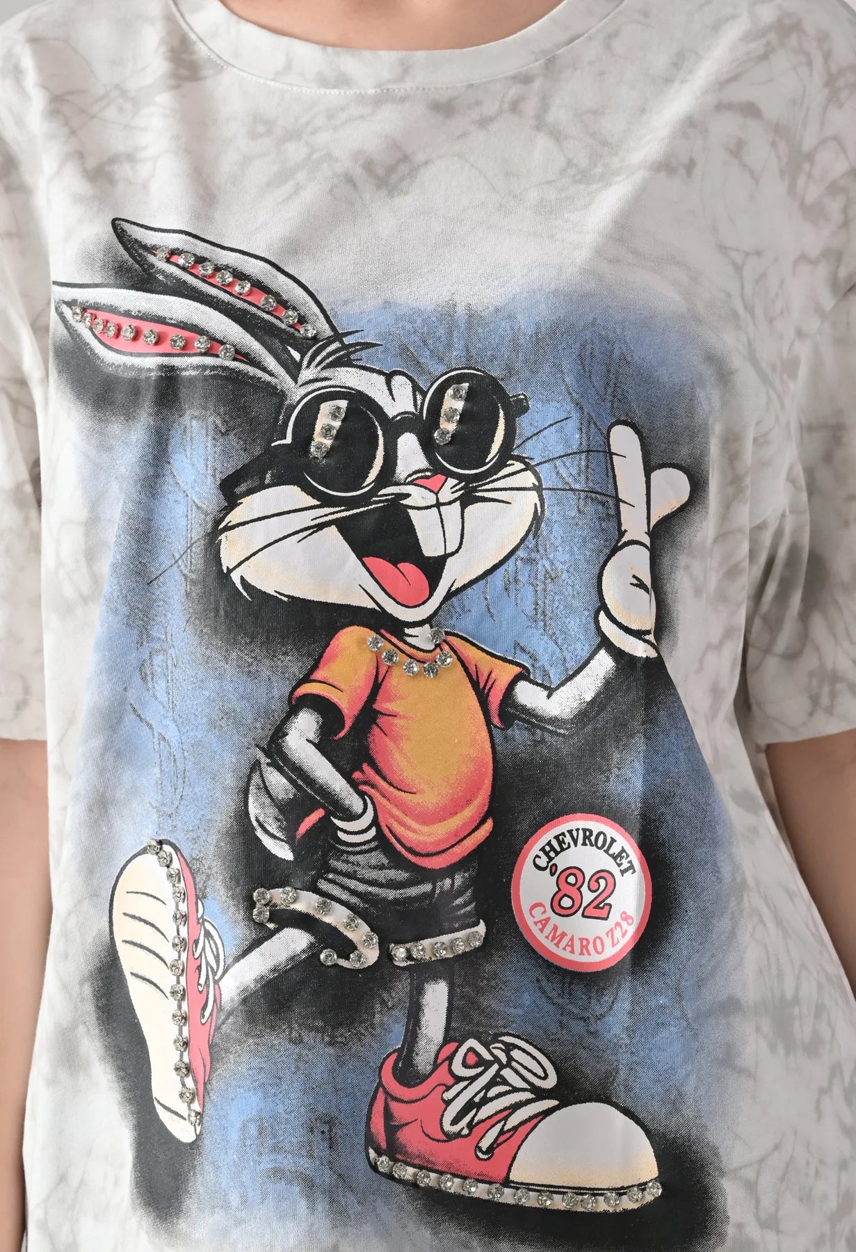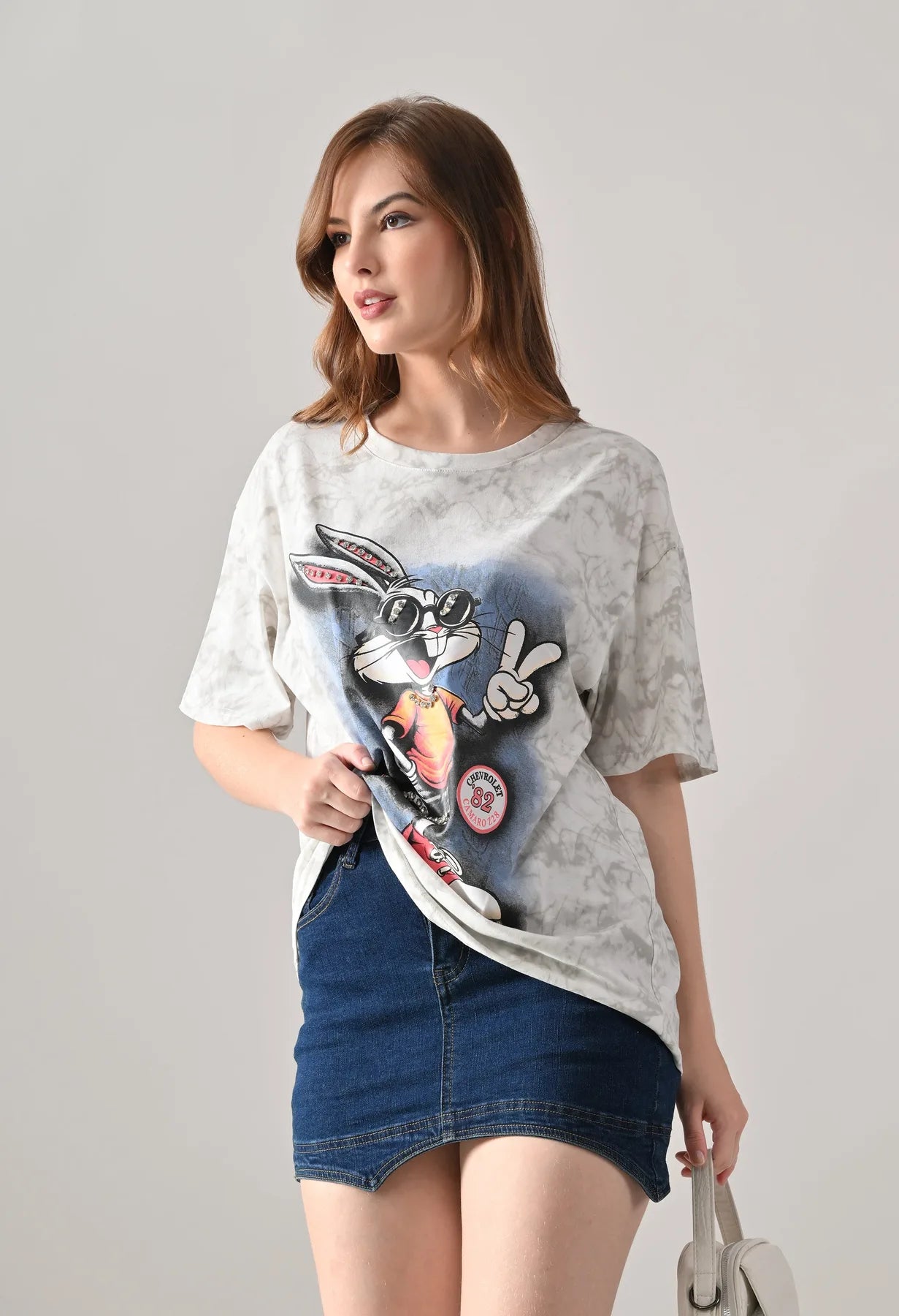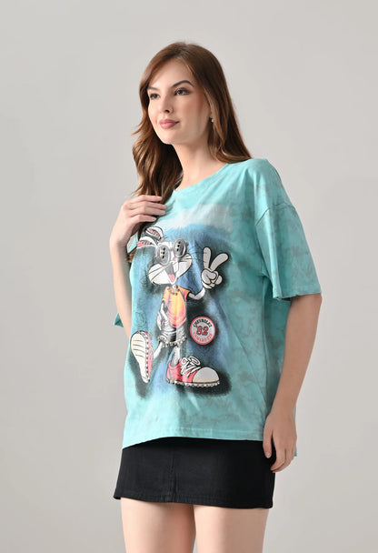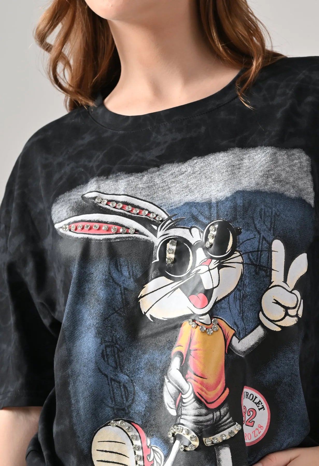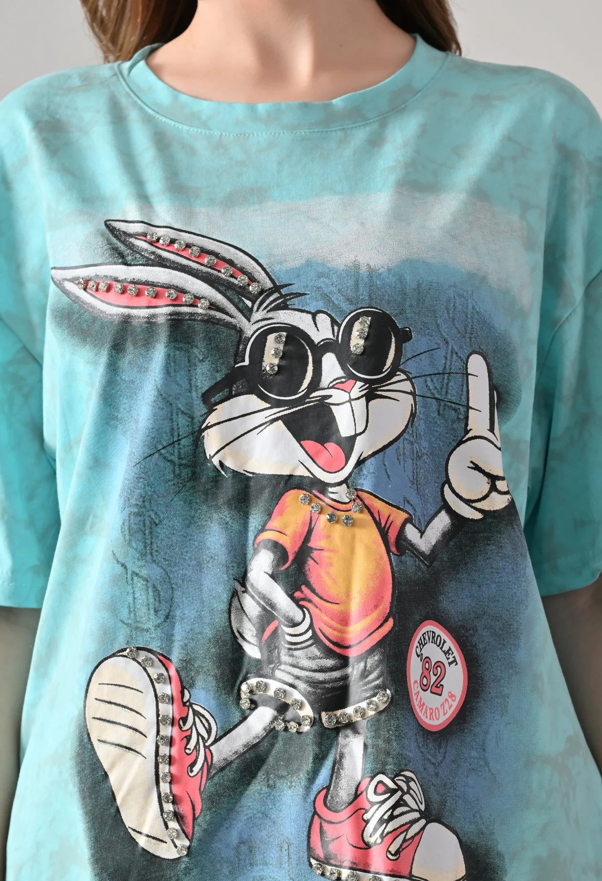 Bring a playful twist to your casual wardrobe with this all-over tie-dye Bugs Bunny T-shirt. Designed with a round neck, drop shoulders, and half sleeves, it features a bold Disney character print in front, highlighted with rhinestones for extra sparkle. Its relaxed, loose-fit silhouette makes it the perfect pick for everyday comfort with a stylish edge.