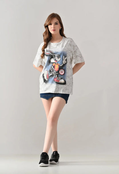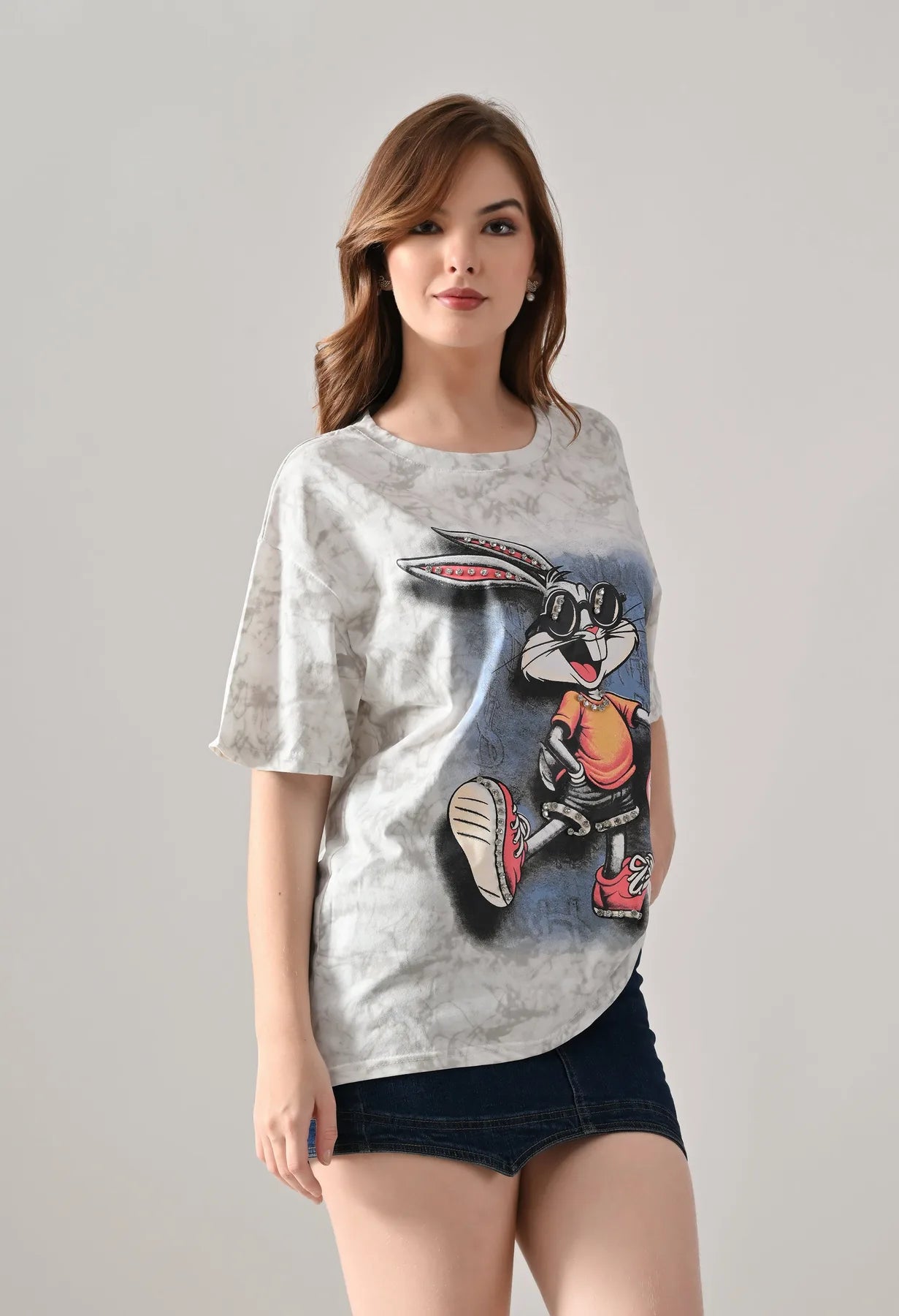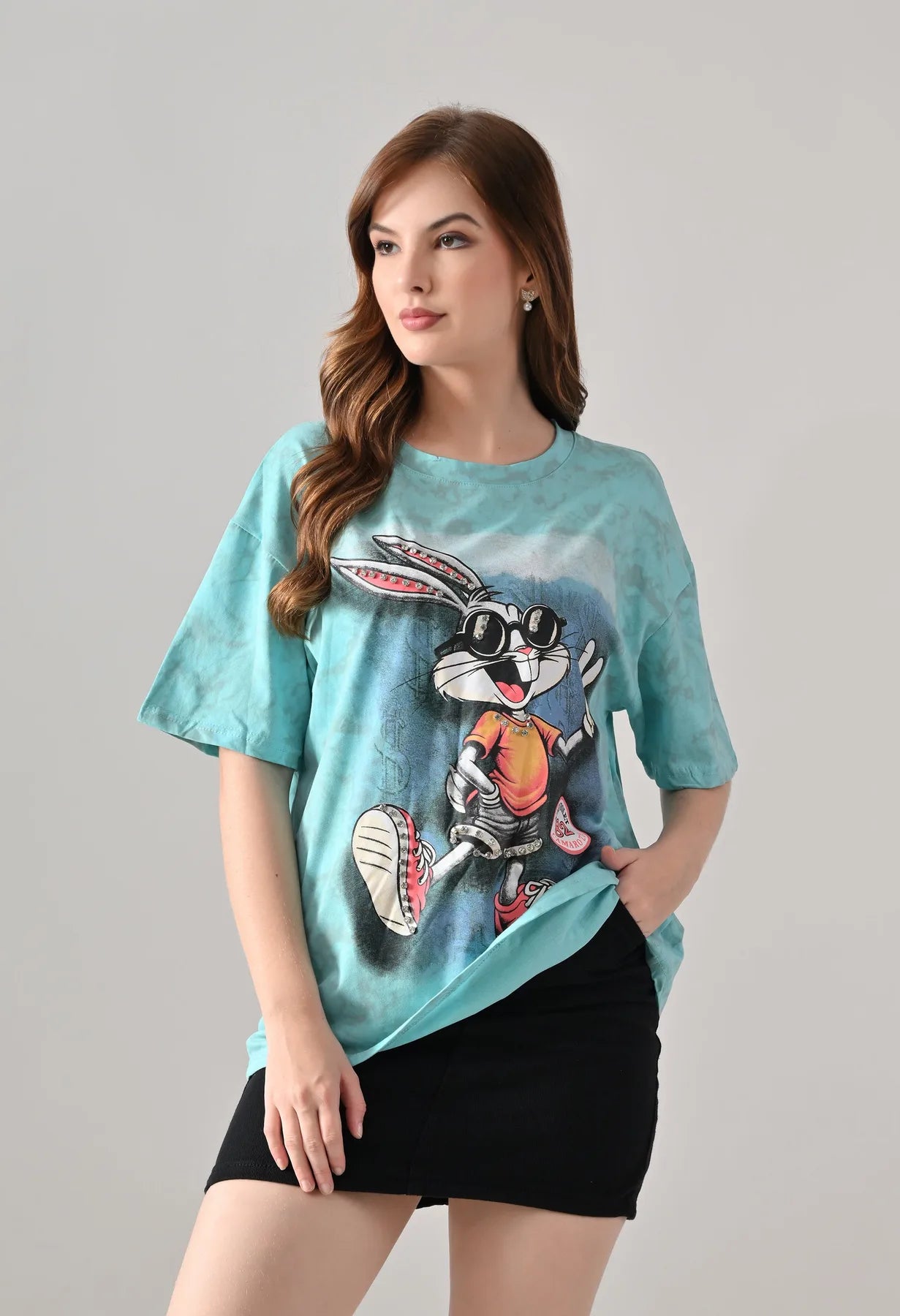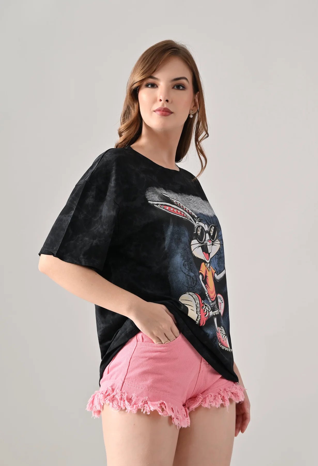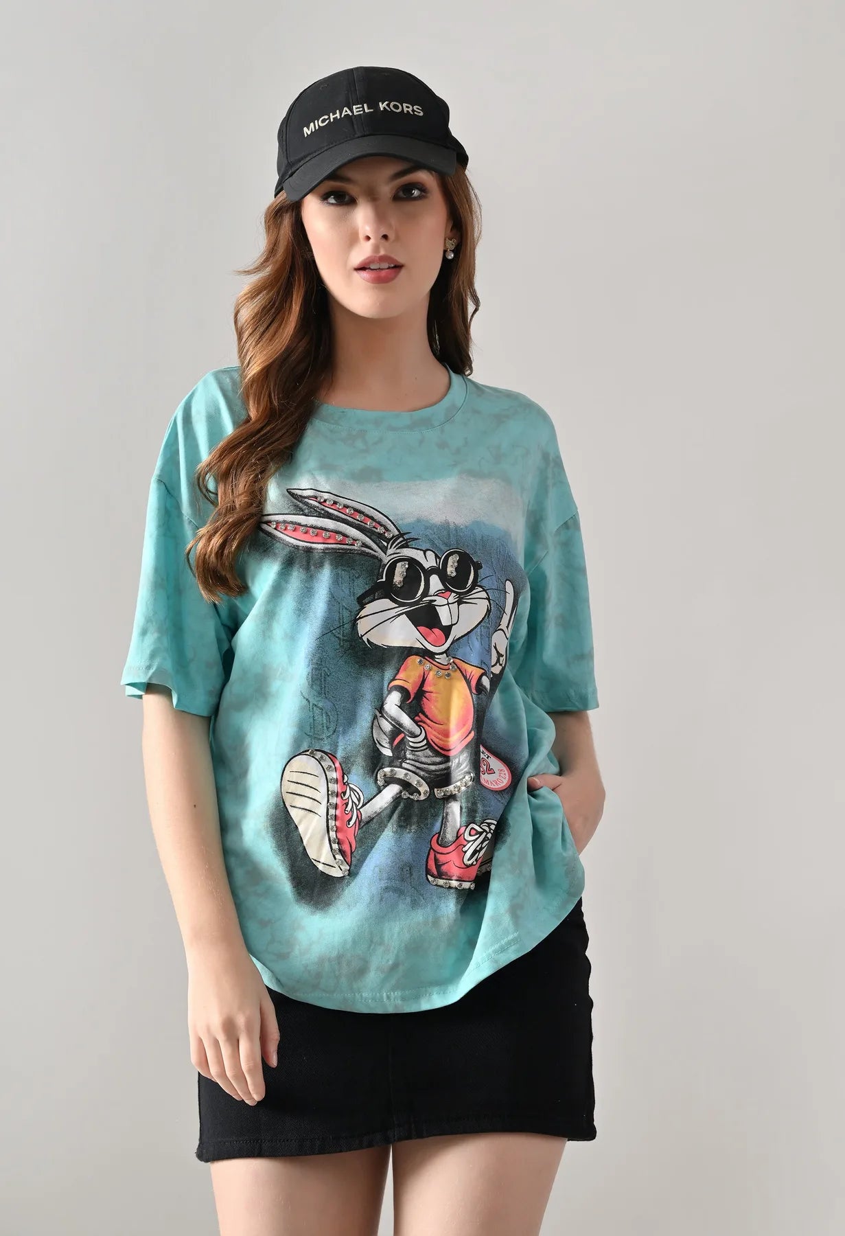 Bring a playful twist to your casual wardrobe with this all-over tie-dye Bugs Bunny T-shirt. Designed with a round neck, drop shoulders, and half sleeves, it features a bold Disney character print in front, highlighted with rhinestones for extra sparkle. Its relaxed, loose-fit silhouette makes it the perfect pick for everyday comfort with a stylish edge.