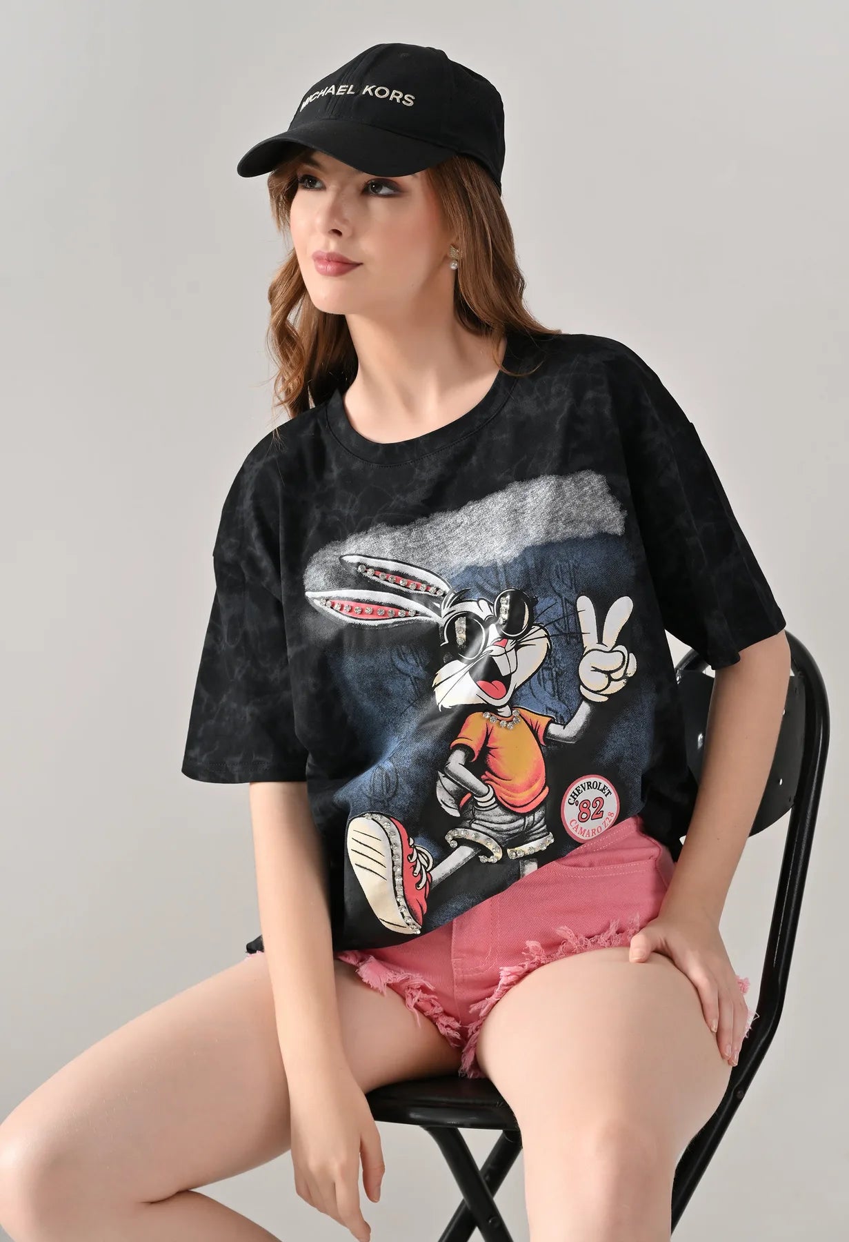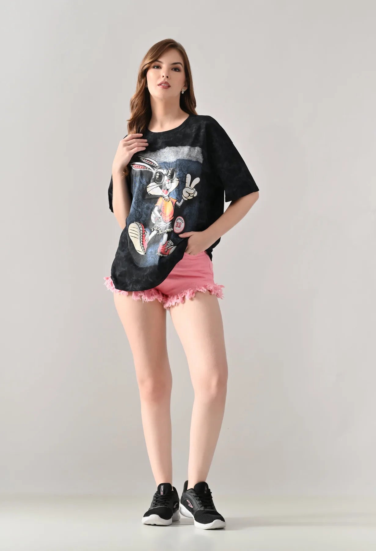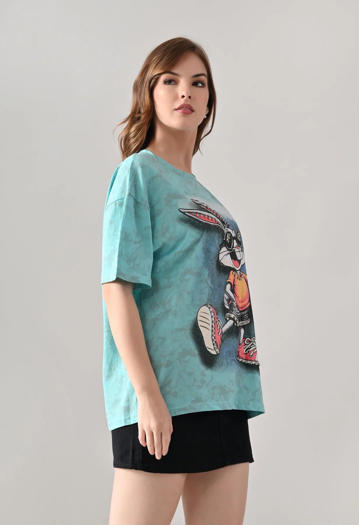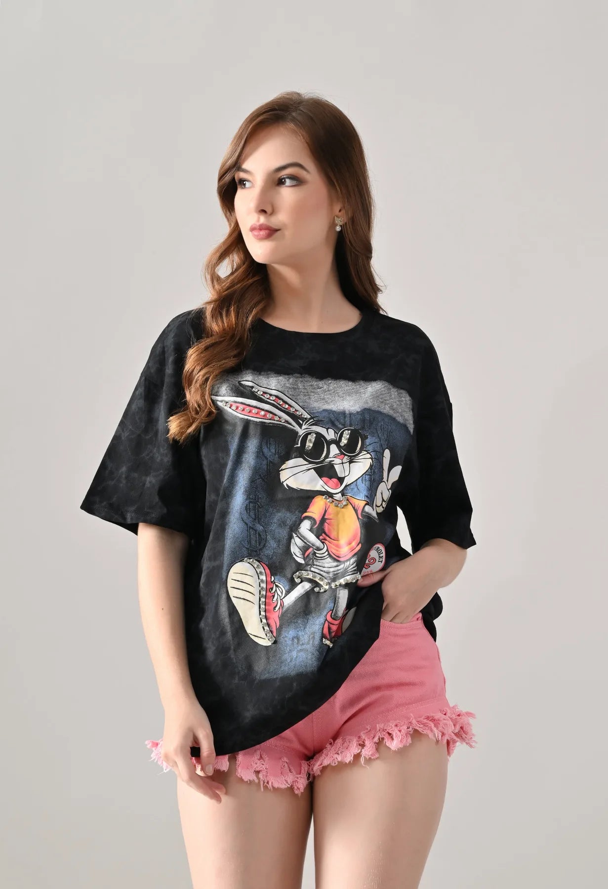 Bring a playful twist to your casual wardrobe with this all-over tie-dye Bugs Bunny T-shirt. Designed with a round neck, drop shoulders, and half sleeves, it features a bold Disney character print in front, highlighted with rhinestones for extra sparkle. Its relaxed, loose-fit silhouette makes it the perfect pick for everyday comfort with a stylish edge.