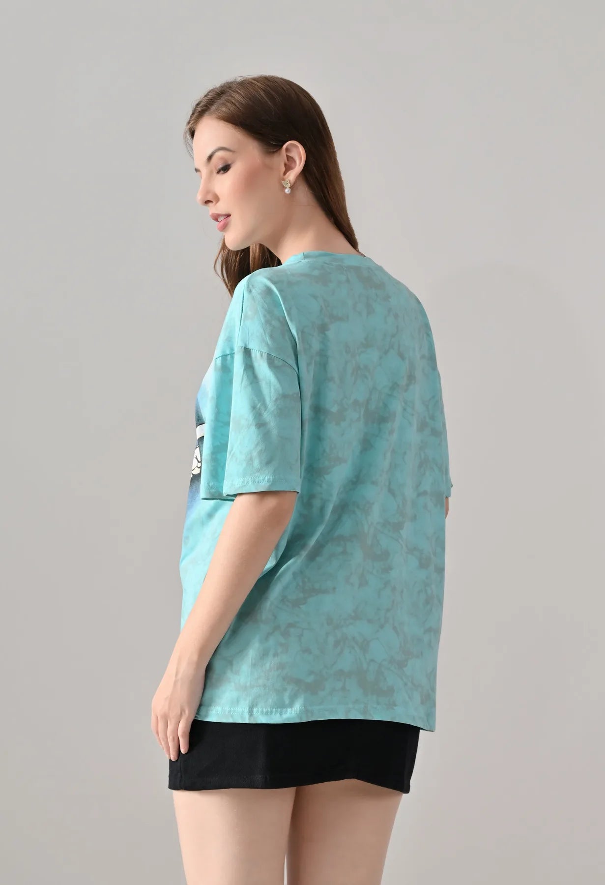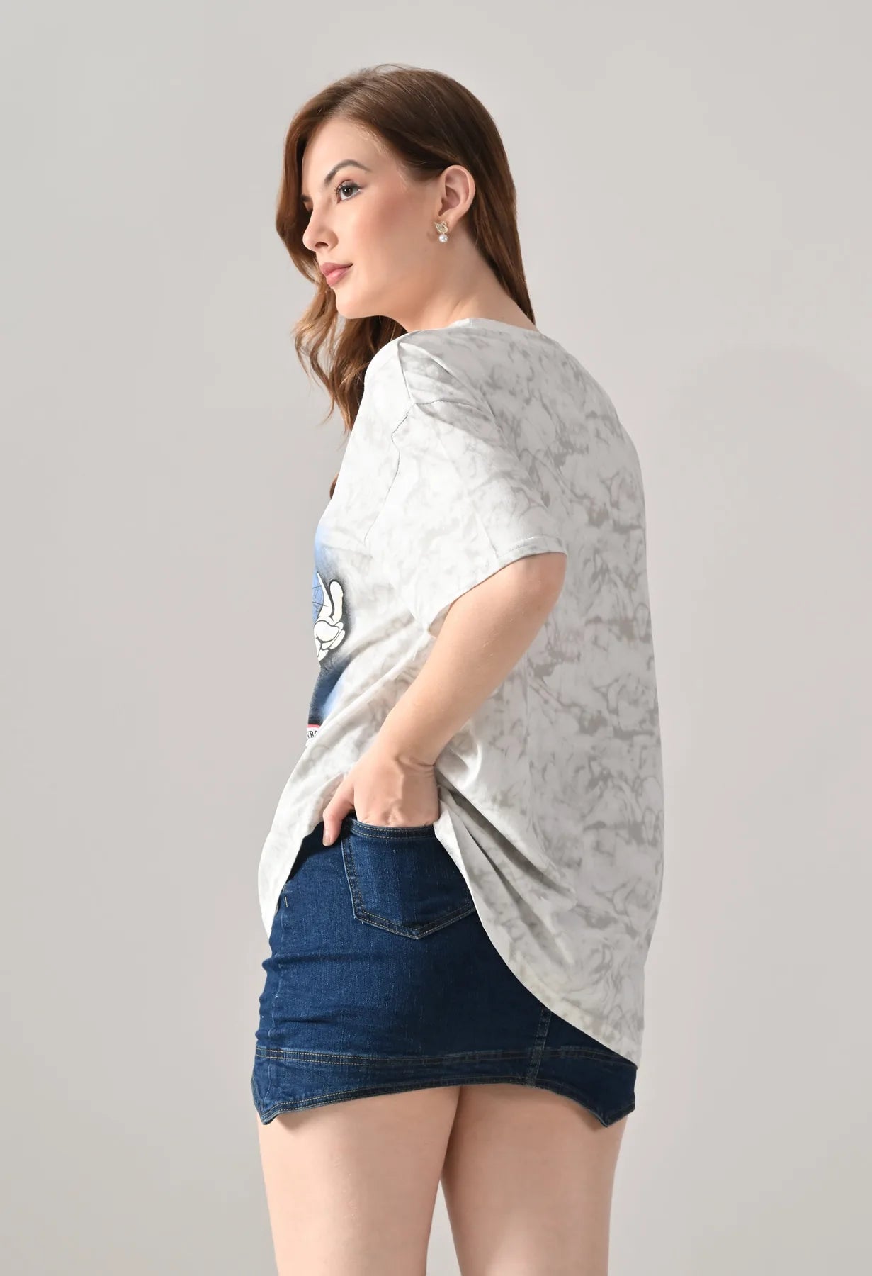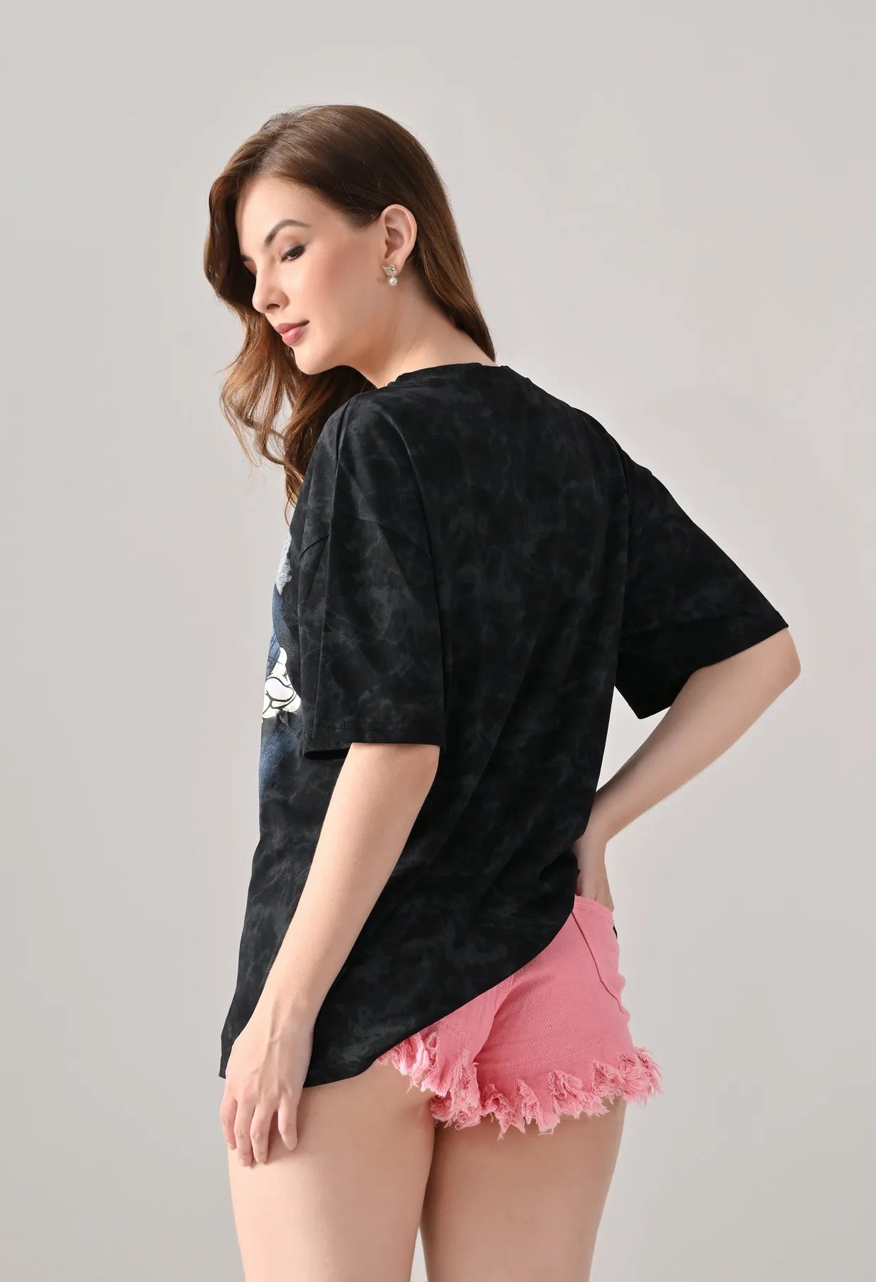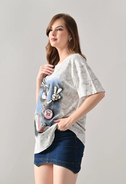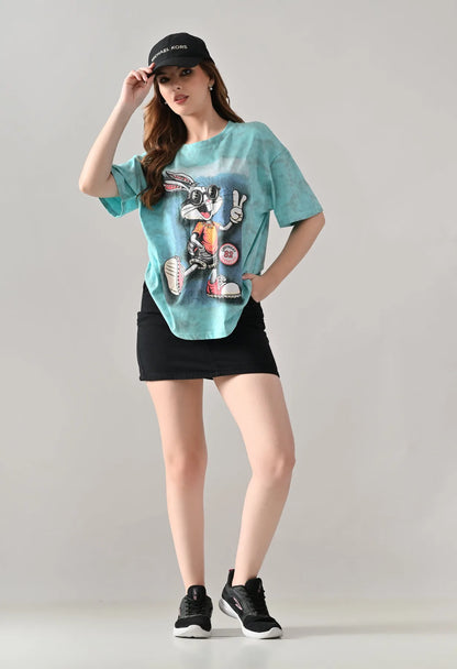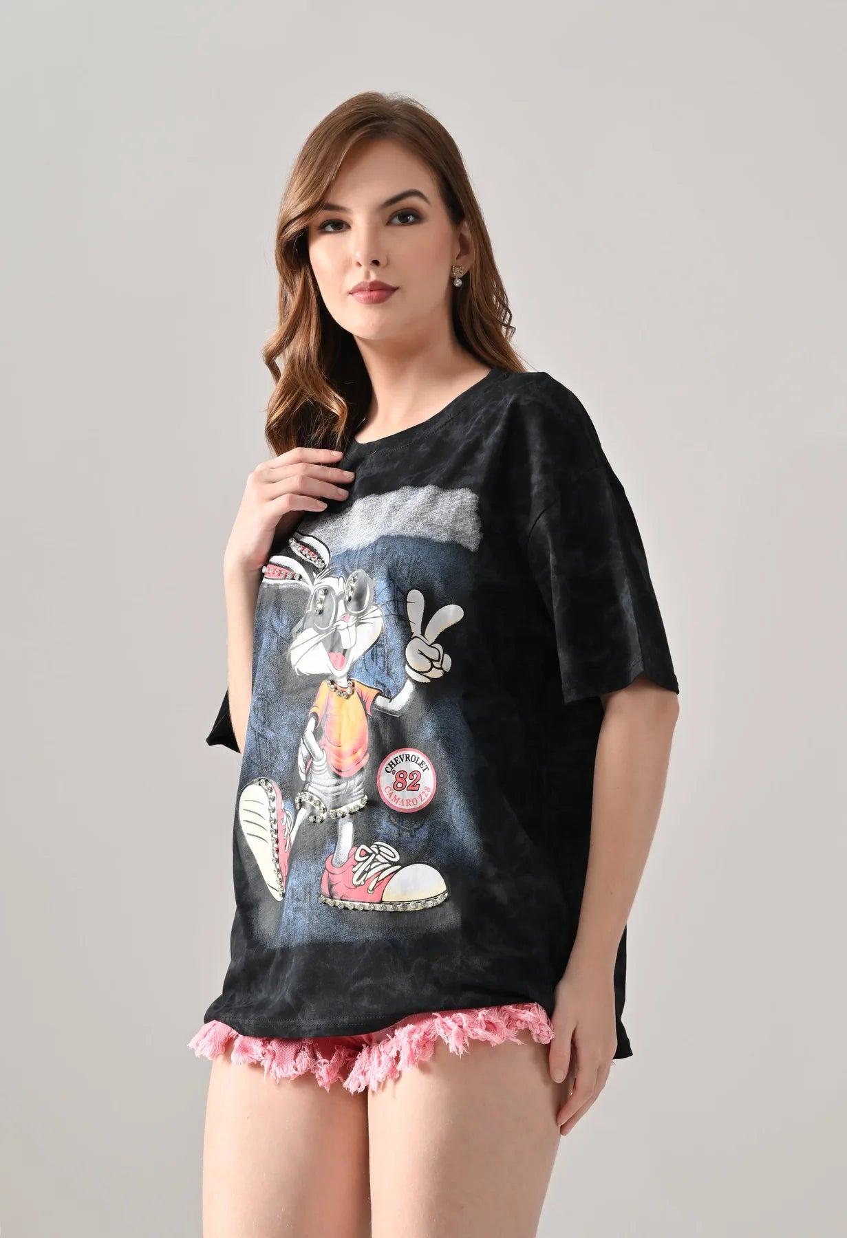 Bring a playful twist to your casual wardrobe with this all-over tie-dye Bugs Bunny T-shirt. Designed with a round neck, drop shoulders, and half sleeves, it features a bold Disney character print in front, highlighted with rhinestones for extra sparkle. Its relaxed, loose-fit silhouette makes it the perfect pick for everyday comfort with a stylish edge.