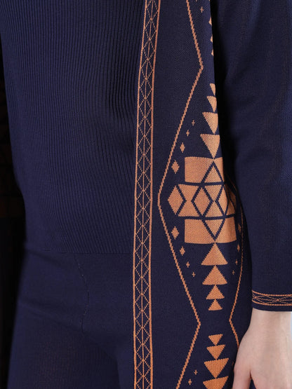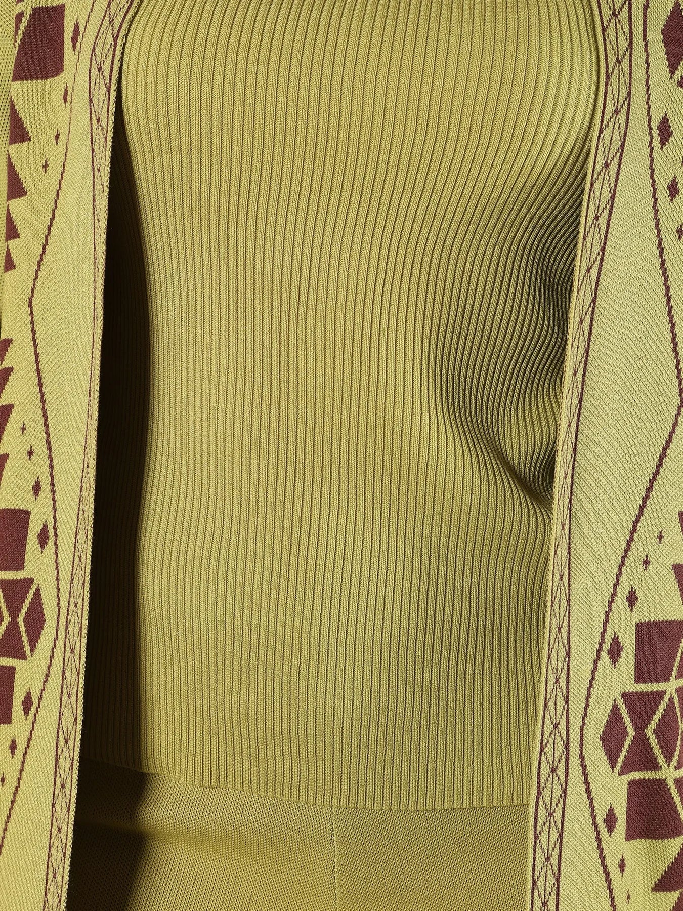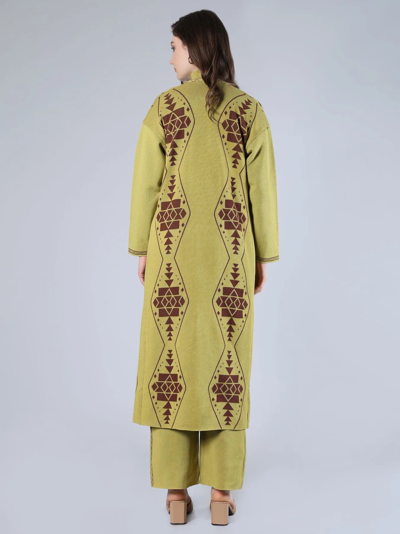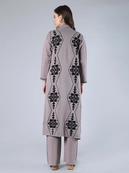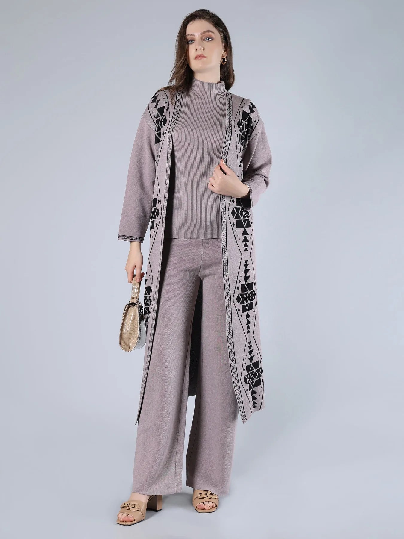 The Warm Knitted Three-Piece Set features a round neckline, long printed cardigan with full sleeves, and straight knitted pants, perfect for cozy autumn and winter wear. Crafted from stretchable material, it combines comfort and chic style for casual day wear or vacation outings.
