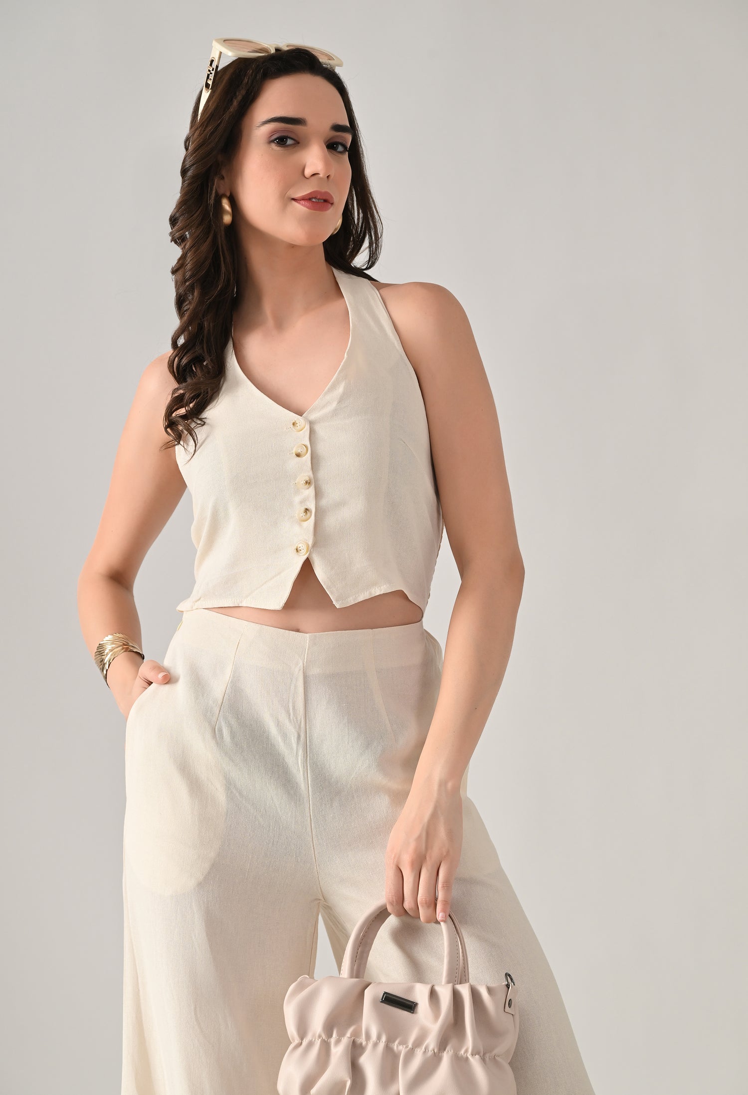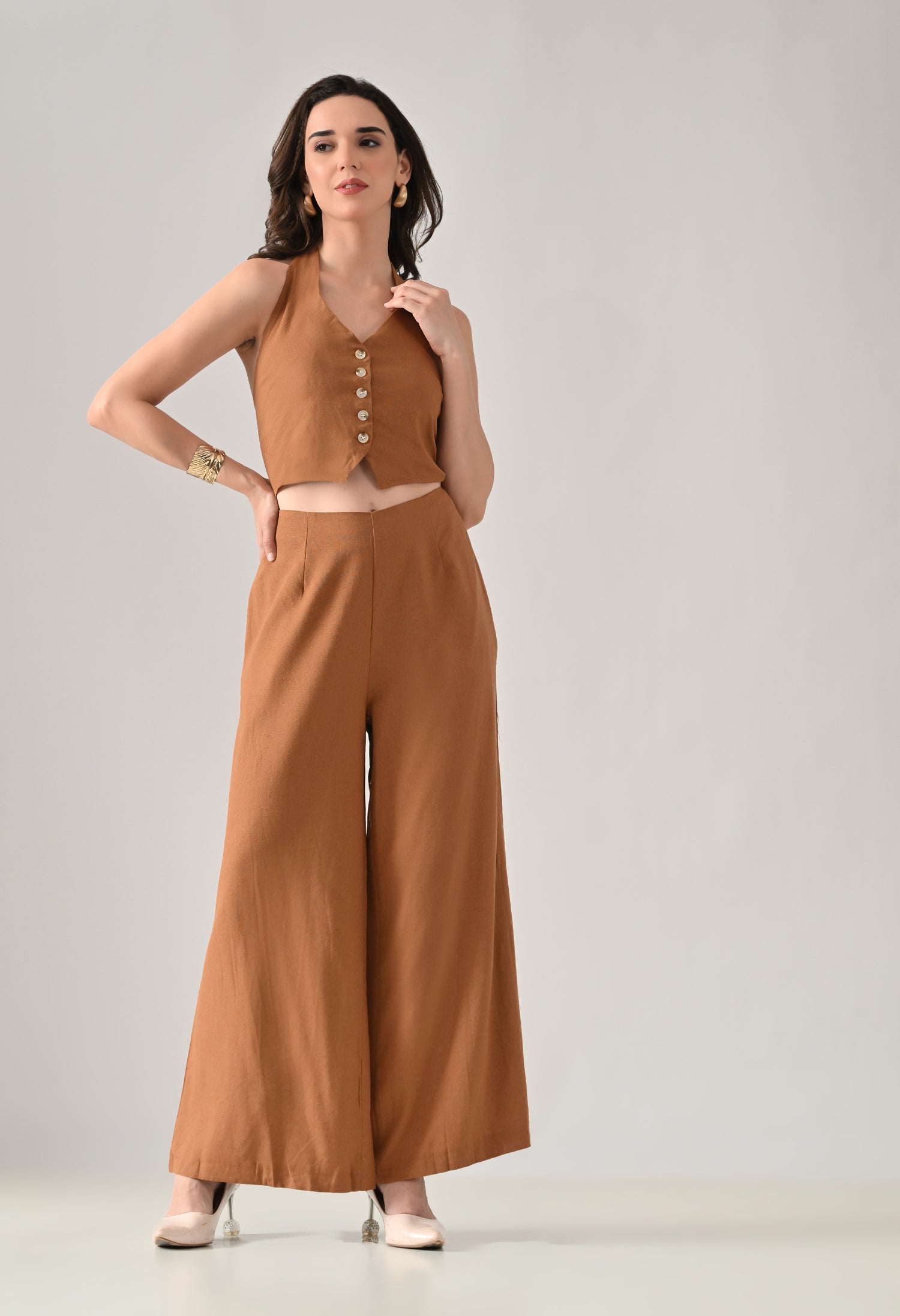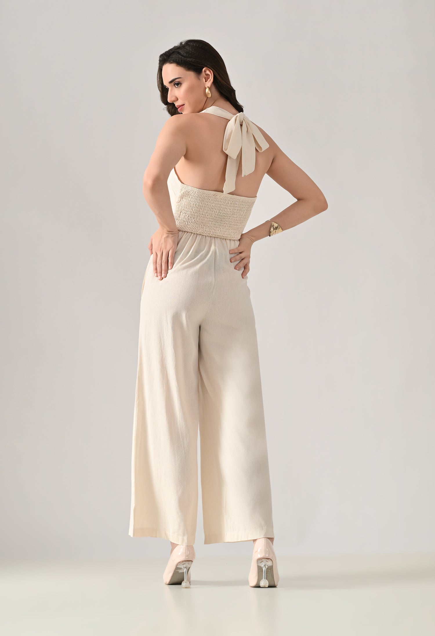 Turn heads with this backless halter jumpsuit in a rich cinnamon hue. Featuring a smocked back for a flattering fit, wide-leg flowy pants, and a cropped front-button detail, this piece effortlessly blends bold and breathable style. Ideal for brunches, getaways, and everything in between.