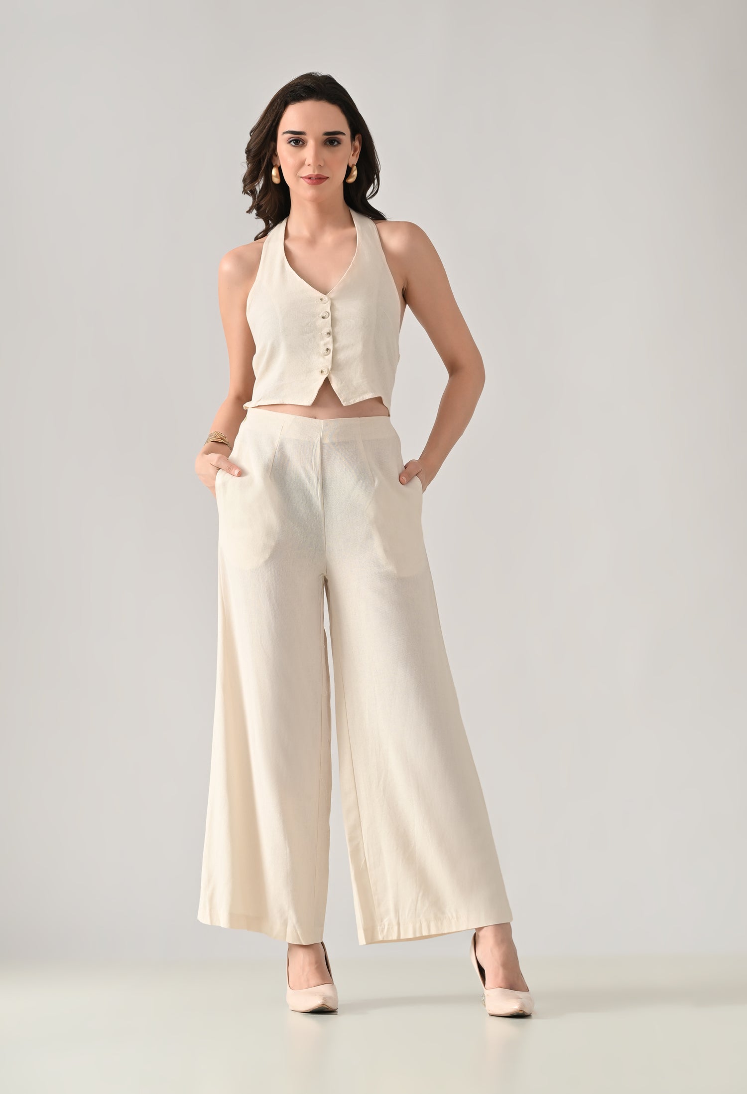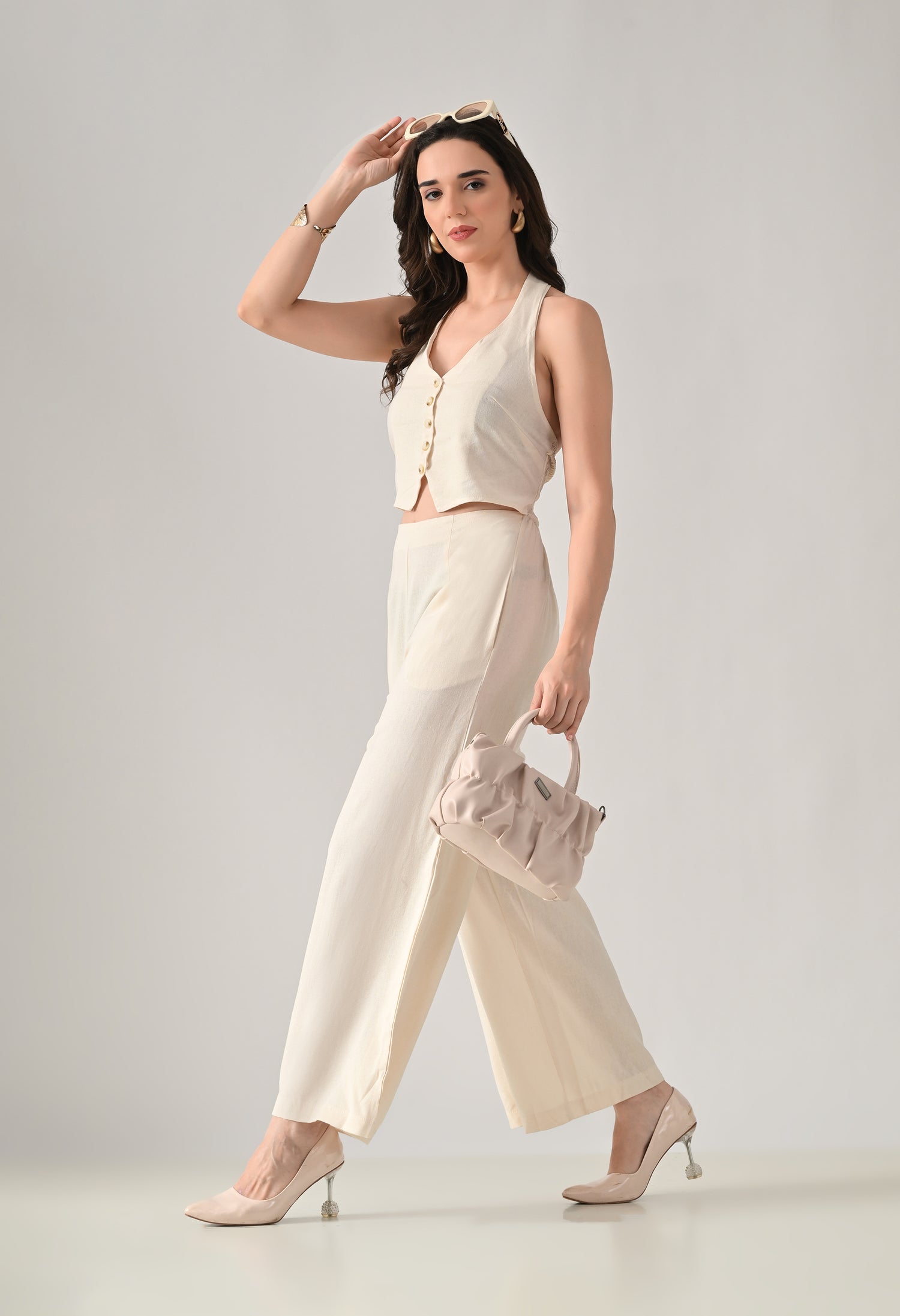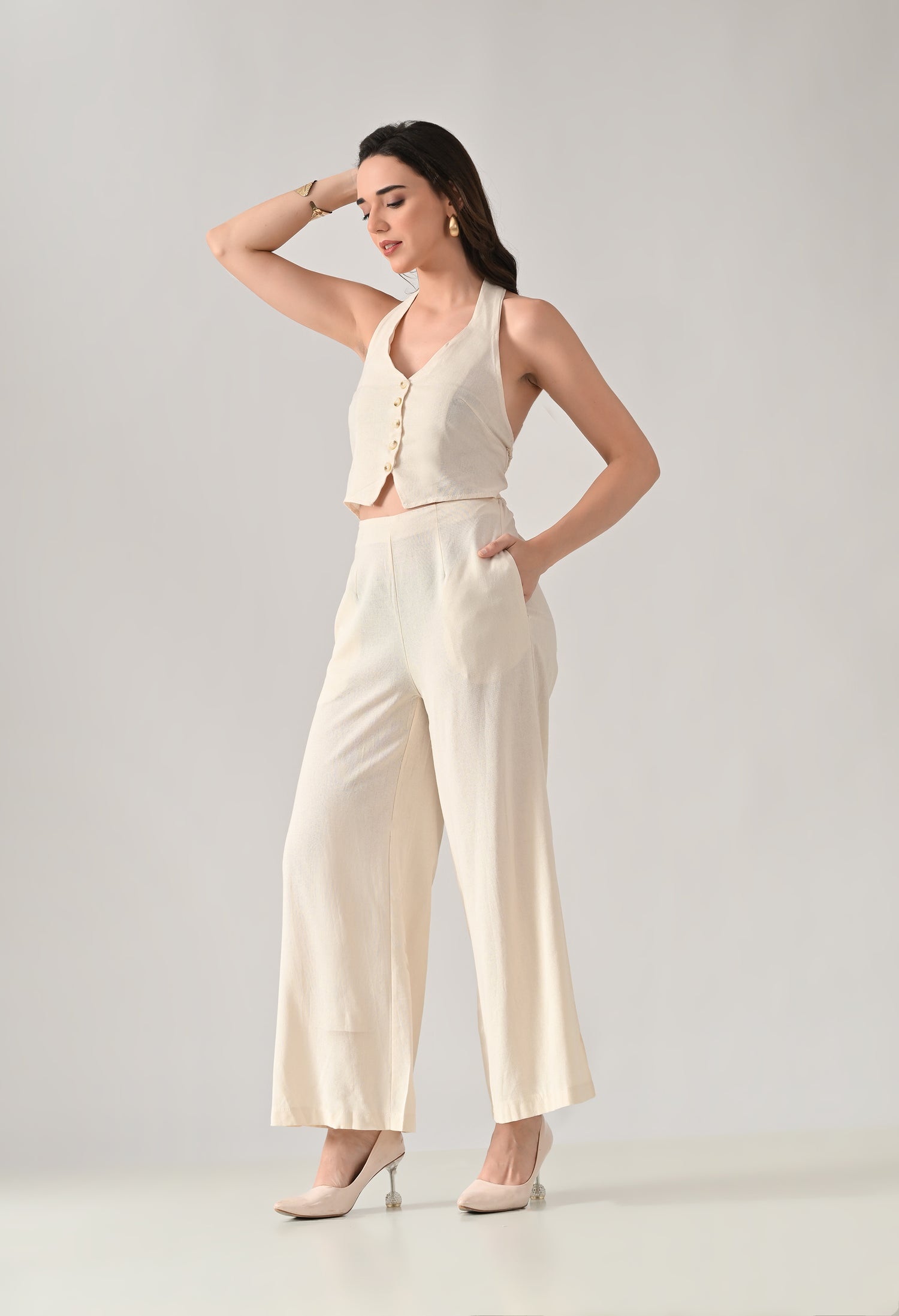 Turn heads with this backless halter jumpsuit in a rich cinnamon hue. Featuring a smocked back for a flattering fit, wide-leg flowy pants, and a cropped front-button detail, this piece effortlessly blends bold and breathable style. Ideal for brunches, getaways, and everything in between.