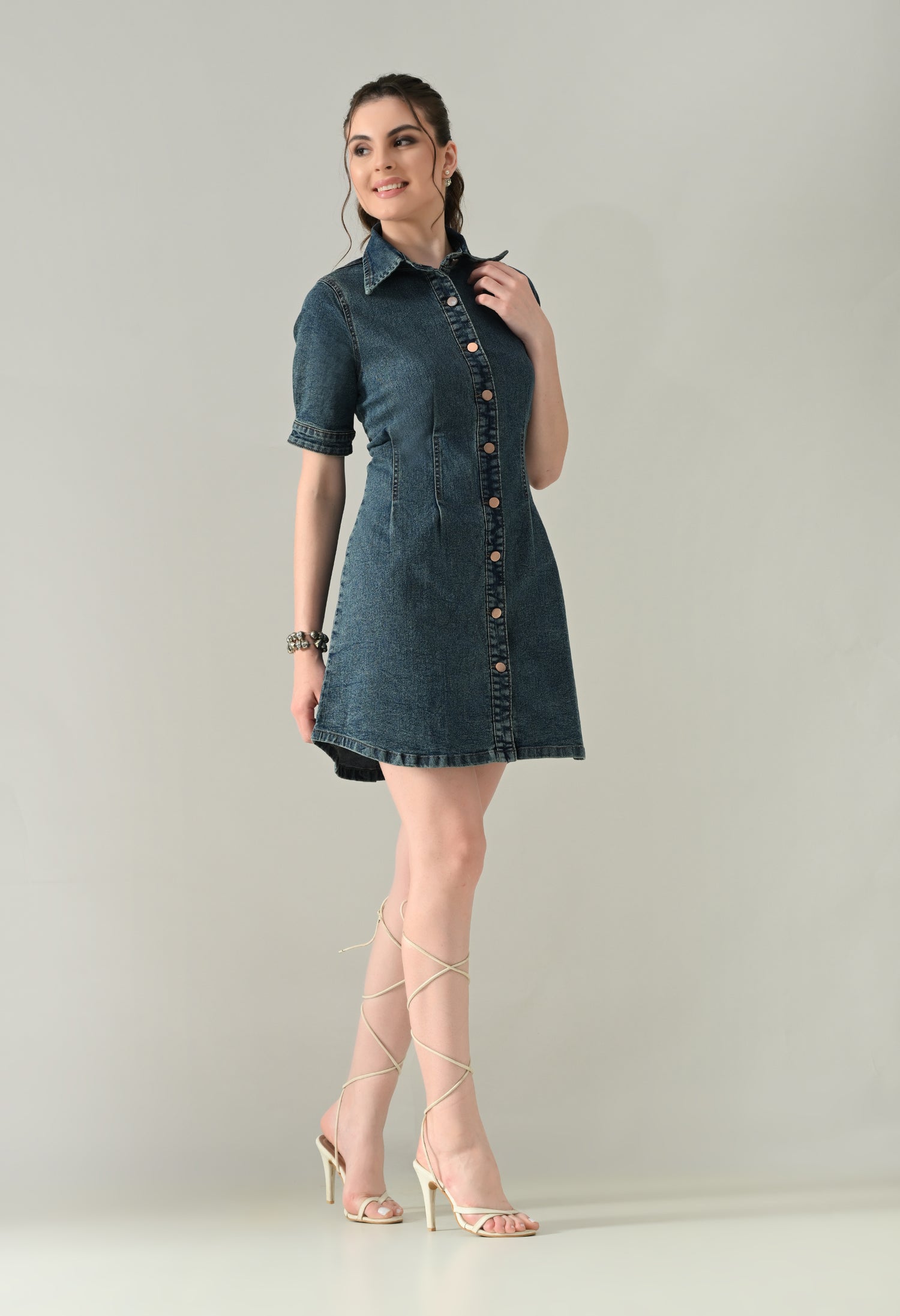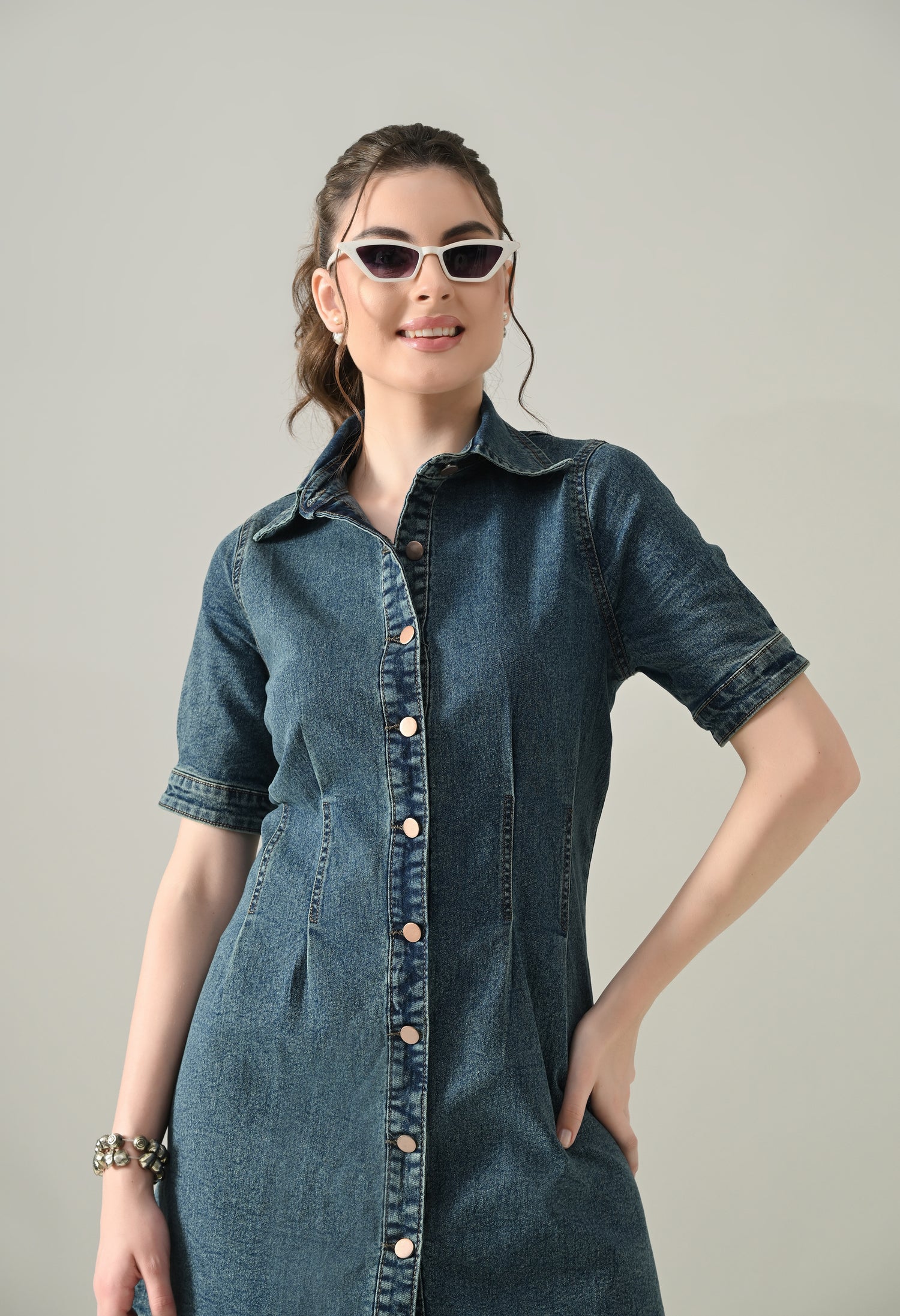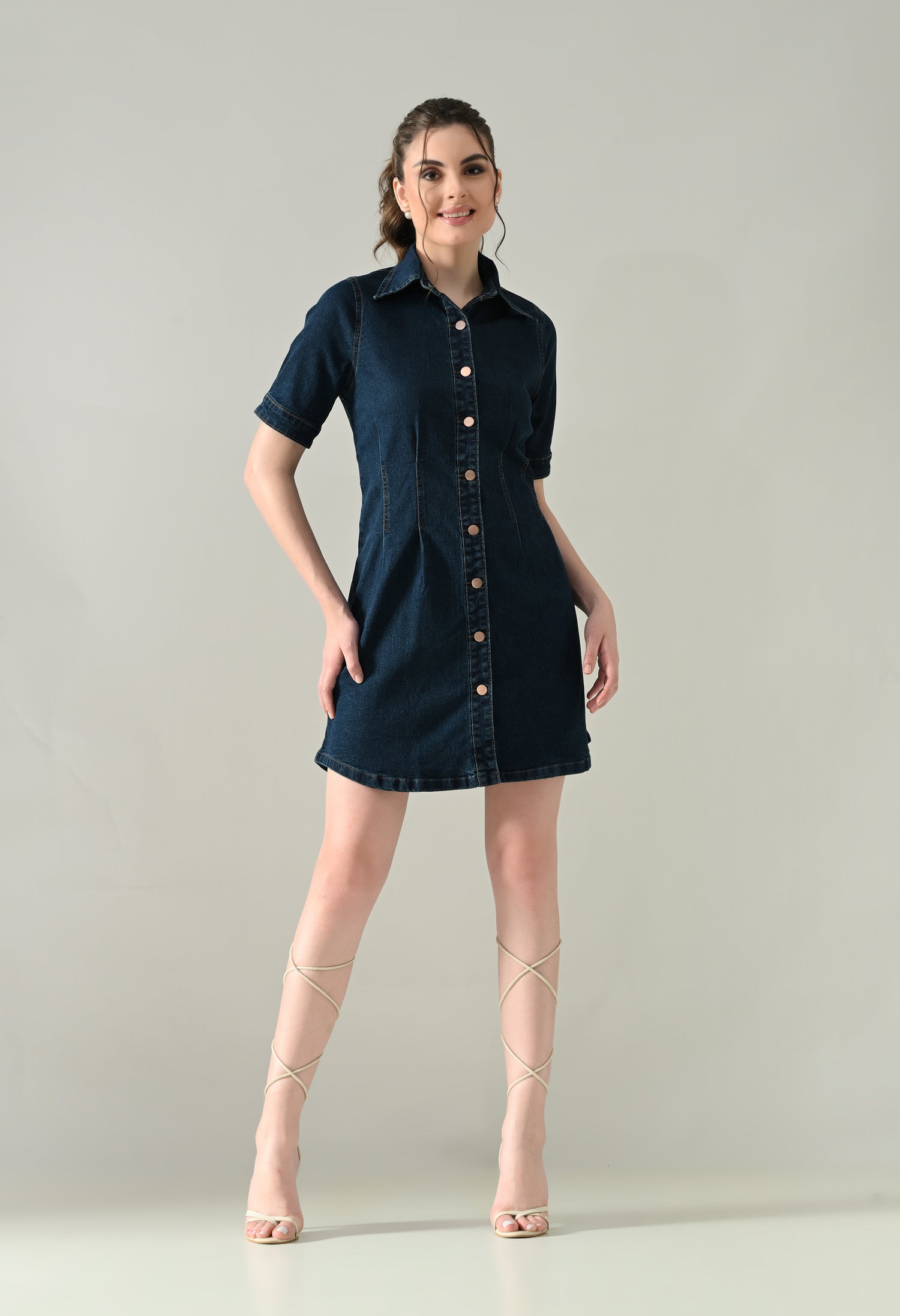 The Contour Denim Button-Down Dress is a chic short-length style crafted in soft stretchable denim for all-day comfort. Designed in a slight A-line silhouette, it features a smart collar, front button closure, and half sleeves for a polished yet casual vibe. Detailed with front pintucks for added structure, this versatile denim dress blends elegance with ease—perfect for everyday wear or day-to-night transitions.