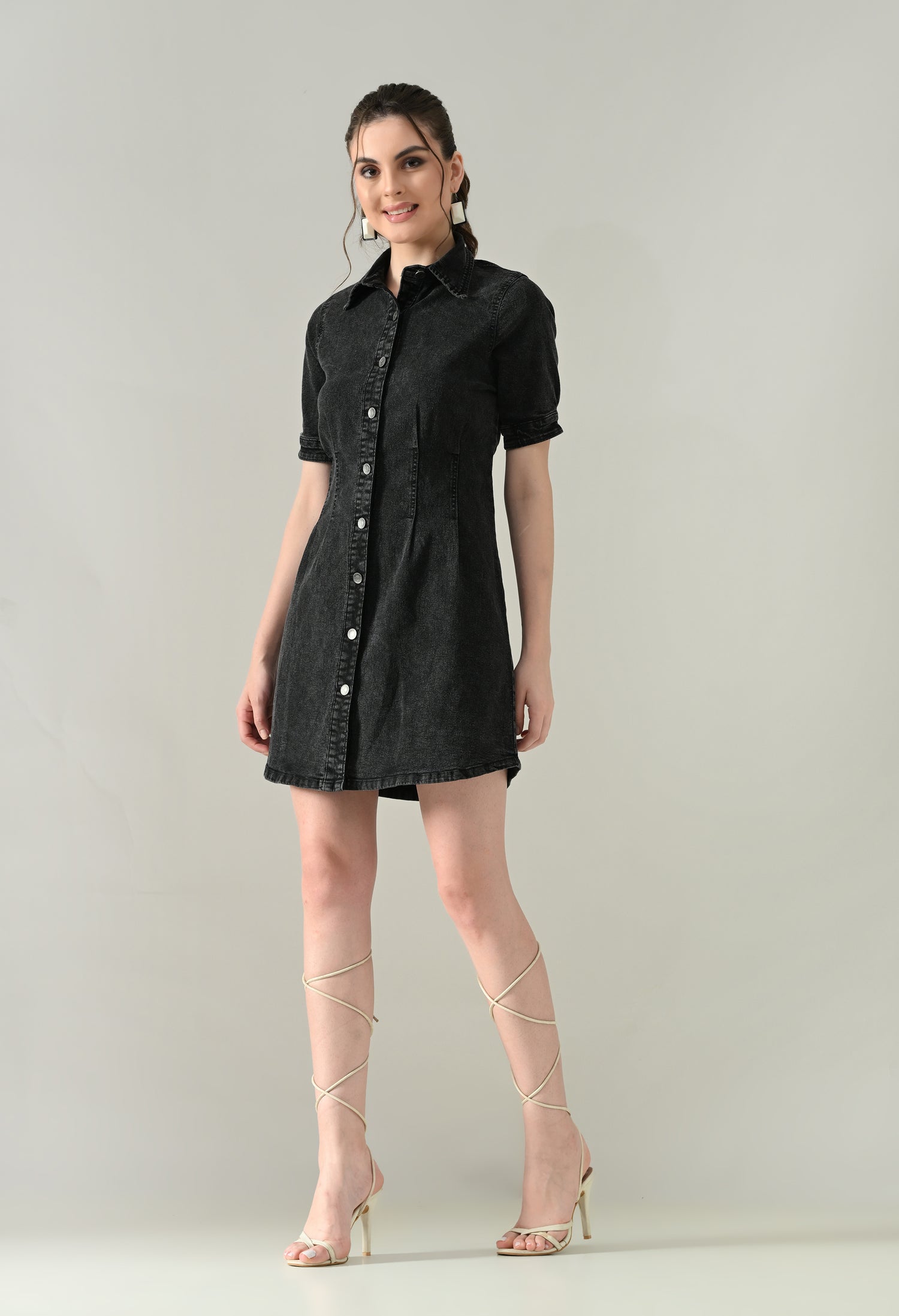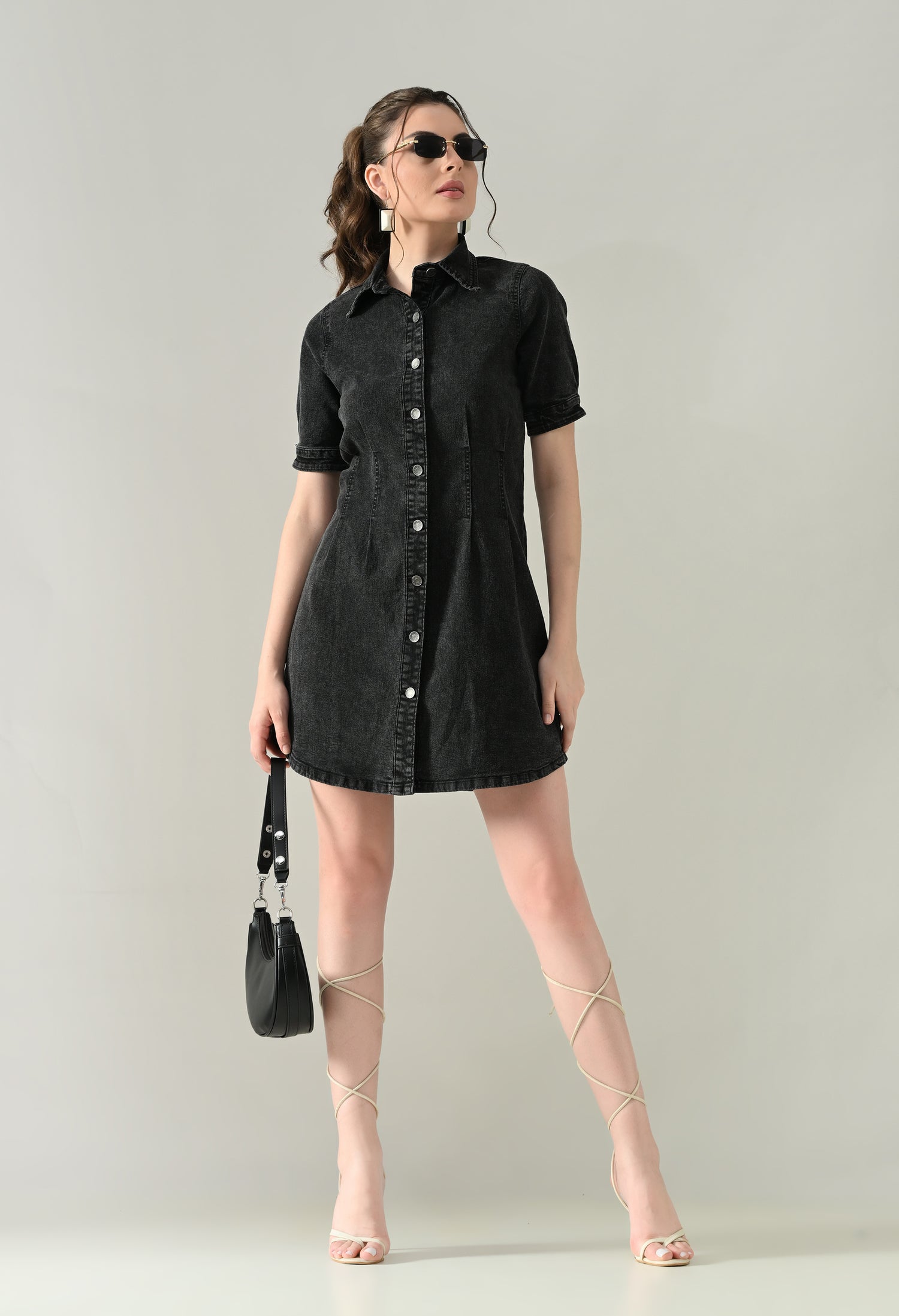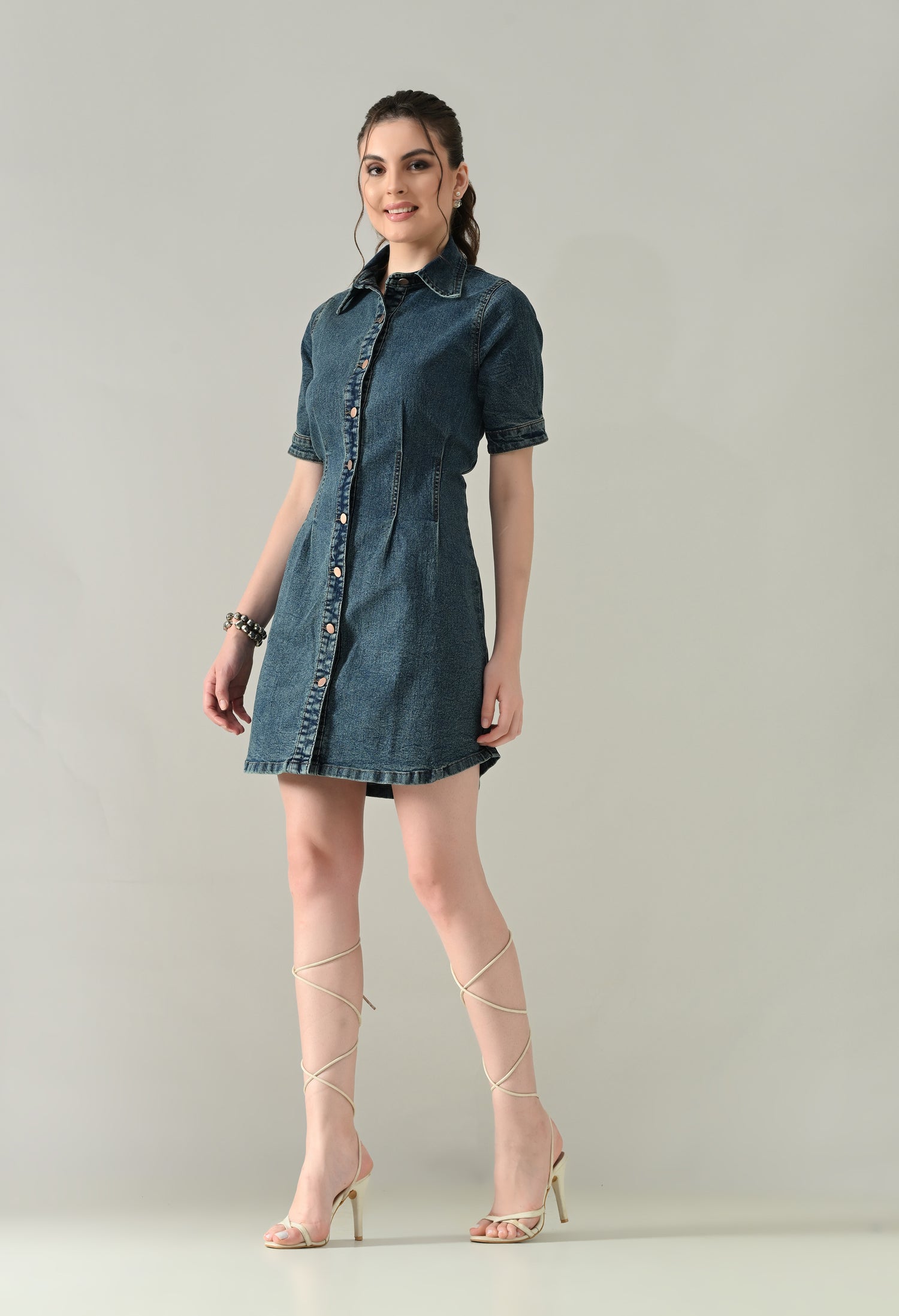 The Contour Denim Button-Down Dress is a chic short-length style crafted in soft stretchable denim for all-day comfort. Designed in a slight A-line silhouette, it features a smart collar, front button closure, and half sleeves for a polished yet casual vibe. Detailed with front pintucks for added structure, this versatile denim dress blends elegance with ease—perfect for everyday wear or day-to-night transitions.