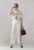 Step into effortless elegance with this easy-breezy white co-ord set, defined by bold black embroidery for a striking contrast. The cropped t-shirt features a relaxed silhouette with wide half sleeves, while the high-waist trousers are tailored in a comfort-fit style, detailed with embroidery running along the sides. A minimal yet statement look, perfect for casual outings, vacations, or day-to-night transitions.