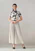 A sophisticated two-piece set featuring a fitted, textured jewel-neck, half sleeved top adorned with an abstract black floral pattern, paired with wide-leg ivory pleated pants detailed with fine black stripes. Perfectly balancing structure and flow, this coord is your go-to for statement day-to-evening looks.