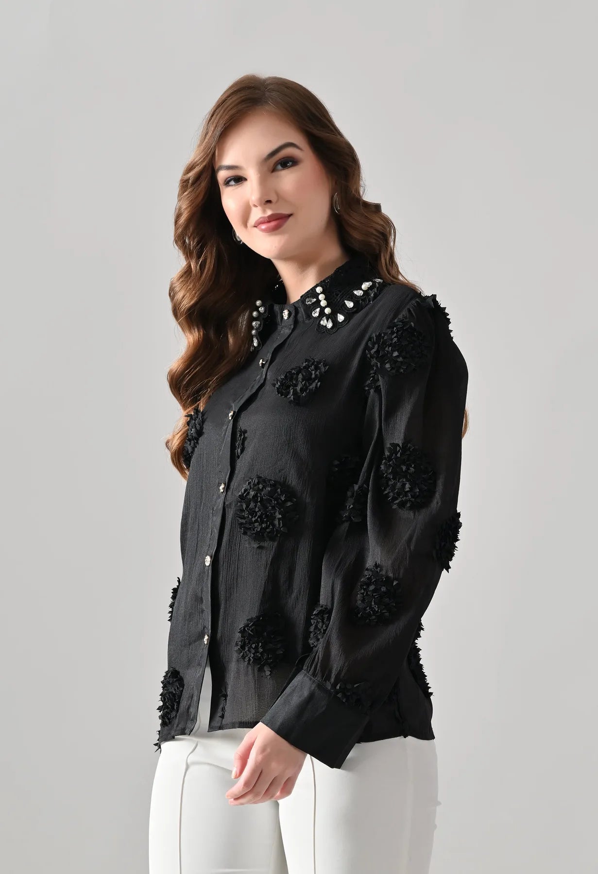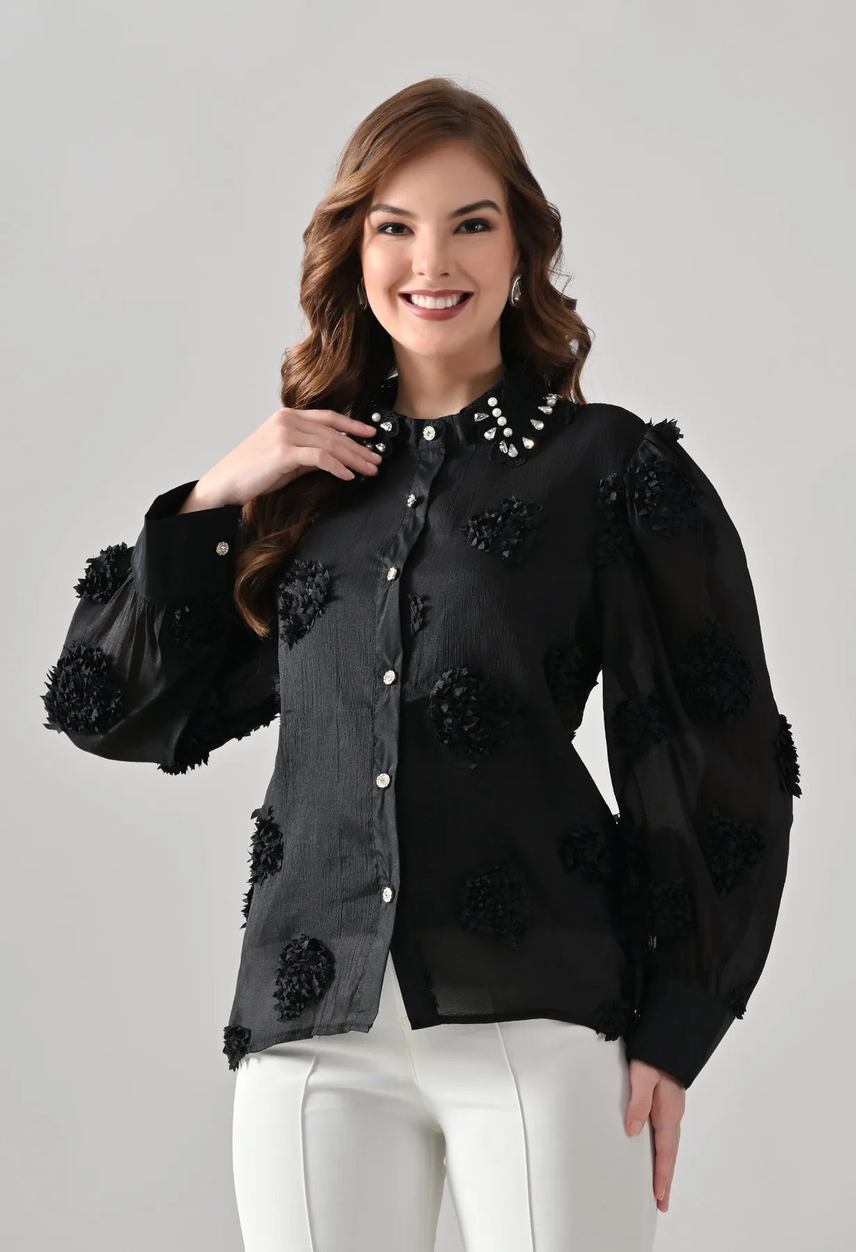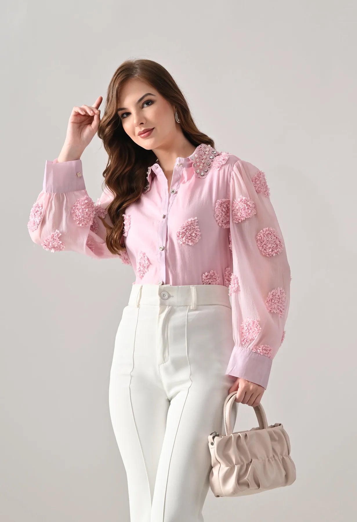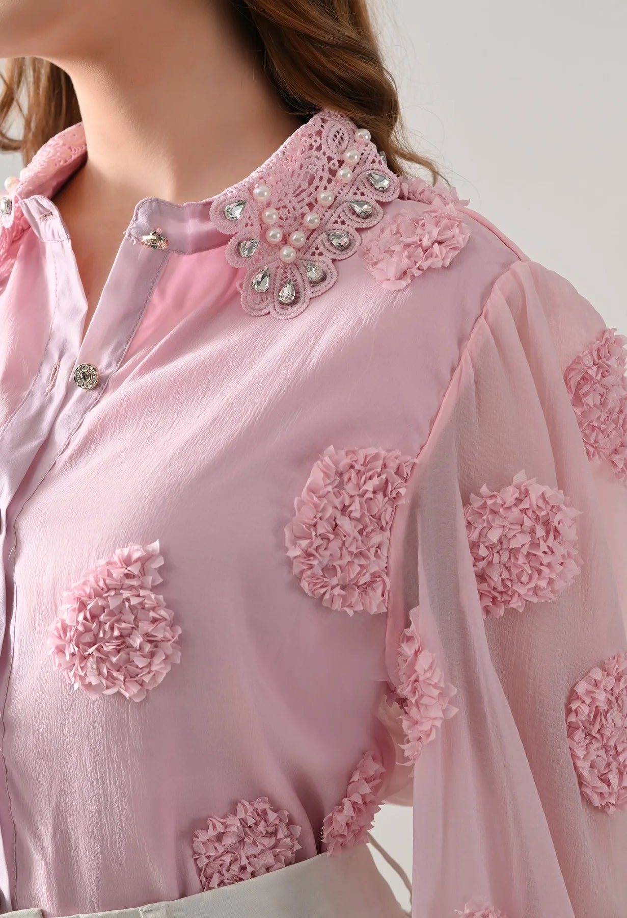 Add a touch of elegance to your wardrobe with this blush shirt featuring delicate 3D floral appliqué detailing and sheer long sleeves. The embellished pearl and stone collar adds a luxe finish, while crystal button closures bring subtle sparkle. Perfect for pairing with tailored pants or skirts, this shirt blends feminine charm with contemporary sophistication.