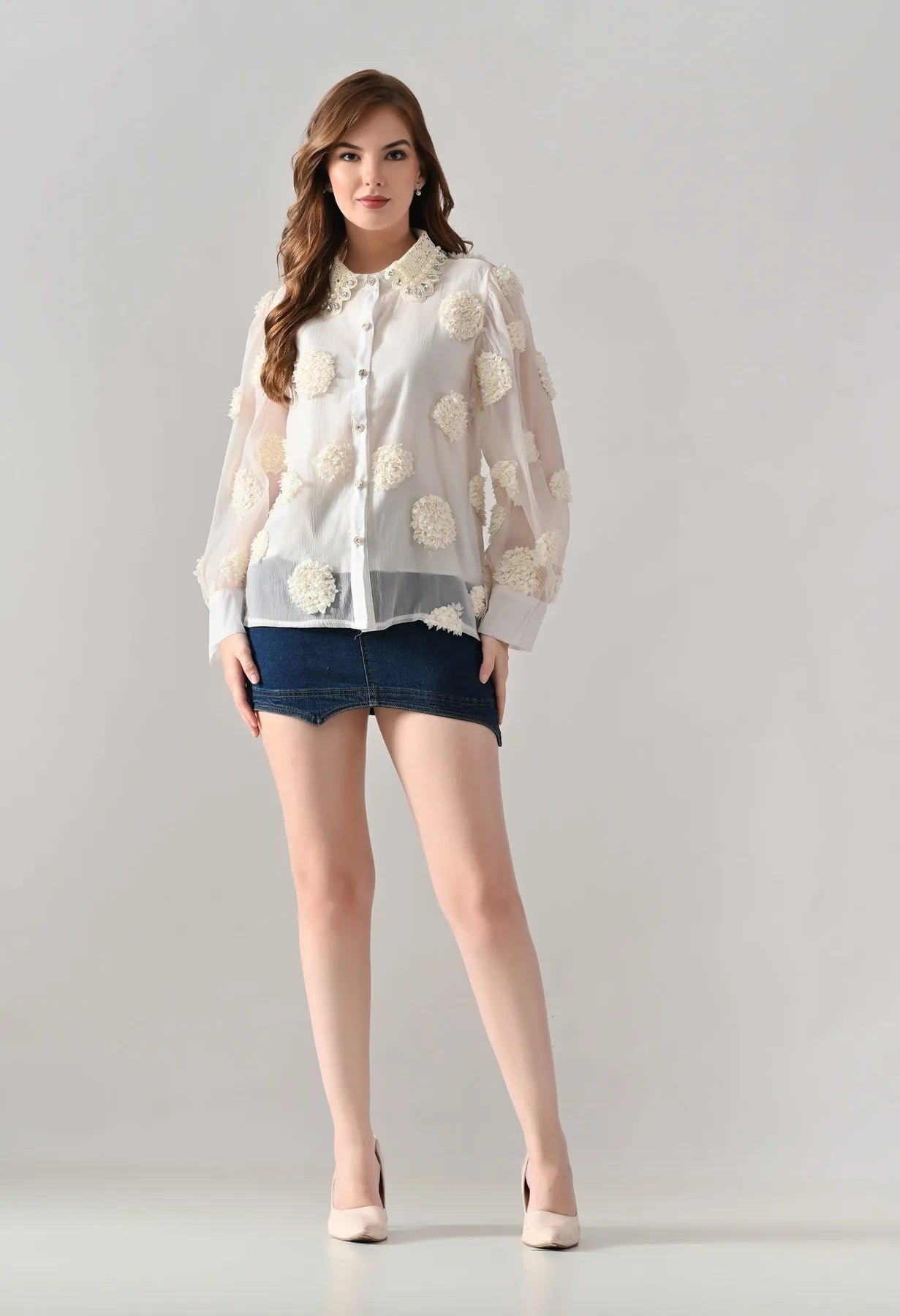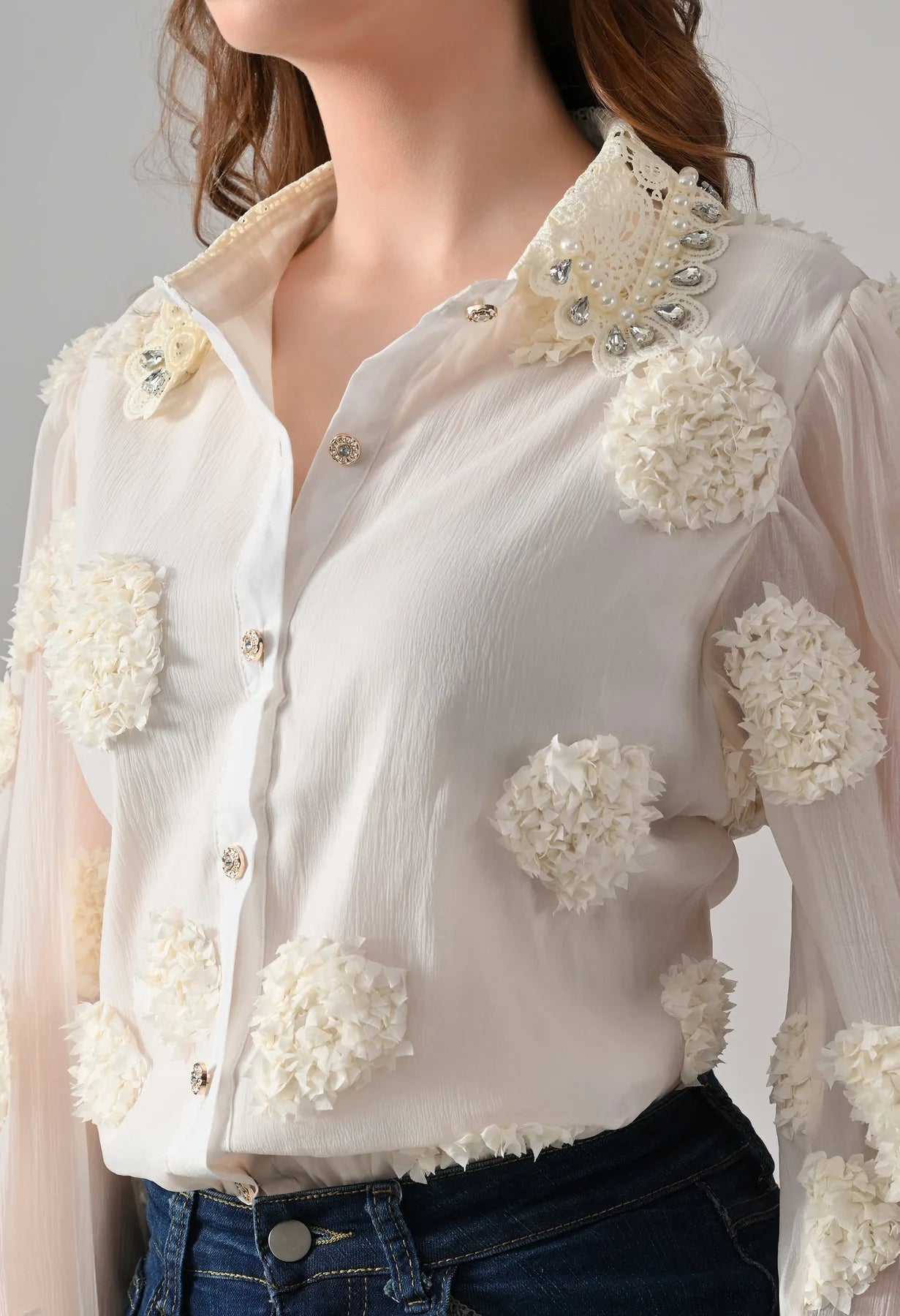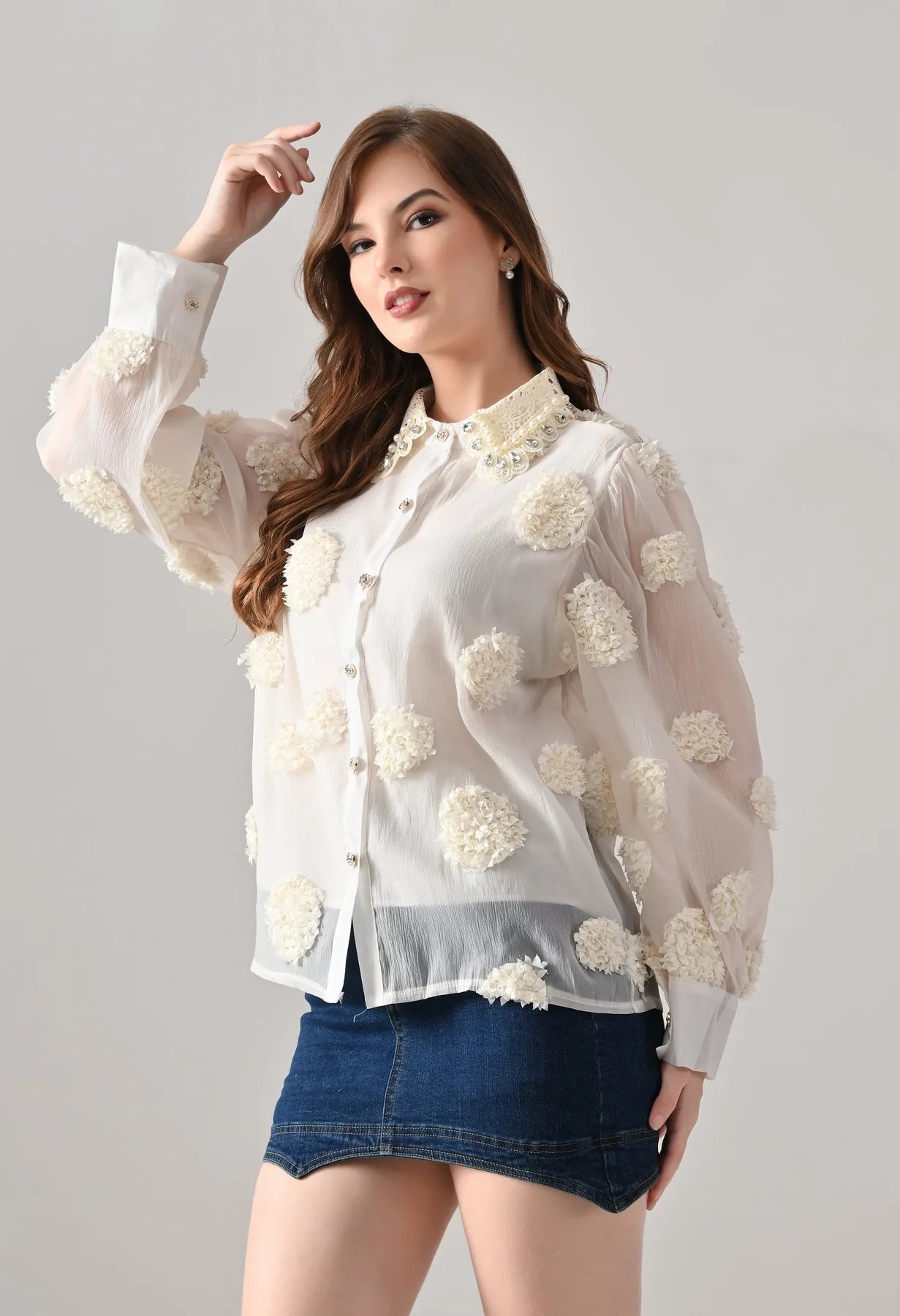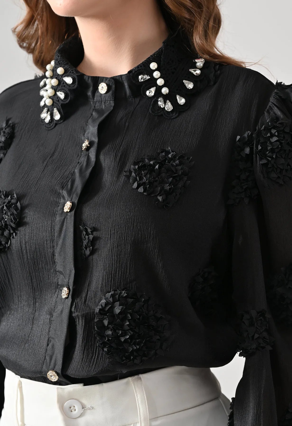 Add a touch of elegance to your wardrobe with this blush shirt featuring delicate 3D floral appliqué detailing and sheer long sleeves. The embellished pearl and stone collar adds a luxe finish, while crystal button closures bring subtle sparkle. Perfect for pairing with tailored pants or skirts, this shirt blends feminine charm with contemporary sophistication.