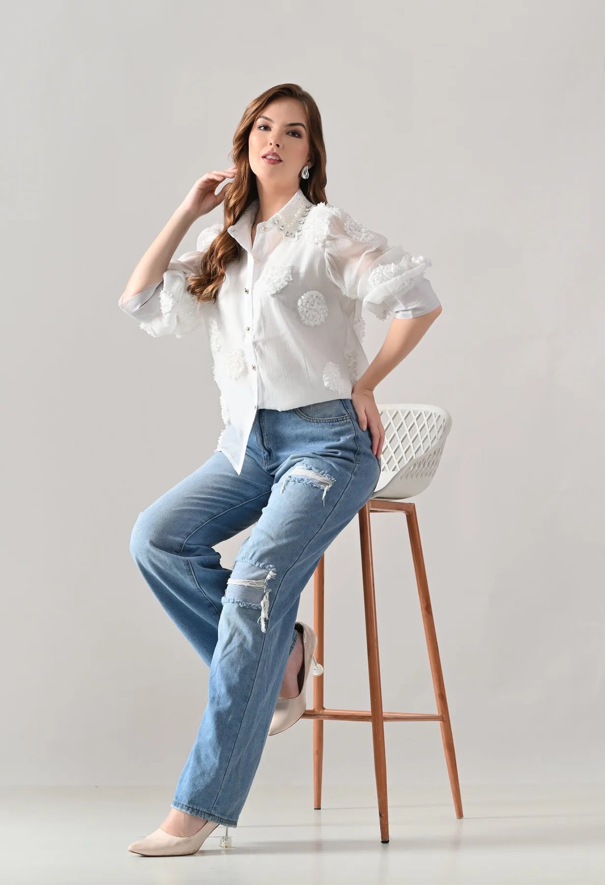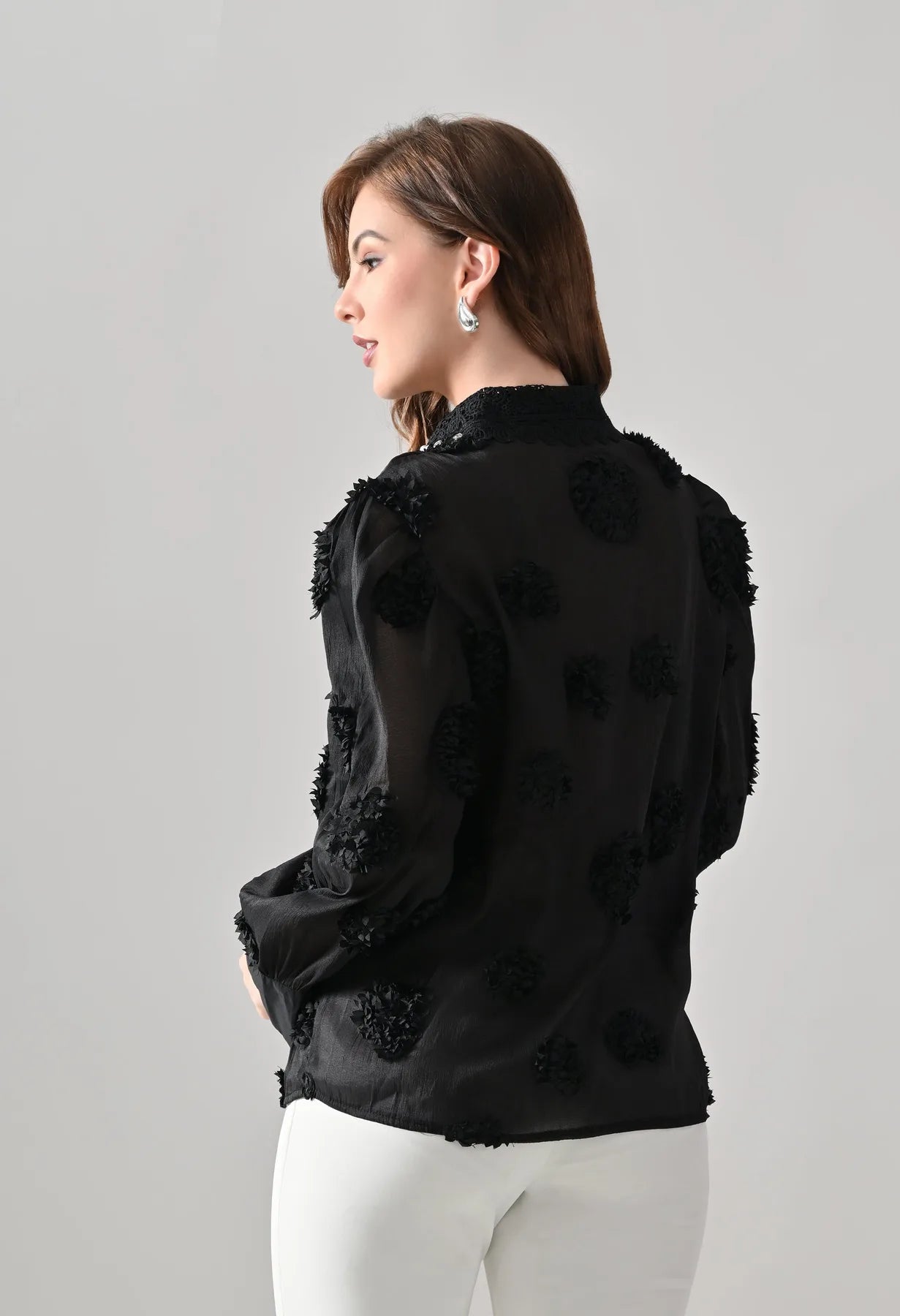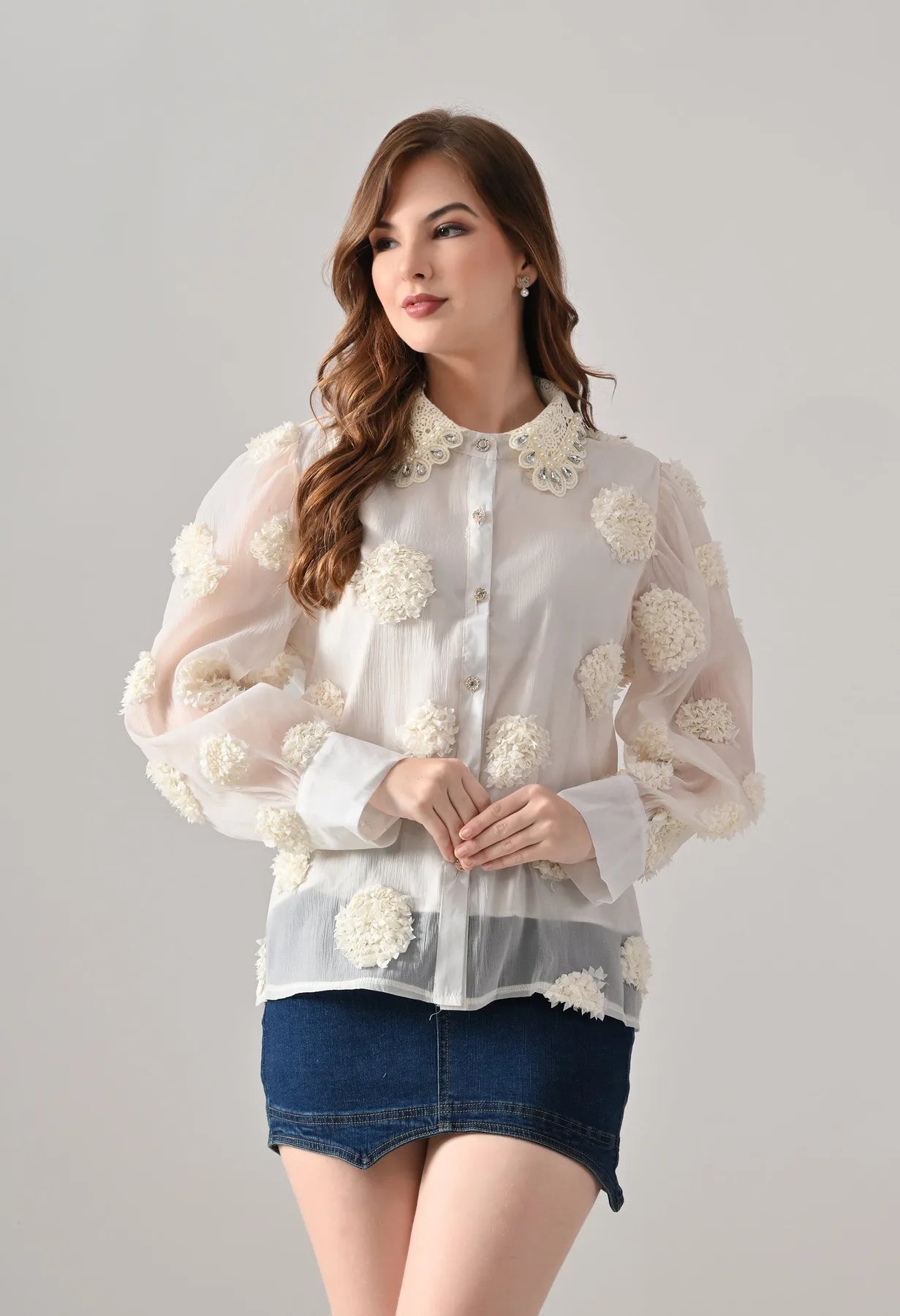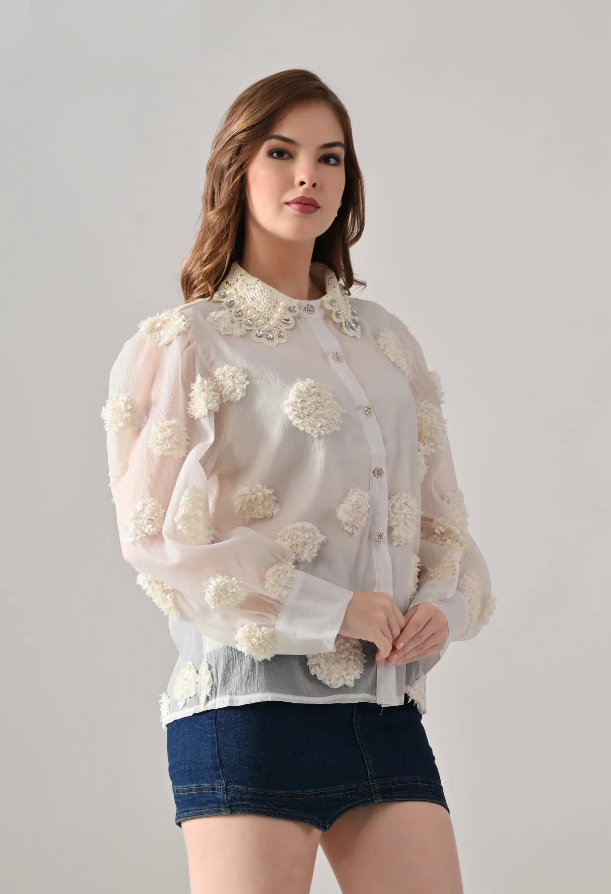 Add a touch of elegance to your wardrobe with this blush shirt featuring delicate 3D floral appliqué detailing and sheer long sleeves. The embellished pearl and stone collar adds a luxe finish, while crystal button closures bring subtle sparkle. Perfect for pairing with tailored pants or skirts, this shirt blends feminine charm with contemporary sophistication.