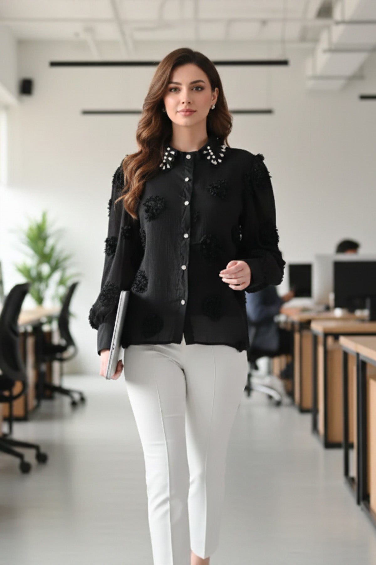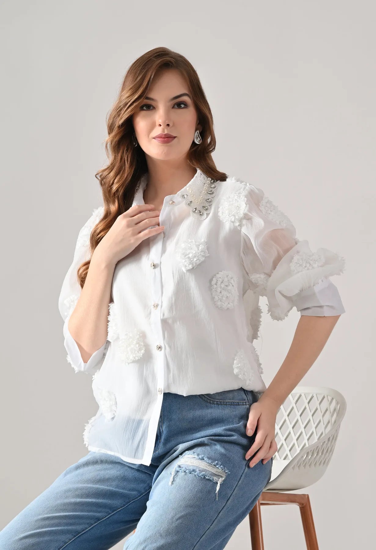 Meet the shirt that does not believe in blending in. Designed with intricate 3D floral trims and a stunning pearl-and-stone embellished collar, this statement piece is a guaranteed head-turner for any occasion.