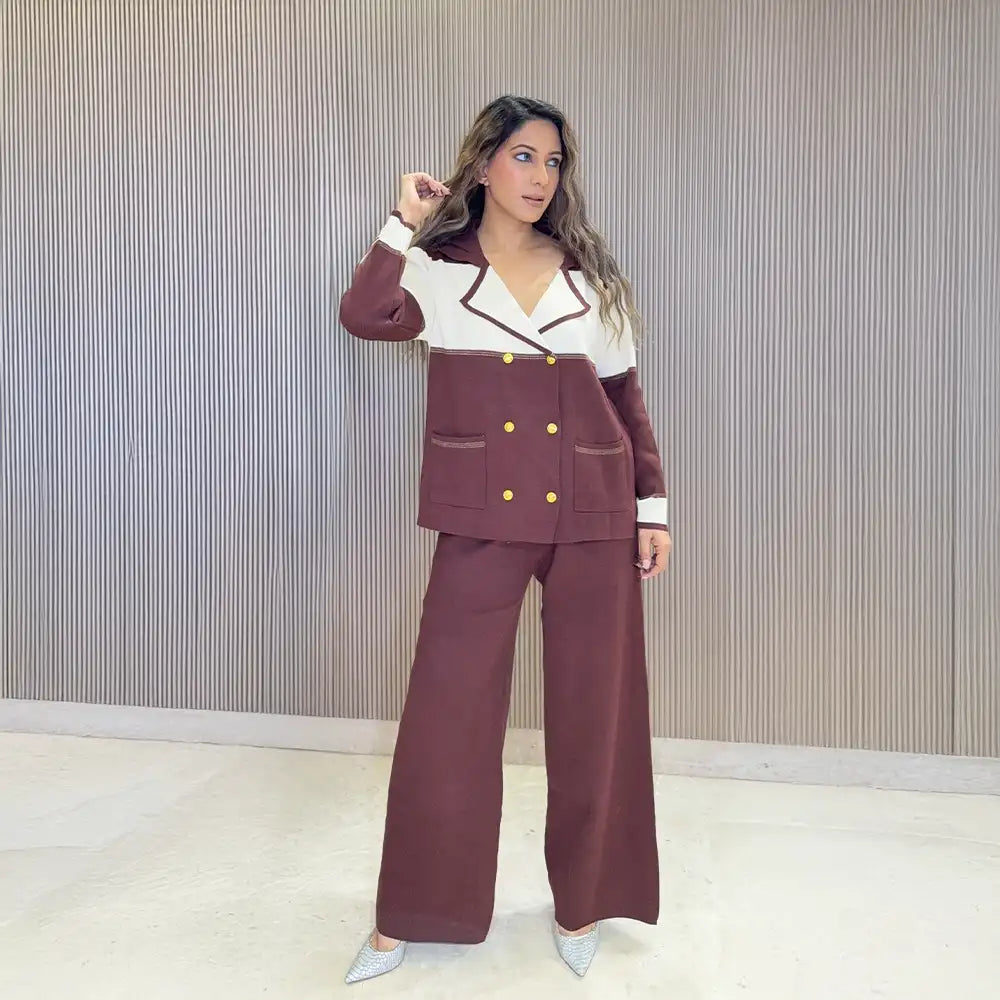 This soft-knitted winter co-ord set is designed to offer warmth without compromising on structure. The double-breasted design adds a tailored edge, completed with polished gold buttons. Versatile and gracefully balanced, it’s the perfect choice for everything from a brunch outing to your 9-to-5 meetings.