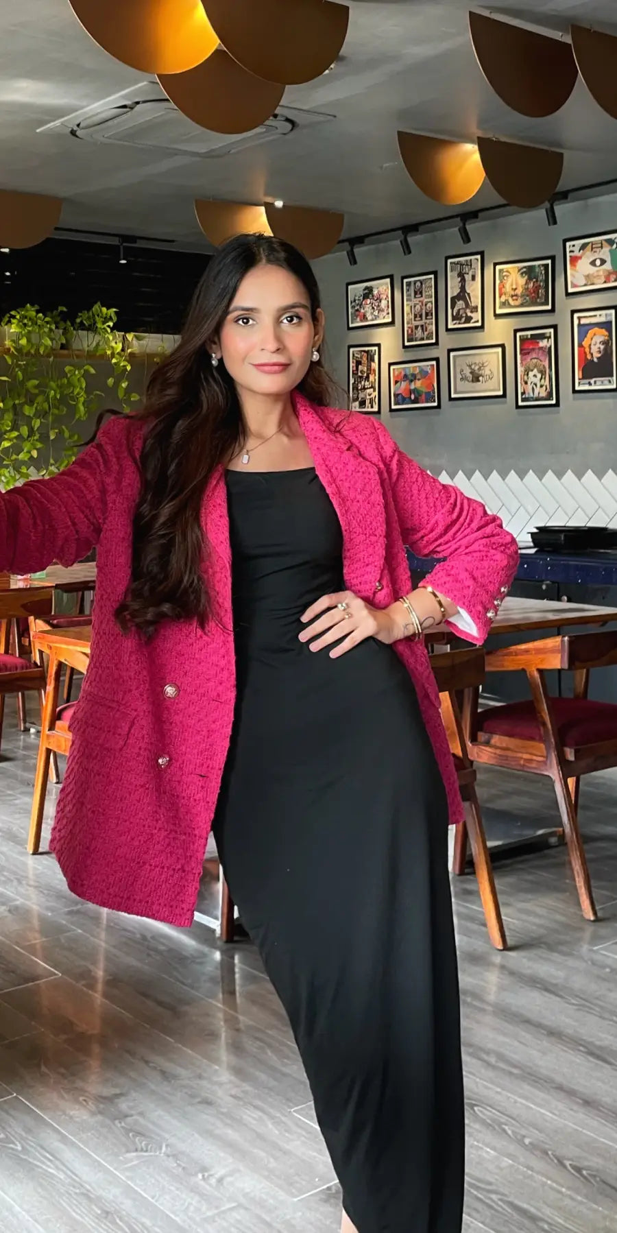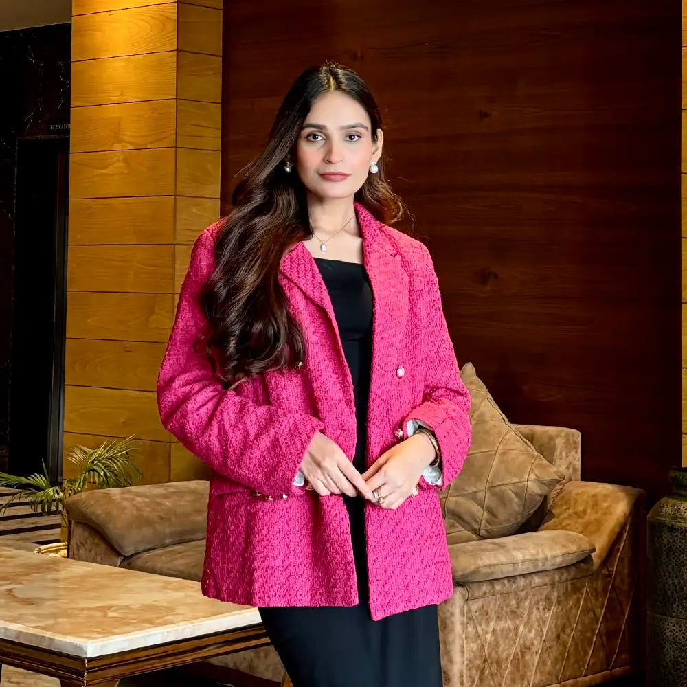 This blazer is crafted in a rich tweed texture and features a classic double-breasted front with polished gold buttons for a refined finish. The structured silhouette and vibrant colours feel both classy and modern making it stand out. Perfect for evenings where you want to shake things up.