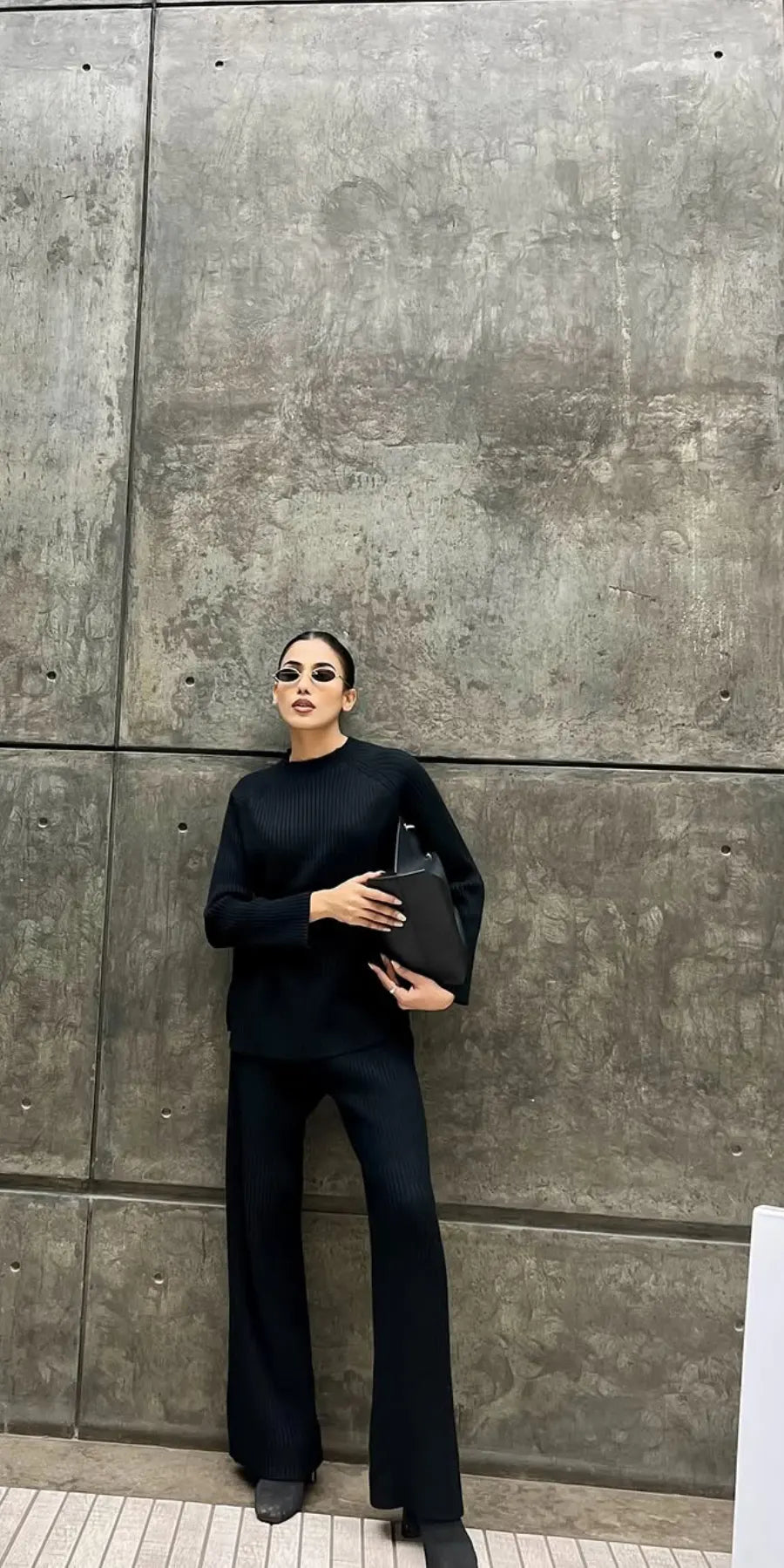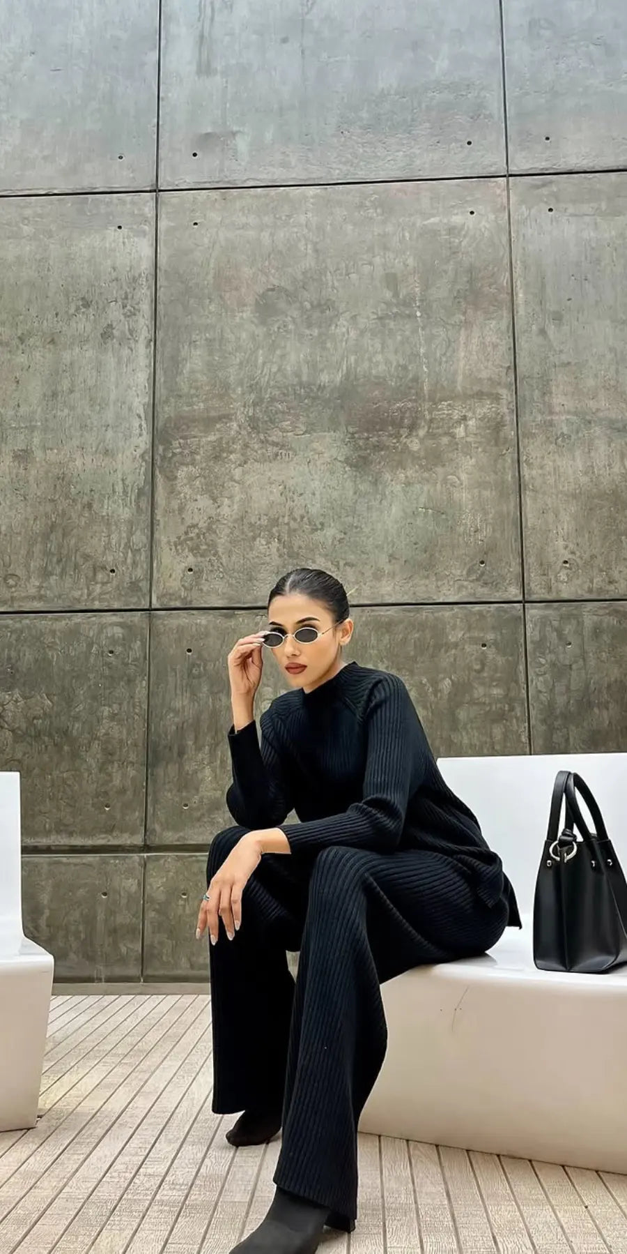 This soft, rib-knit co-ord is a winter essential you’ll want to live in - a clean, minimal silhouette that keeps you warm without feeling bulky. With its high-neck top and wide-leg pants, the set feels instantly put-together. Your comfy airport look? Sorted!