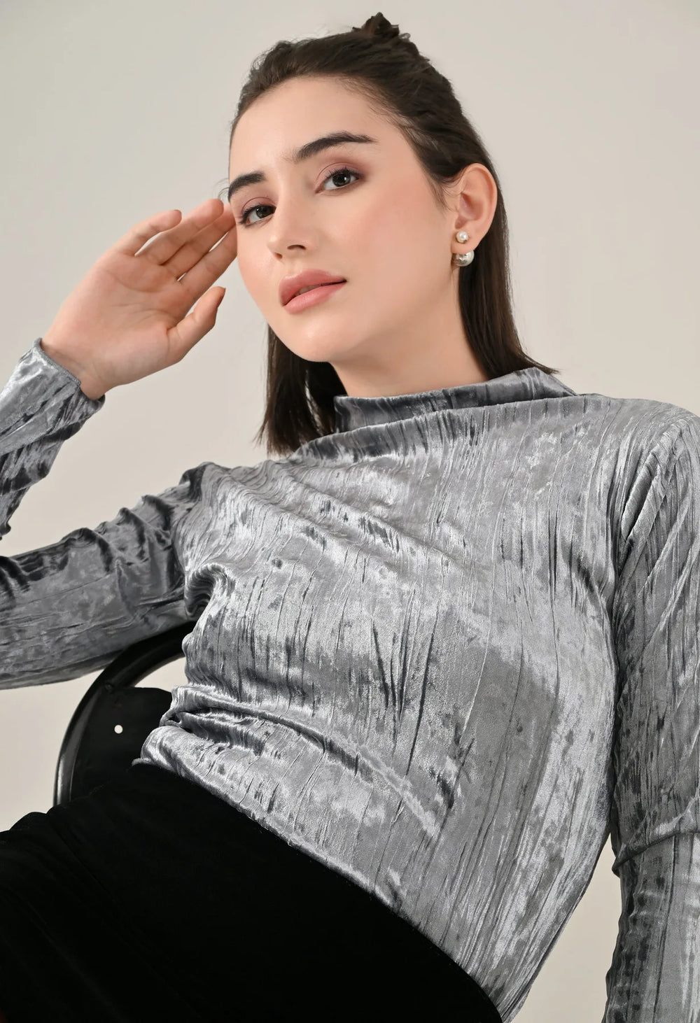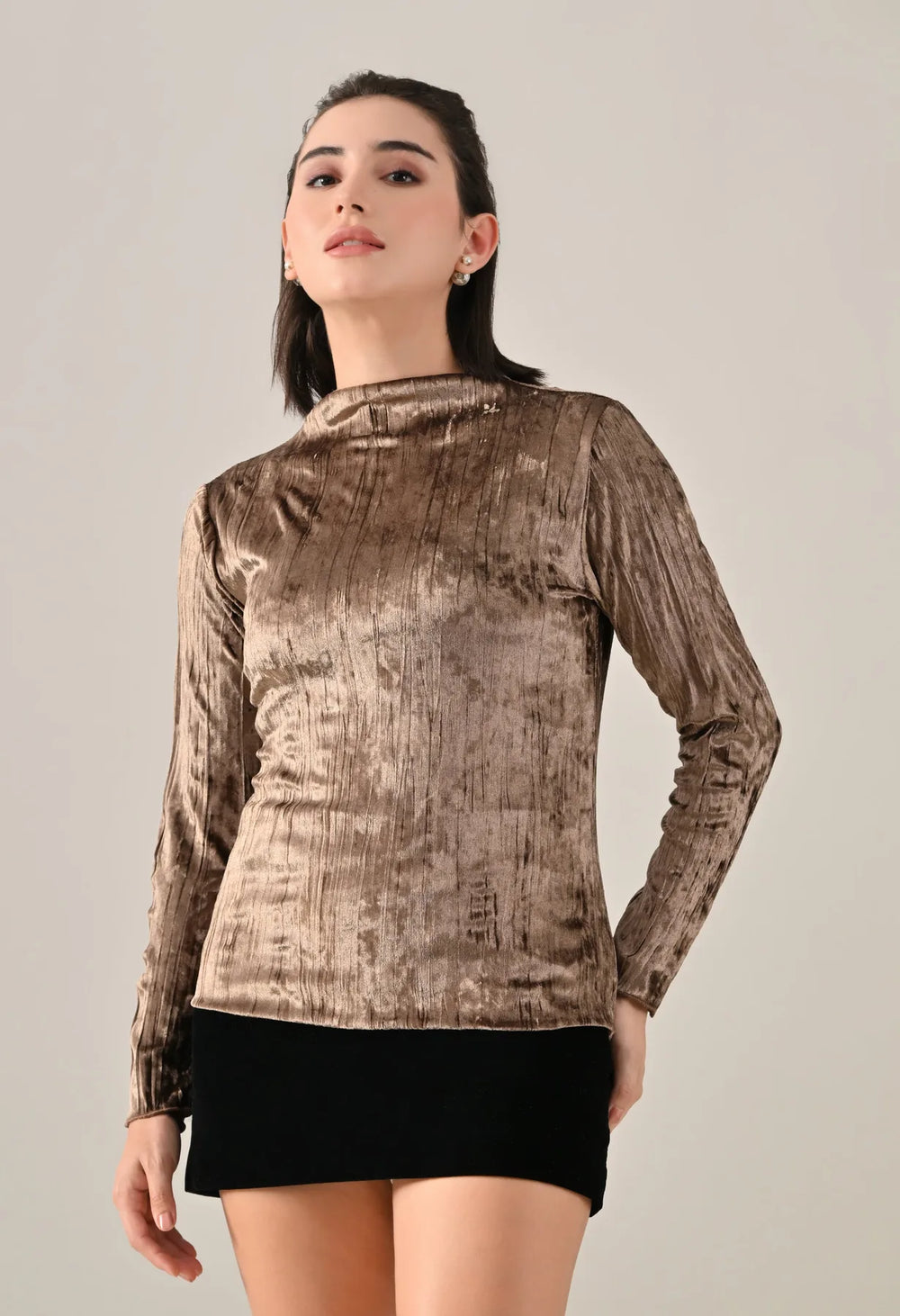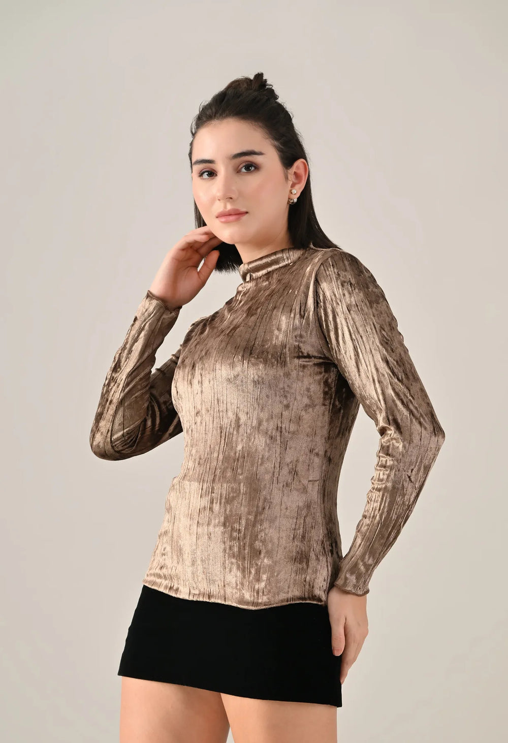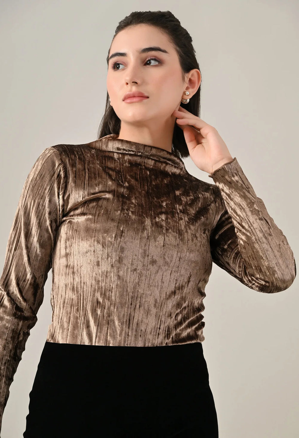 Stay effortlessly stylish with this solid velvet top featuring a high neckline and long fitted sleeves. Designed with baby overlock detailing at the hem and sleeve openings, it adds a subtle touch of texture to the classic silhouette. The regular hem and soft, stretchable crush velvet fabric ensure a cozy and comfortable fit, making it perfect for both casual outings and relaxed days.