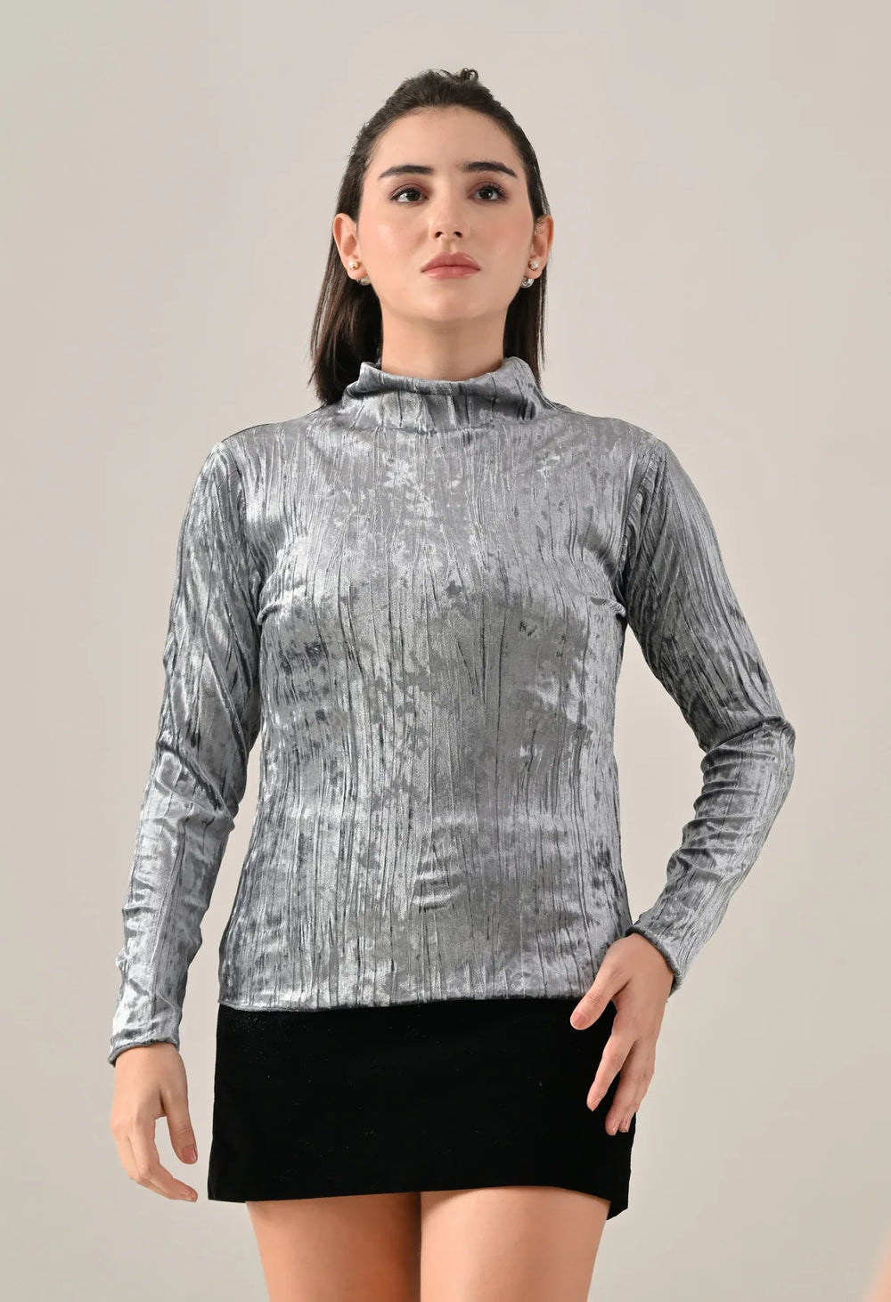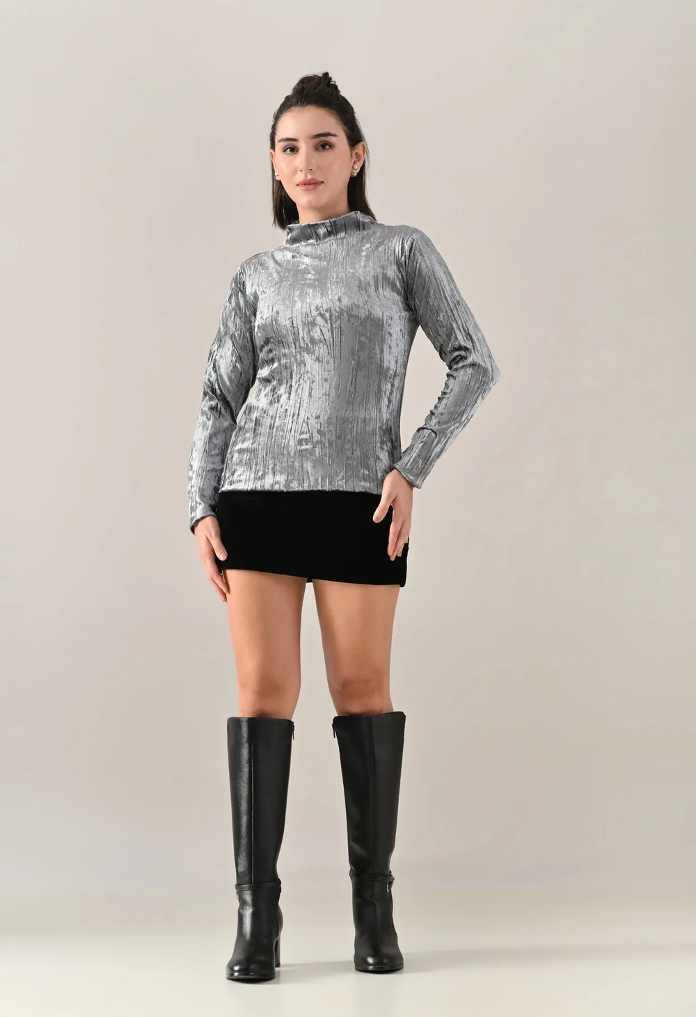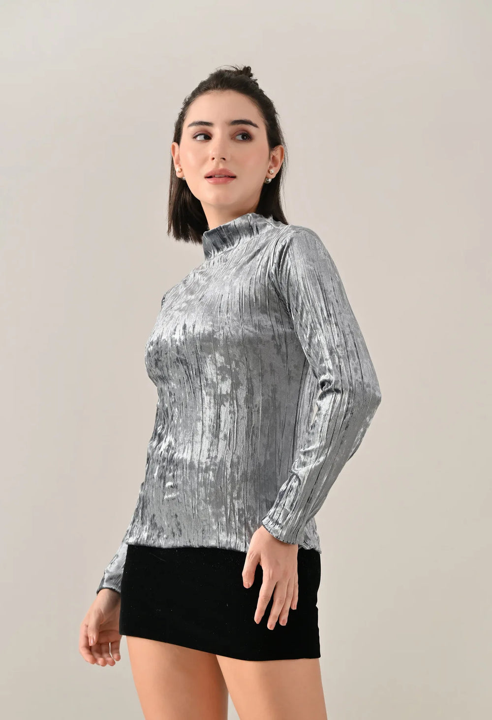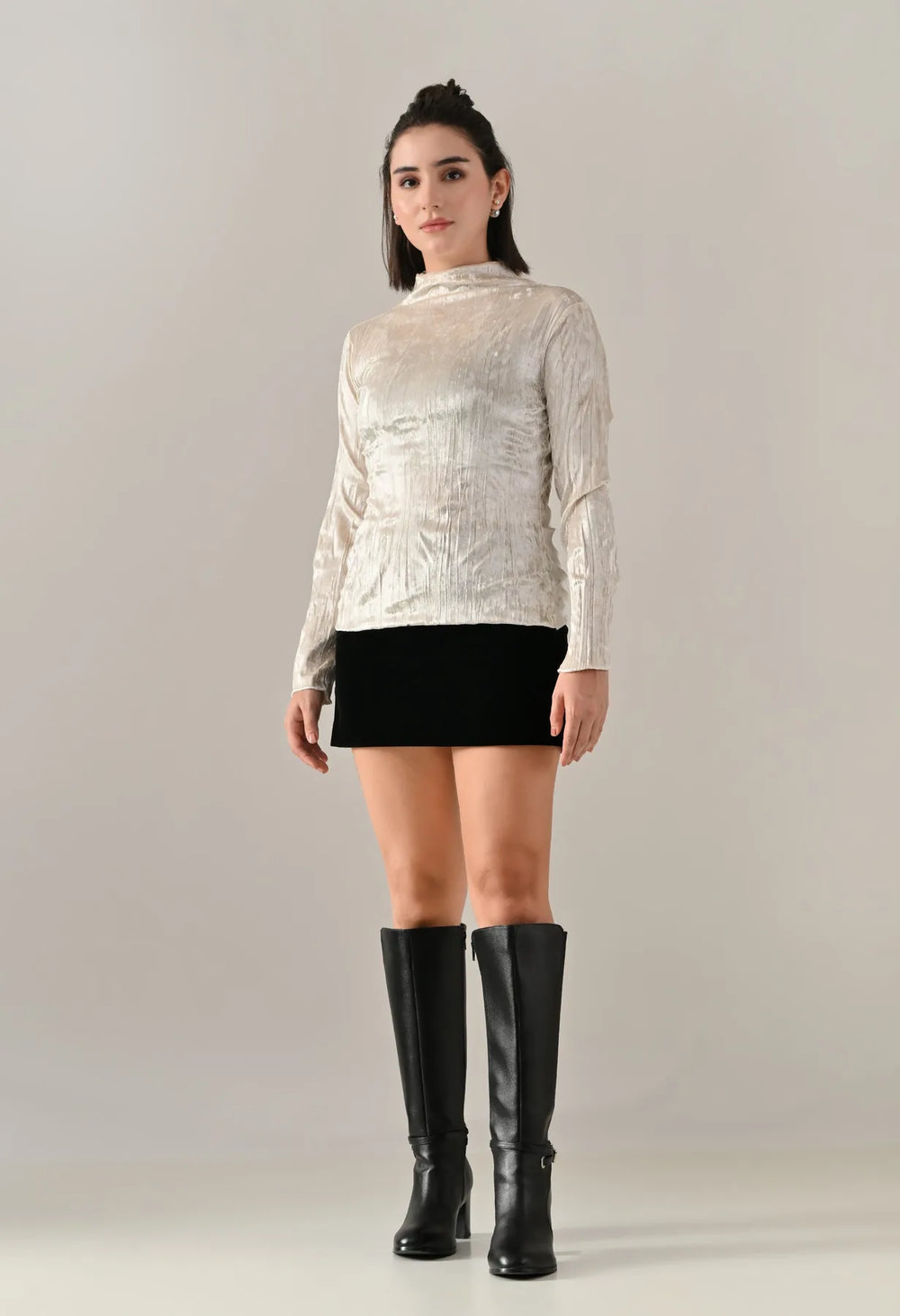 Stay effortlessly stylish with this solid velvet top featuring a high neckline and long fitted sleeves. Designed with baby overlock detailing at the hem and sleeve openings, it adds a subtle touch of texture to the classic silhouette. The regular hem and soft, stretchable crush velvet fabric ensure a cozy and comfortable fit, making it perfect for both casual outings and relaxed days.