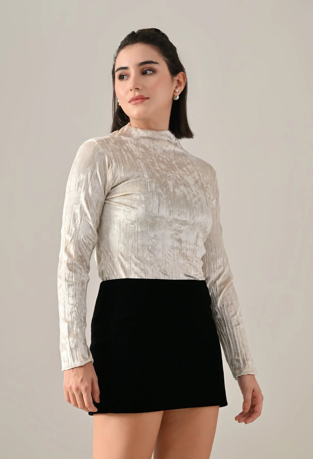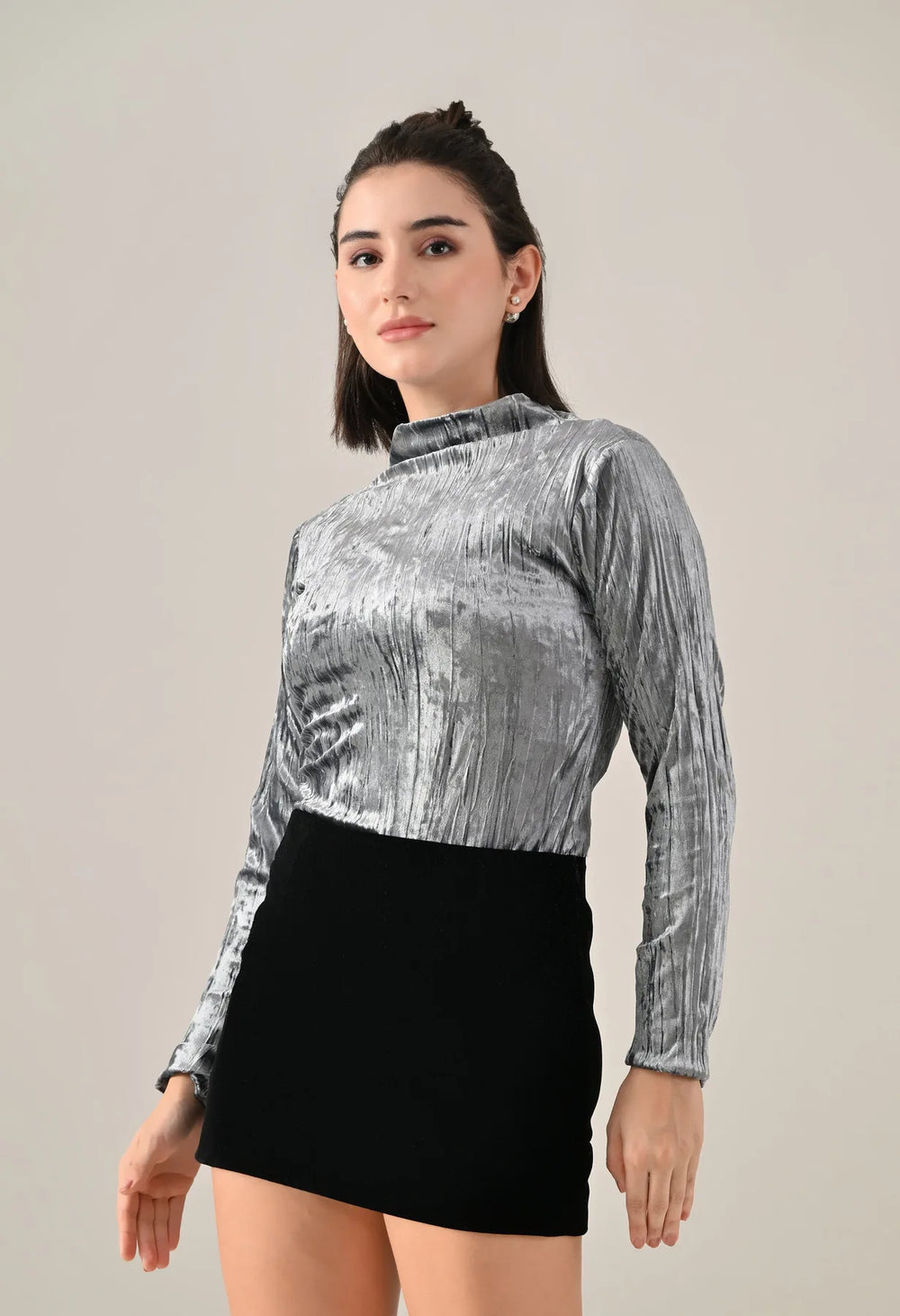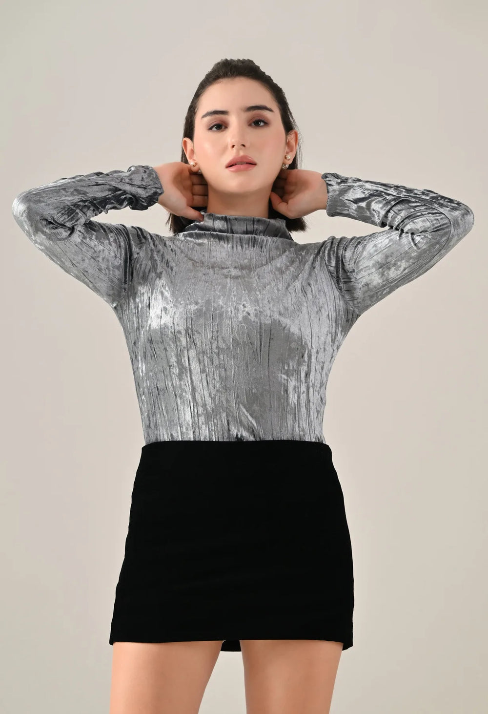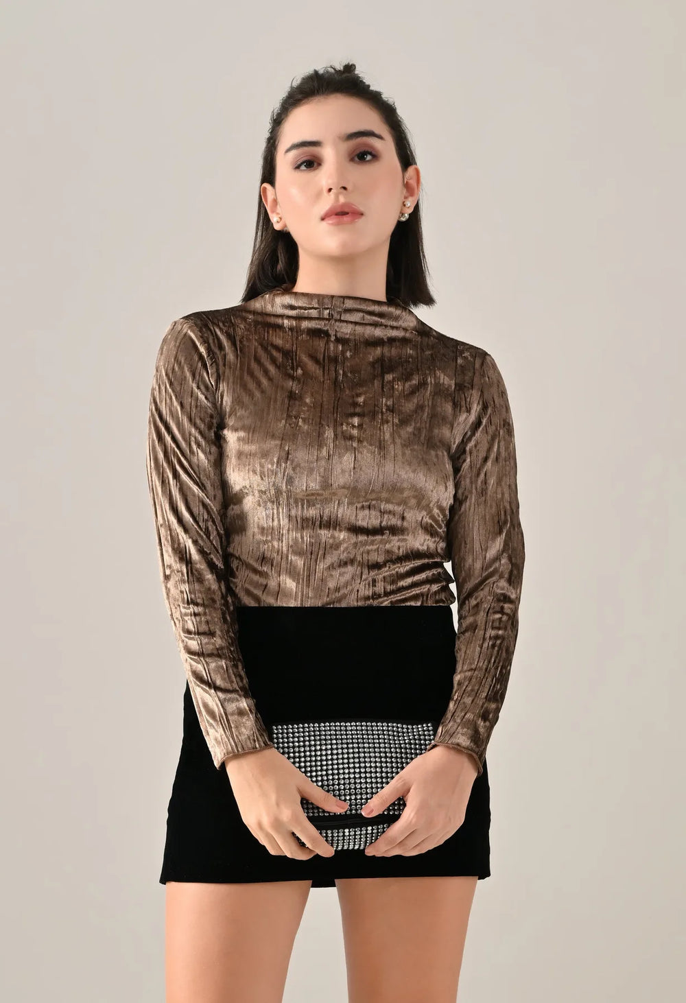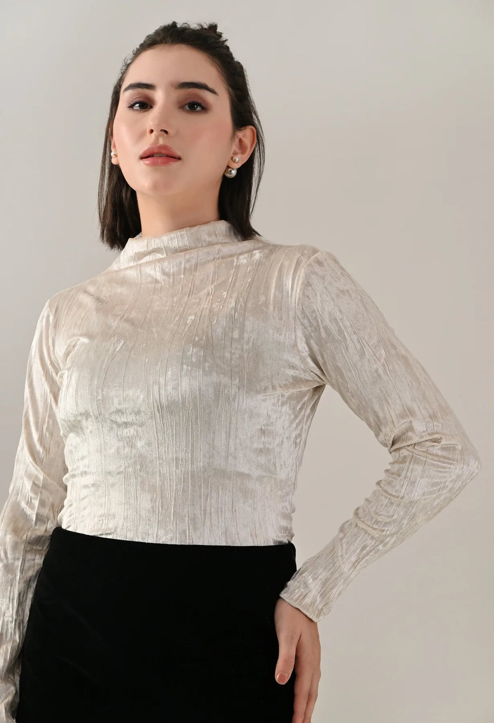 Stay effortlessly stylish with this solid velvet top featuring a high neckline and long fitted sleeves. Designed with baby overlock detailing at the hem and sleeve openings, it adds a subtle touch of texture to the classic silhouette. The regular hem and soft, stretchable crush velvet fabric ensure a cozy and comfortable fit, making it perfect for both casual outings and relaxed days.