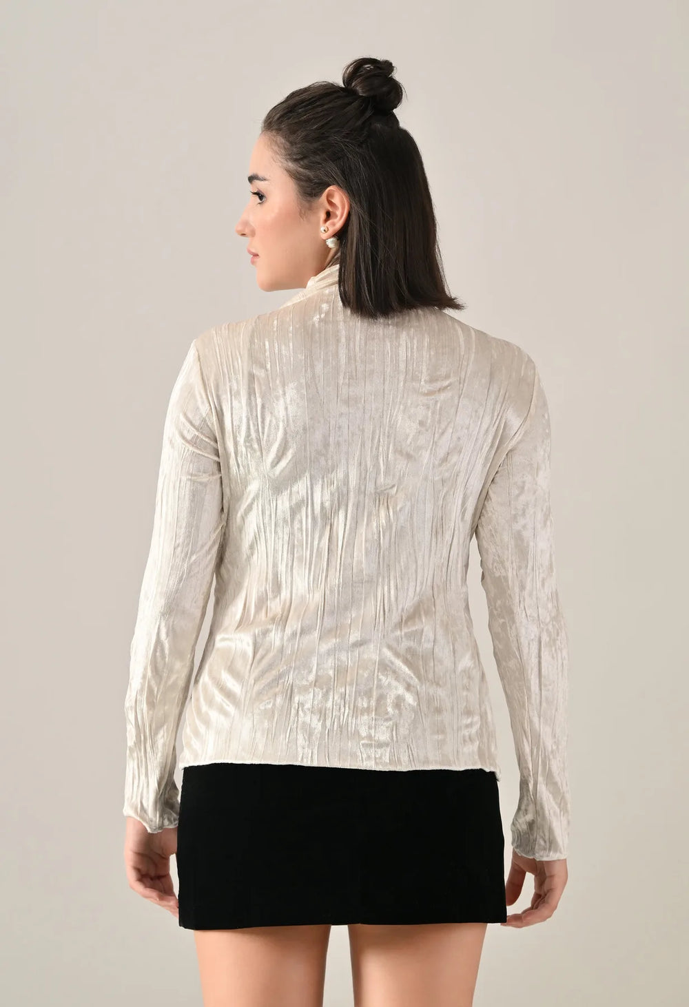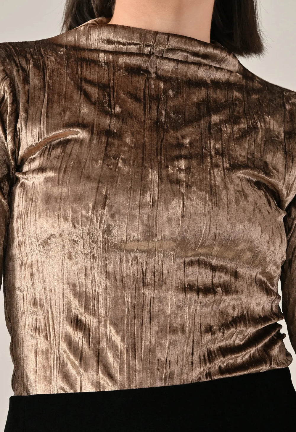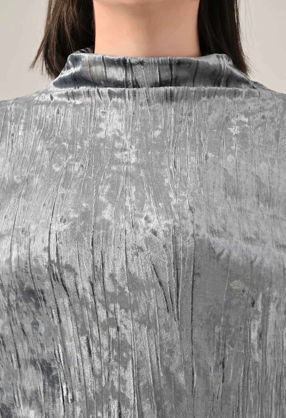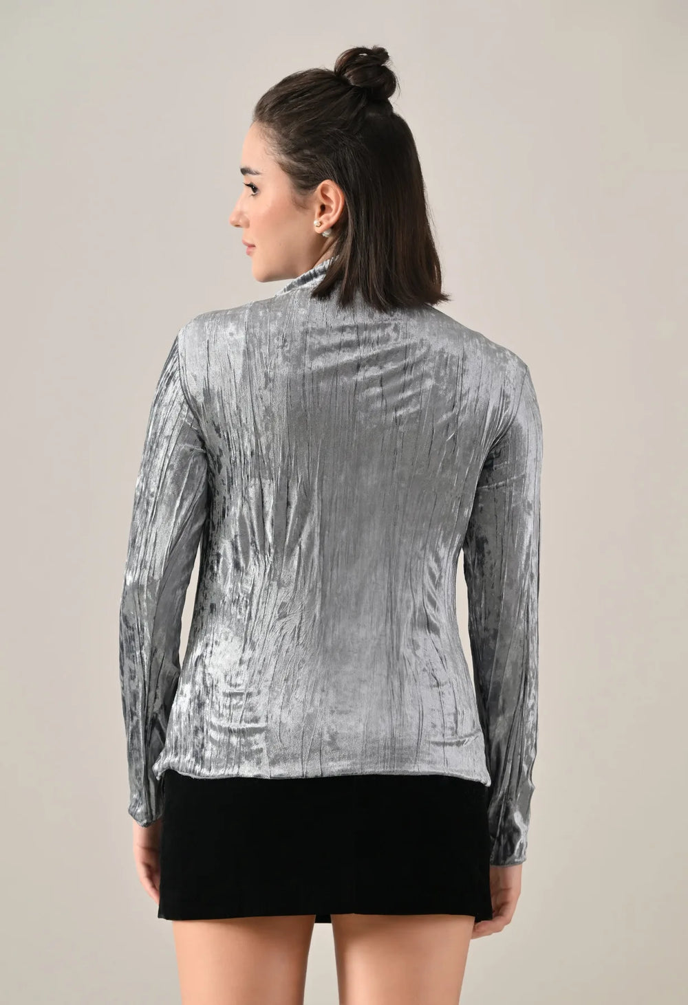 Stay effortlessly stylish with this solid velvet top featuring a high neckline and long fitted sleeves. Designed with baby overlock detailing at the hem and sleeve openings, it adds a subtle touch of texture to the classic silhouette. The regular hem and soft, stretchable crush velvet fabric ensure a cozy and comfortable fit, making it perfect for both casual outings and relaxed days.