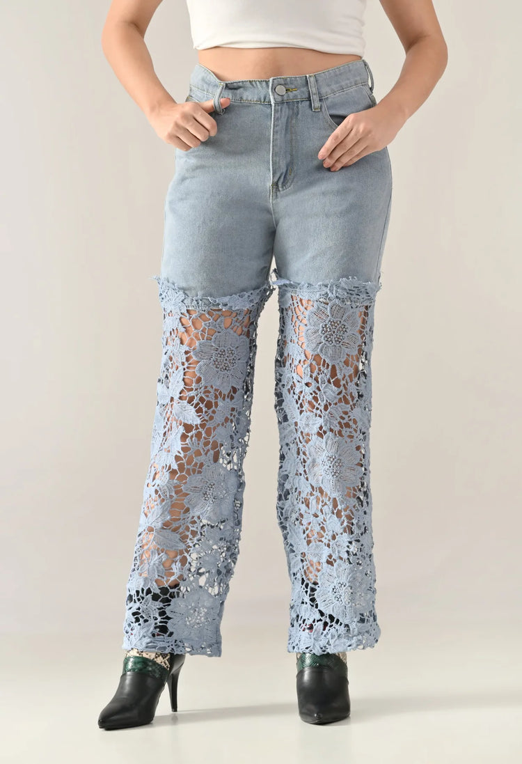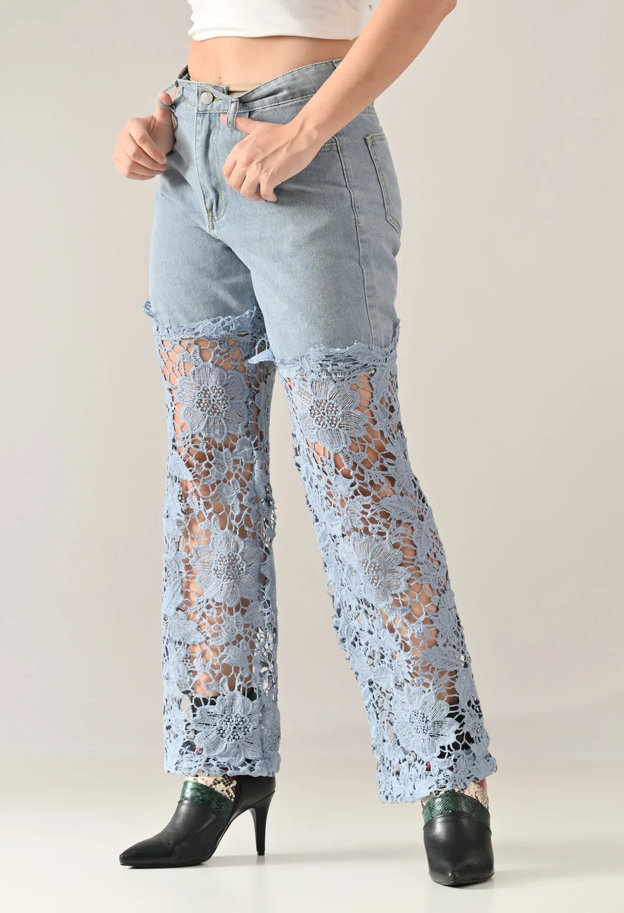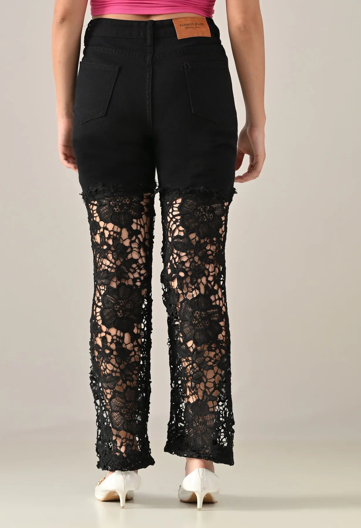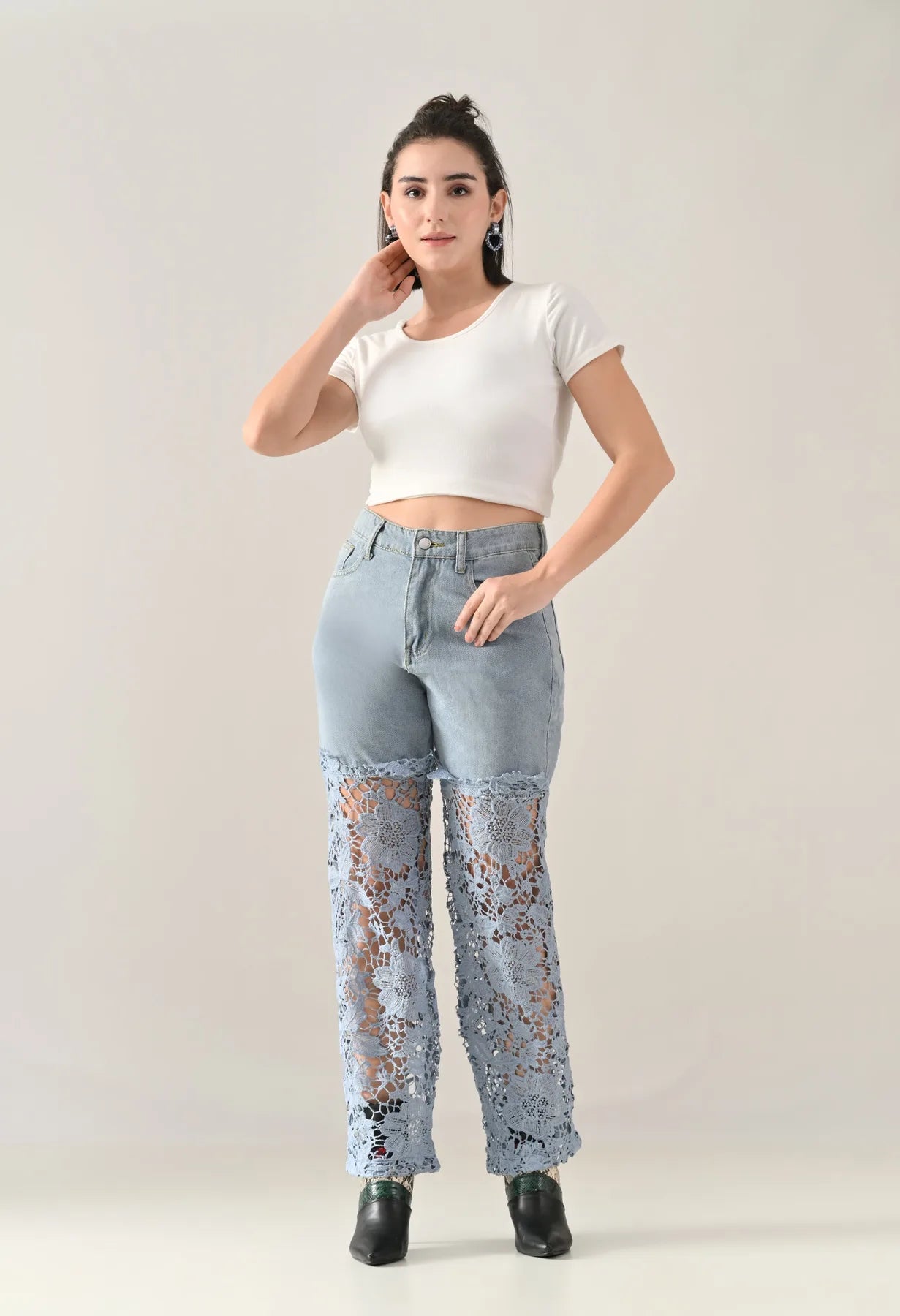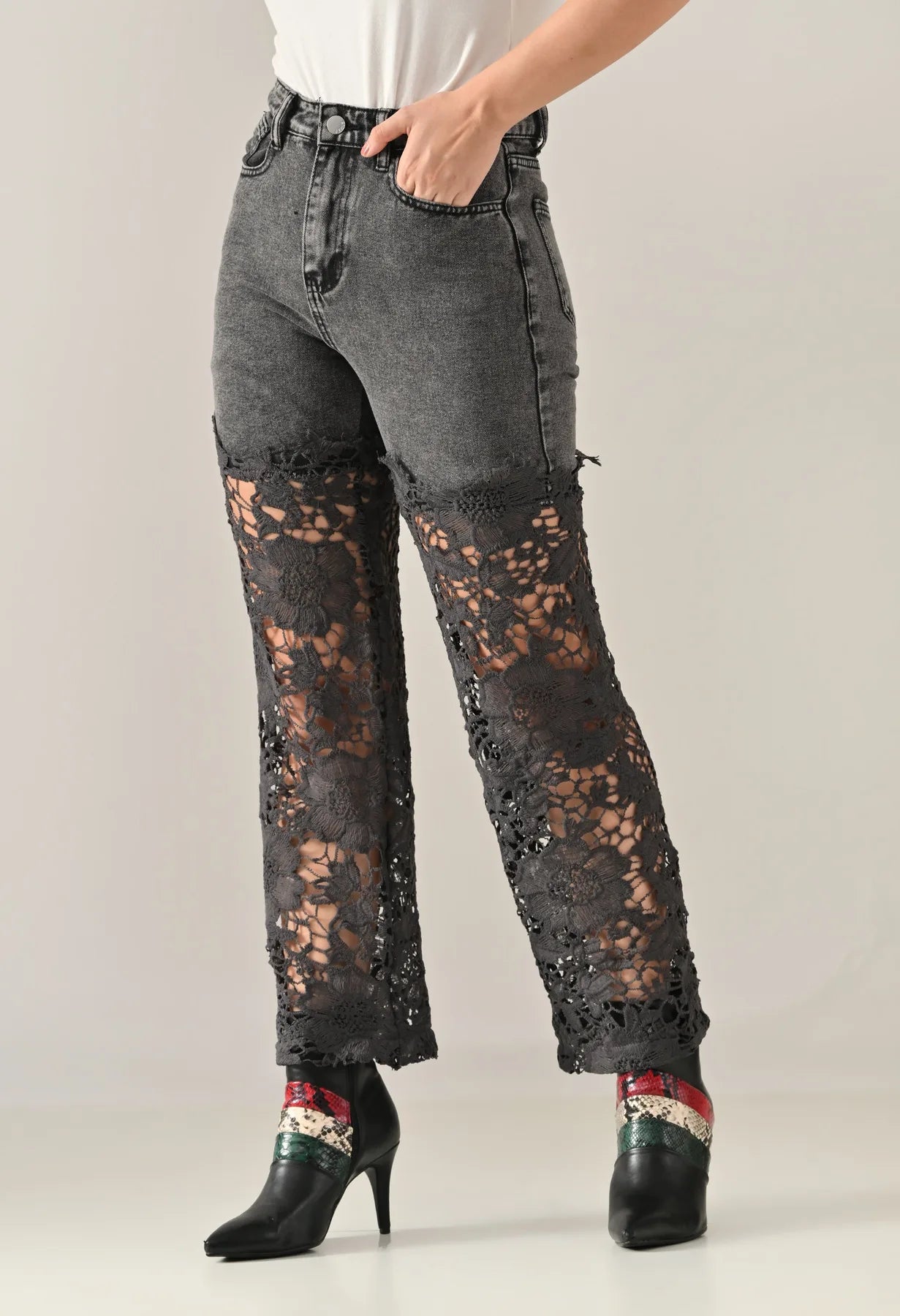 Elevate your denim style with these enzyme-wash jeans featuring a waistband with open fly and silver shank button. Designed with five belt loops and a PU patch at the waist for a classic touch. Includes two front and back pockets with a coin pocket for added functionality. The highlight of the design is the floral lace detailing from mid-thigh down to the ankle, adding a feminine and elegant twist to the rugged denim look. Finished with contrast stitching, this pair offers a soft, comfortable, and stretchable fit, perfect for chic everyday wear.