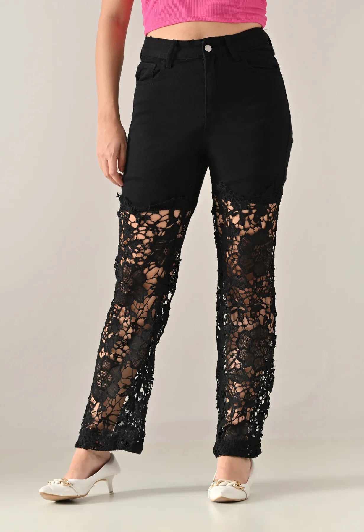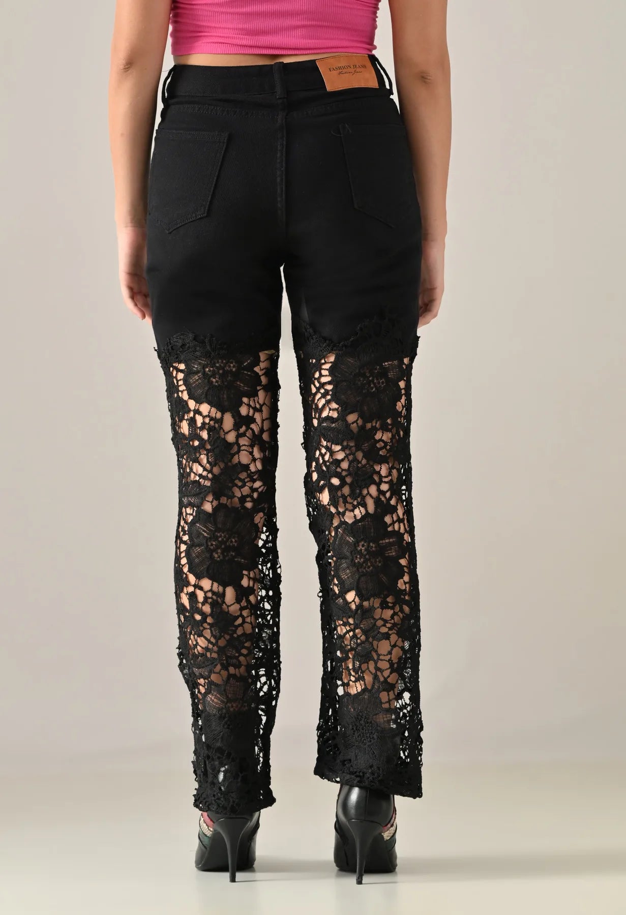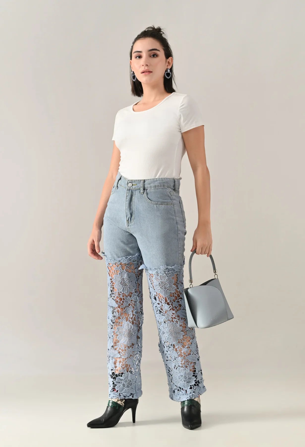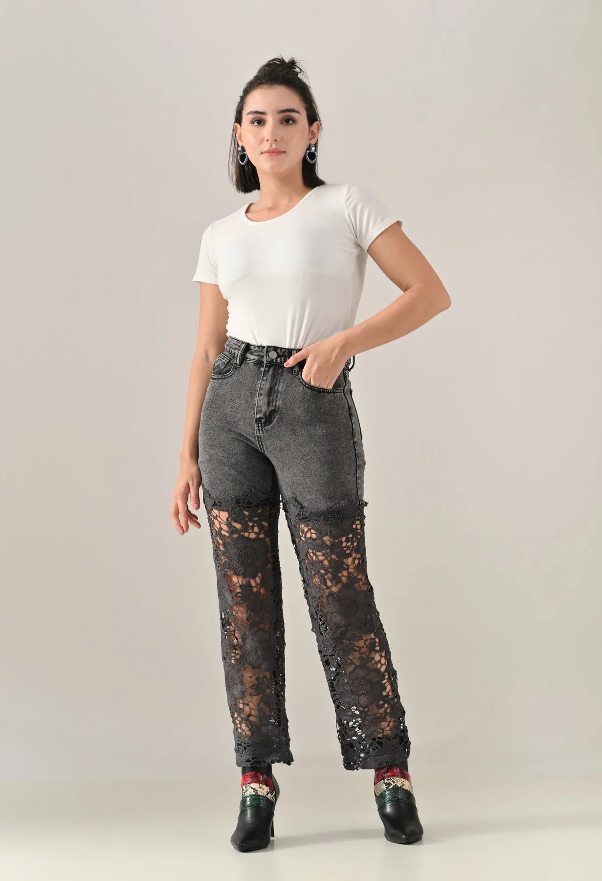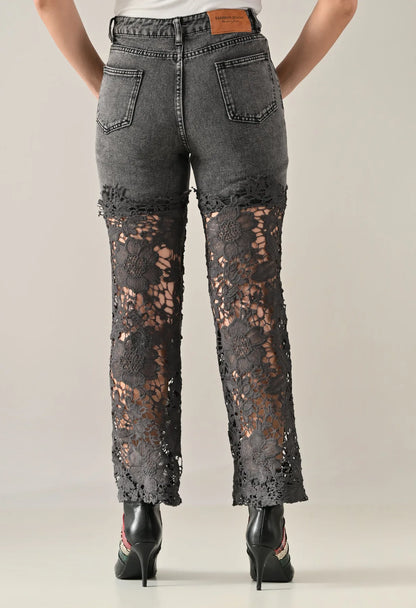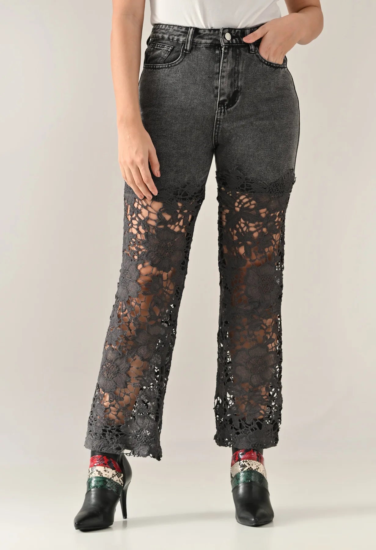 Elevate your denim style with these enzyme-wash jeans featuring a waistband with open fly and silver shank button. Designed with five belt loops and a PU patch at the waist for a classic touch. Includes two front and back pockets with a coin pocket for added functionality. The highlight of the design is the floral lace detailing from mid-thigh down to the ankle, adding a feminine and elegant twist to the rugged denim look. Finished with contrast stitching, this pair offers a soft, comfortable, and stretchable fit, perfect for chic everyday wear.