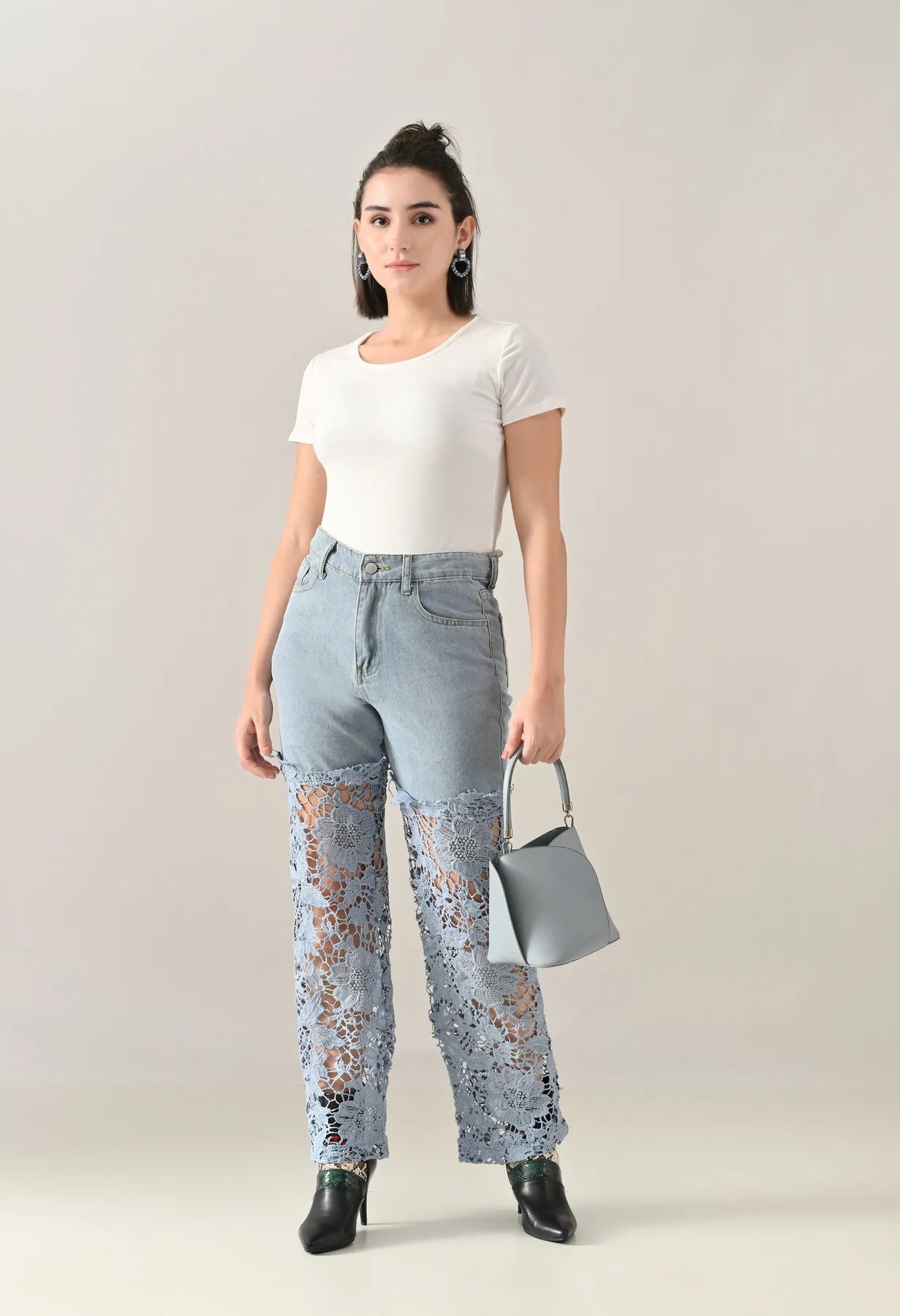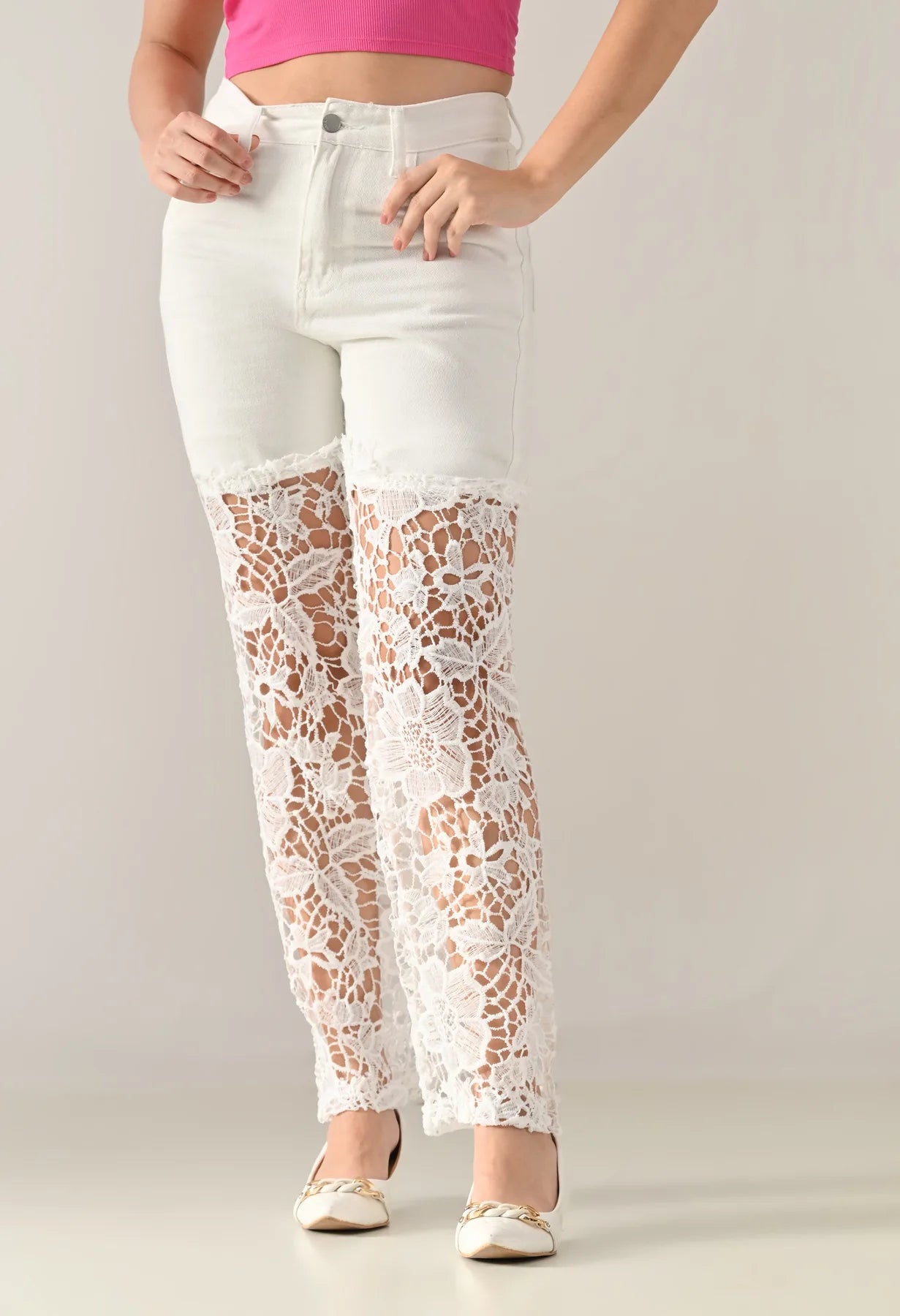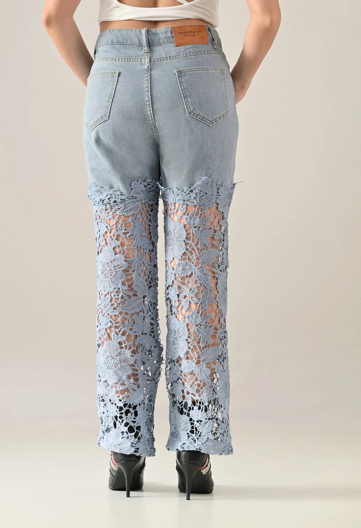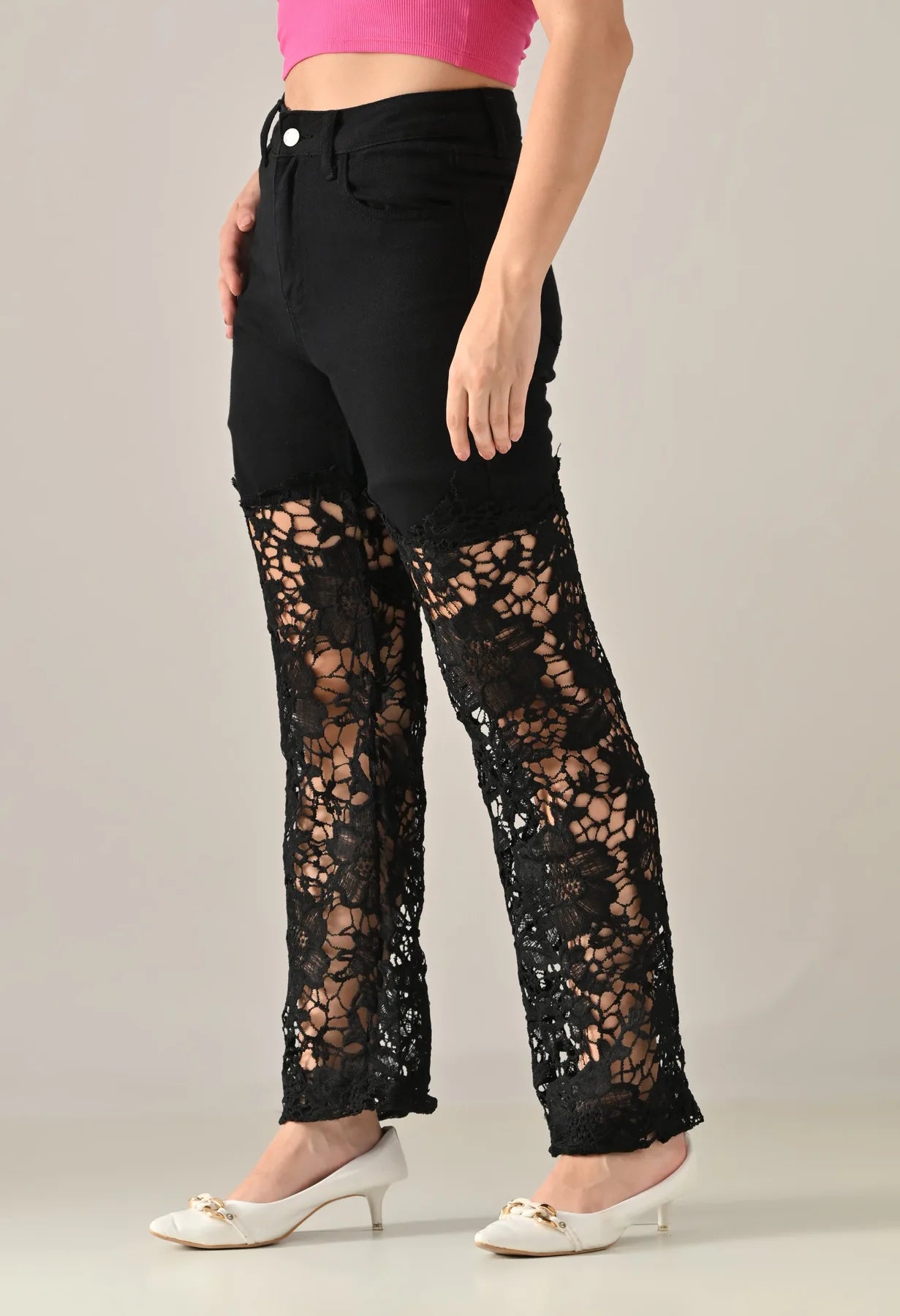 Elevate your denim style with these enzyme-wash jeans featuring a waistband with open fly and silver shank button. Designed with five belt loops and a PU patch at the waist for a classic touch. Includes two front and back pockets with a coin pocket for added functionality. The highlight of the design is the floral lace detailing from mid-thigh down to the ankle, adding a feminine and elegant twist to the rugged denim look. Finished with contrast stitching, this pair offers a soft, comfortable, and stretchable fit, perfect for chic everyday wear.