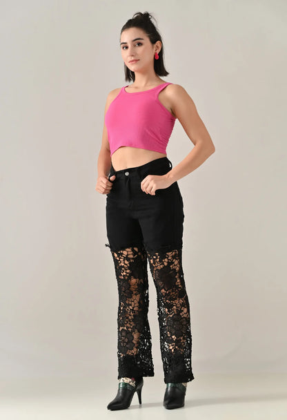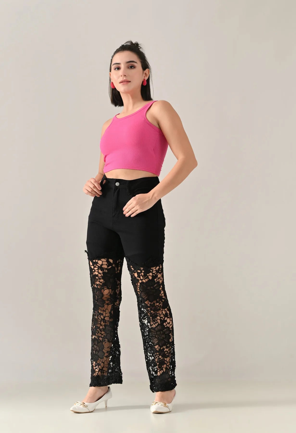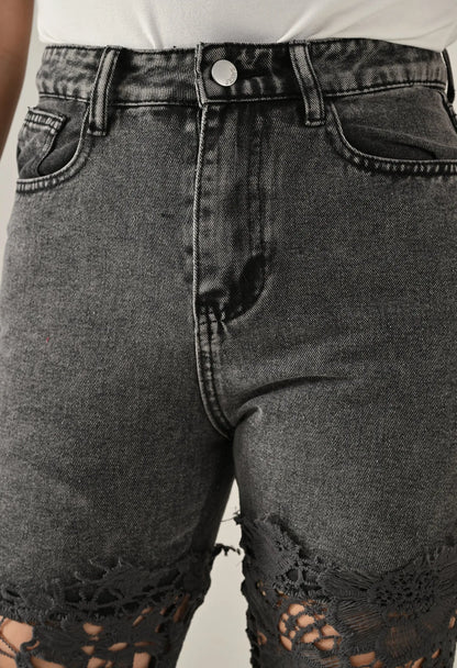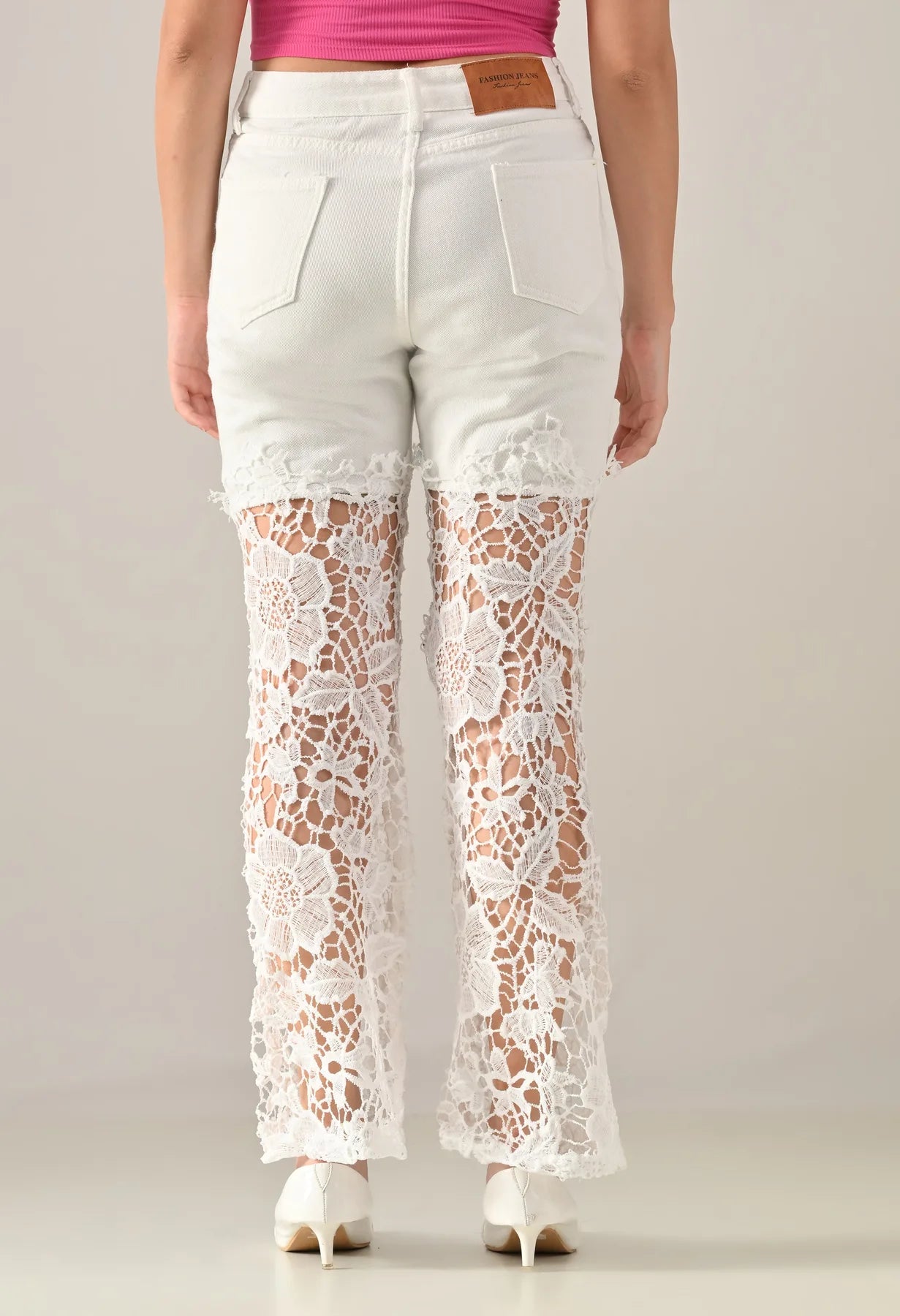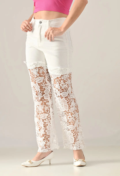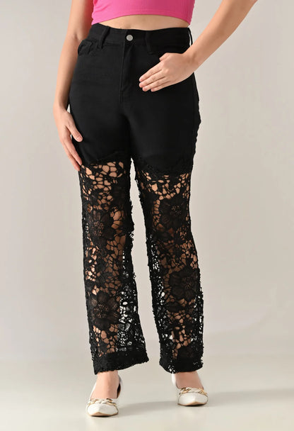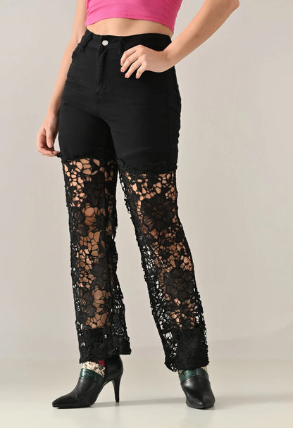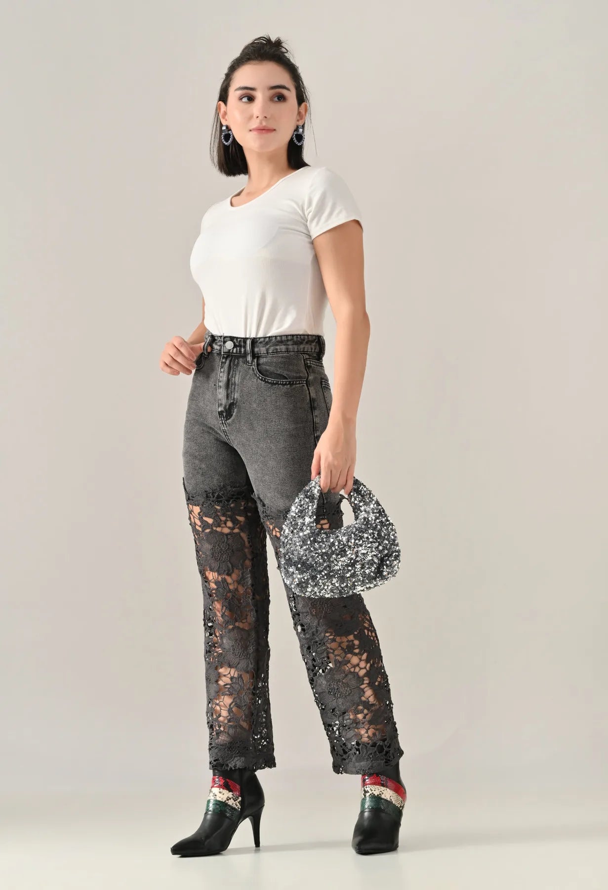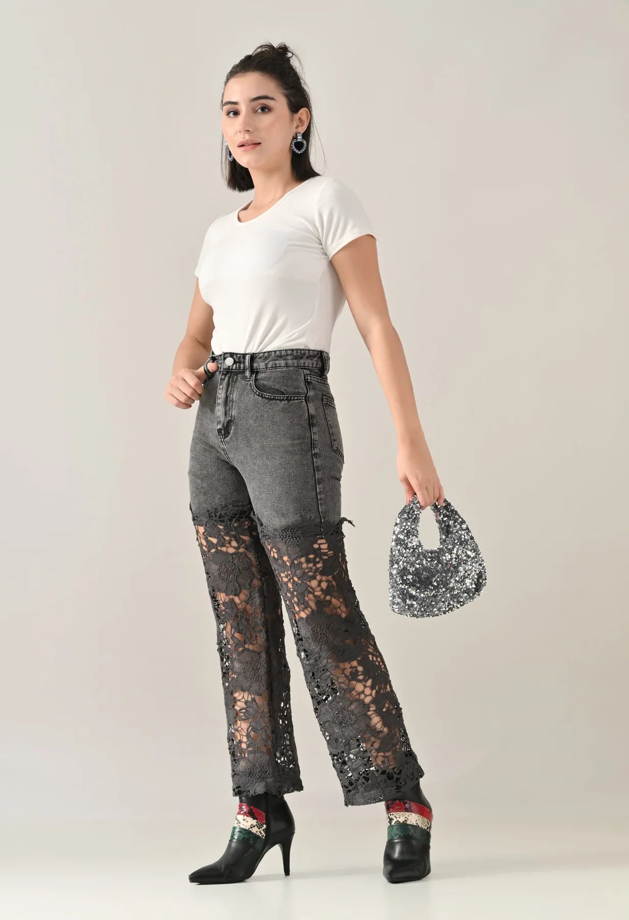 Elevate your denim style with these enzyme-wash jeans featuring a waistband with open fly and silver shank button. Designed with five belt loops and a PU patch at the waist for a classic touch. Includes two front and back pockets with a coin pocket for added functionality. The highlight of the design is the floral lace detailing from mid-thigh down to the ankle, adding a feminine and elegant twist to the rugged denim look. Finished with contrast stitching, this pair offers a soft, comfortable, and stretchable fit, perfect for chic everyday wear.