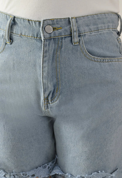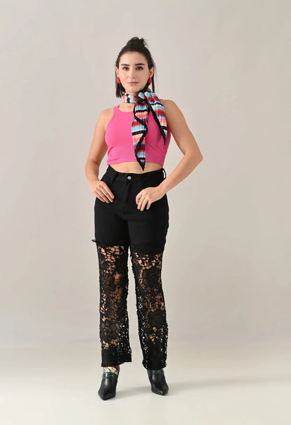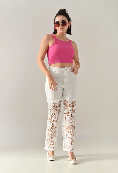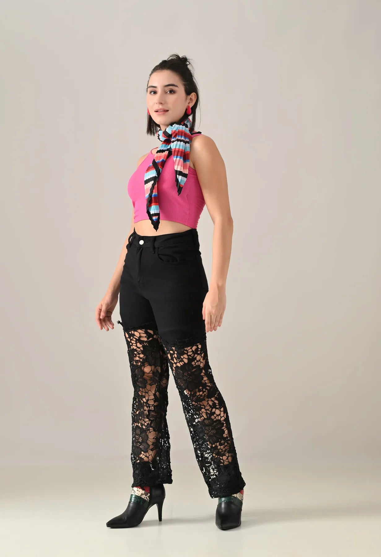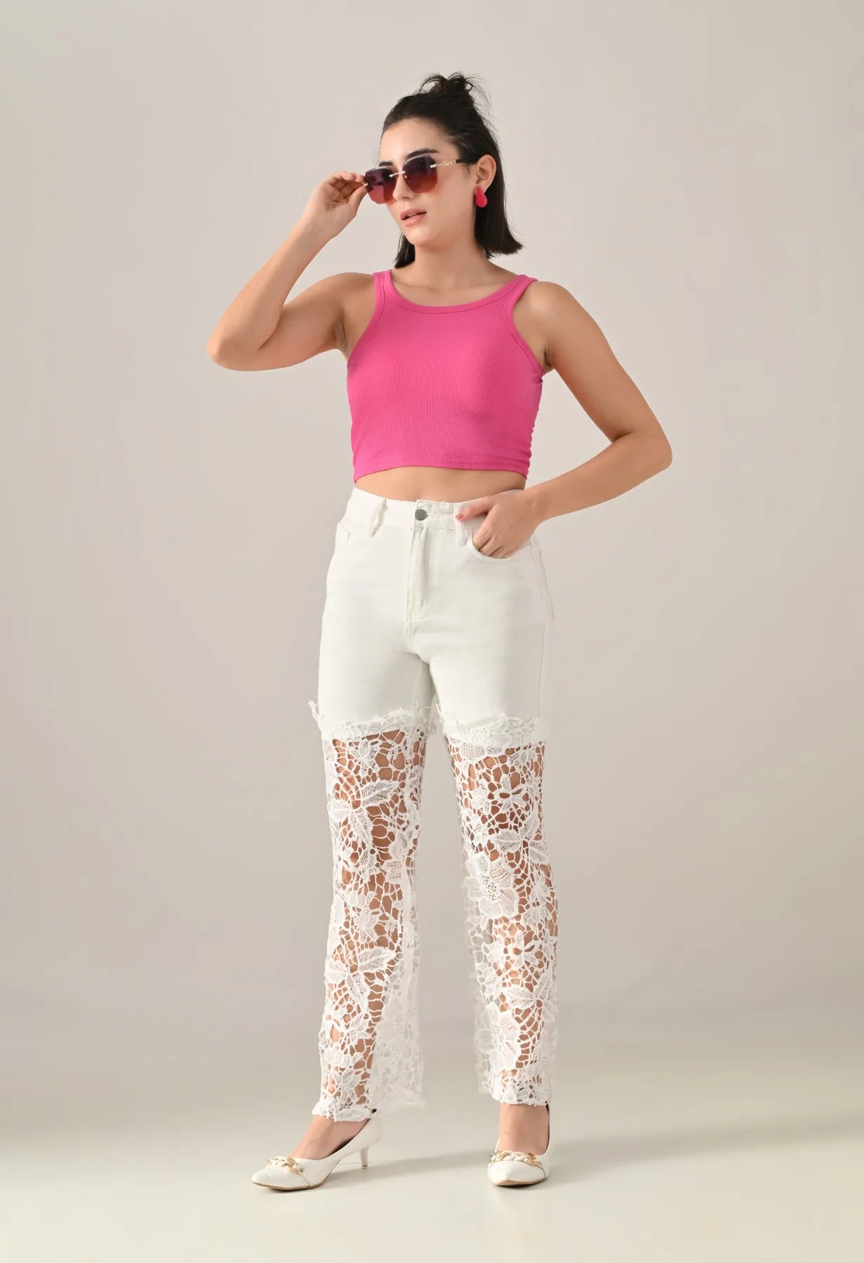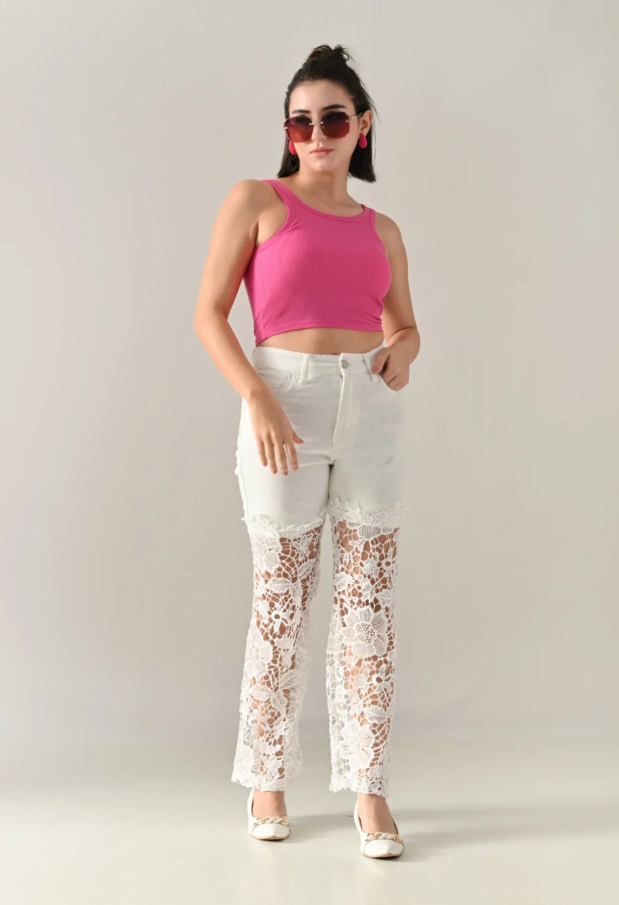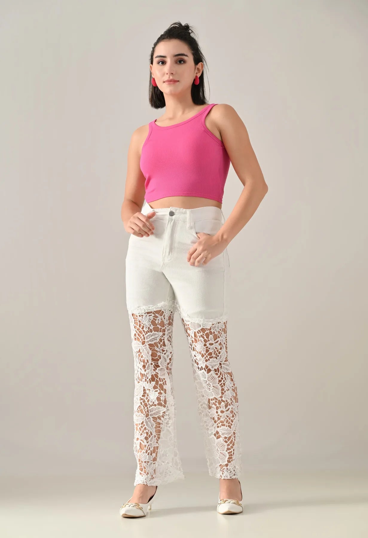 Elevate your denim style with these enzyme-wash jeans featuring a waistband with open fly and silver shank button. Designed with five belt loops and a PU patch at the waist for a classic touch. Includes two front and back pockets with a coin pocket for added functionality. The highlight of the design is the floral lace detailing from mid-thigh down to the ankle, adding a feminine and elegant twist to the rugged denim look. Finished with contrast stitching, this pair offers a soft, comfortable, and stretchable fit, perfect for chic everyday wear.
