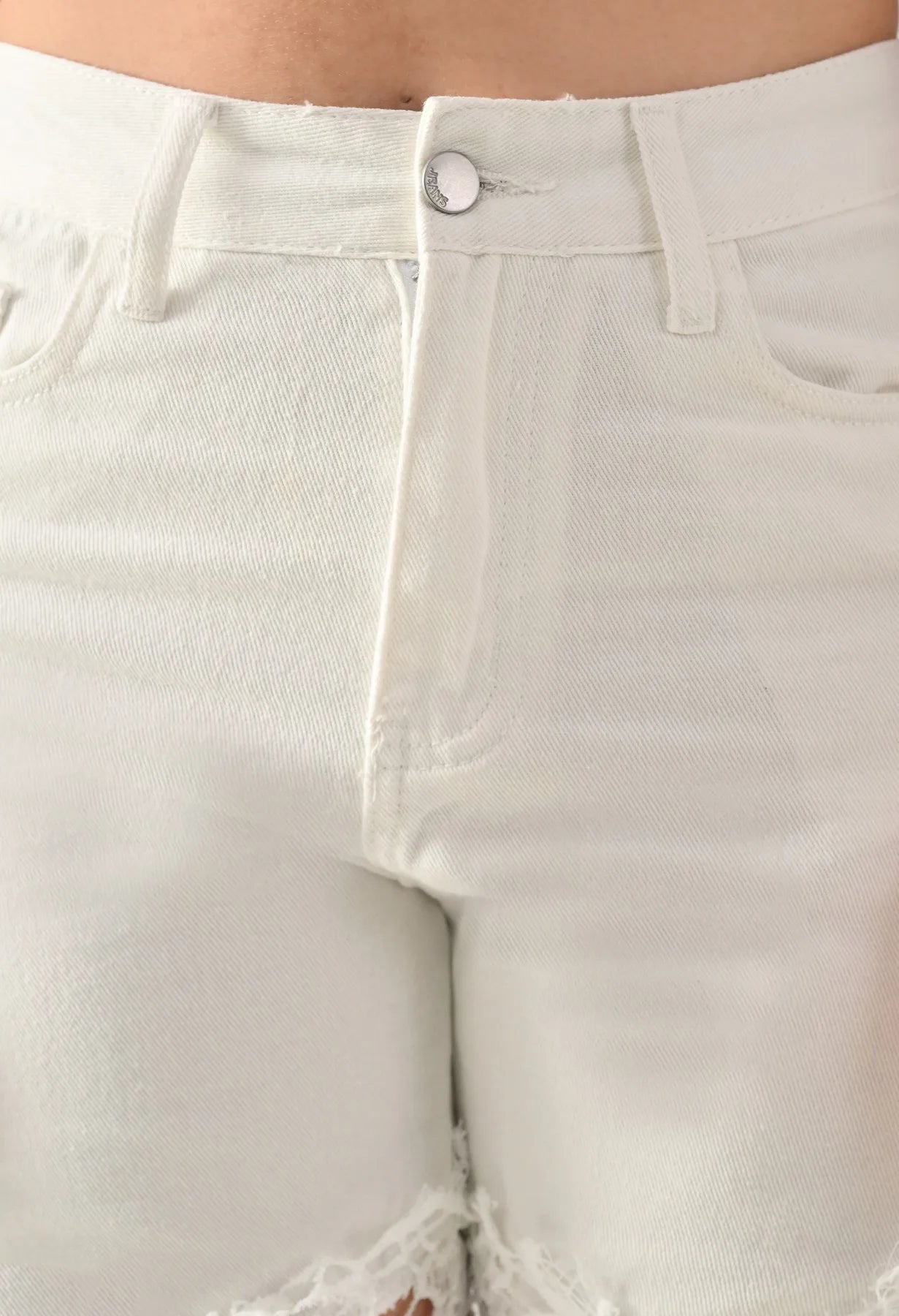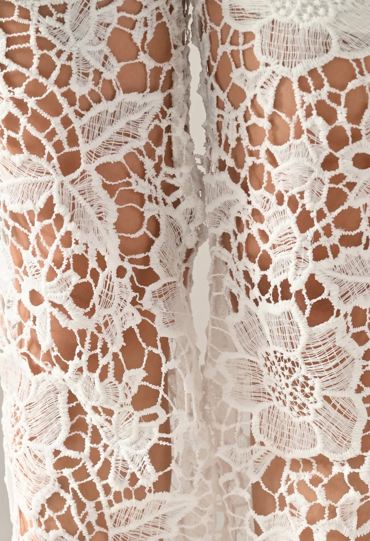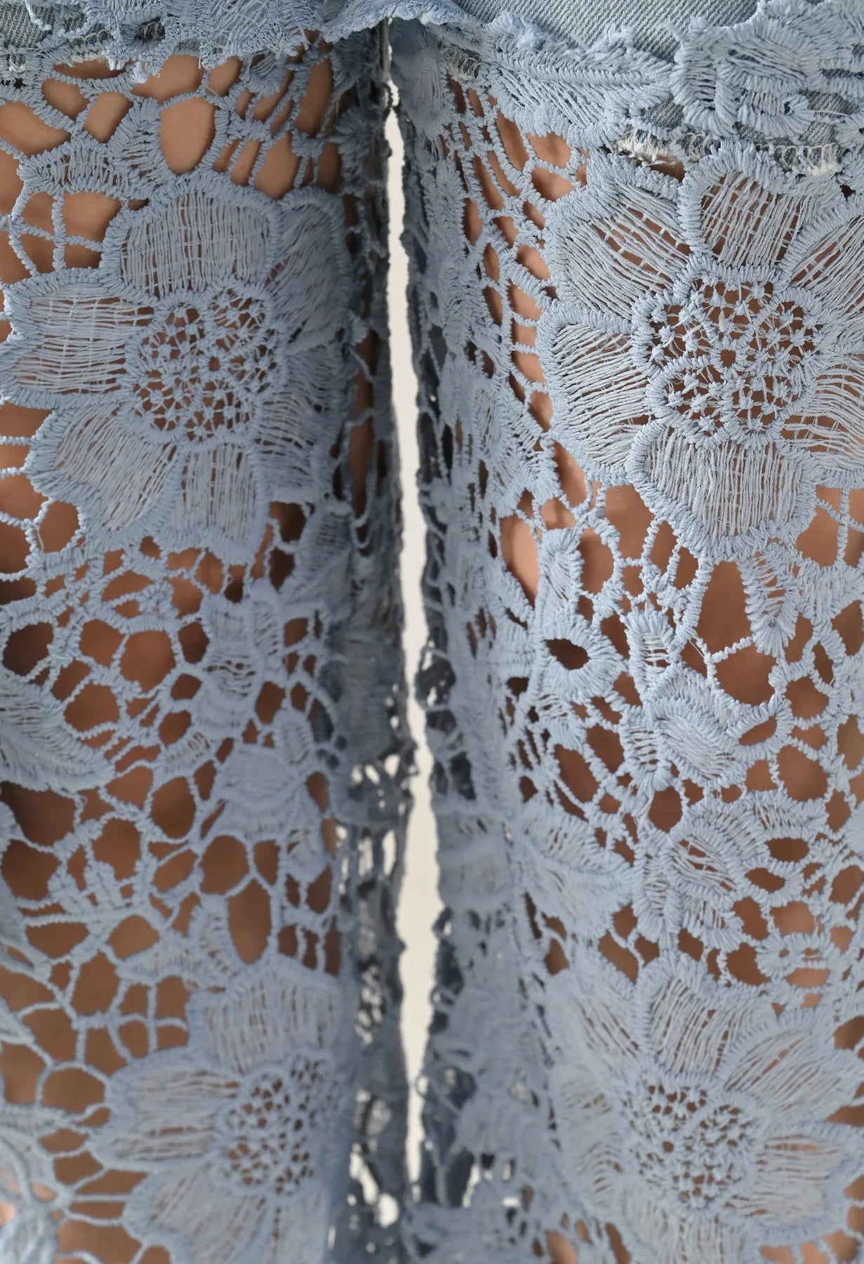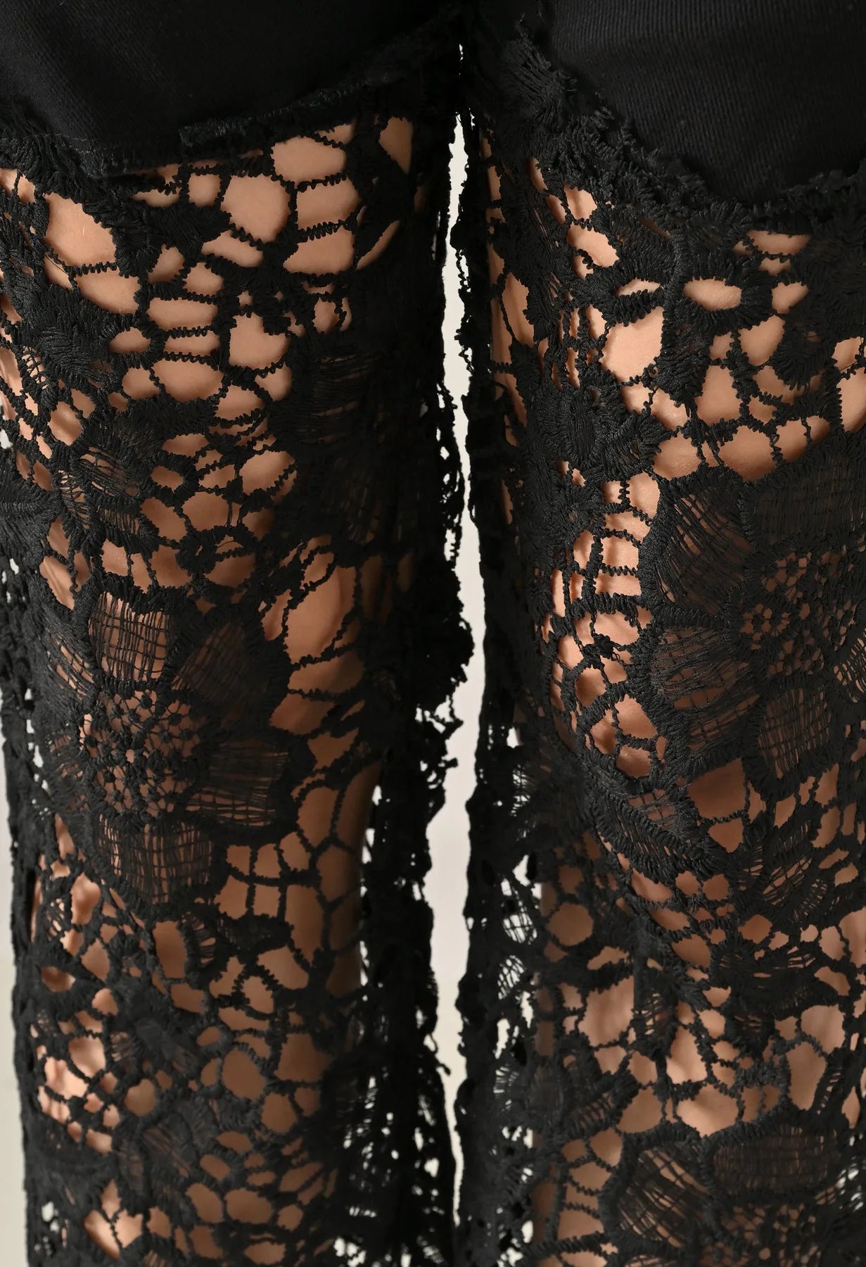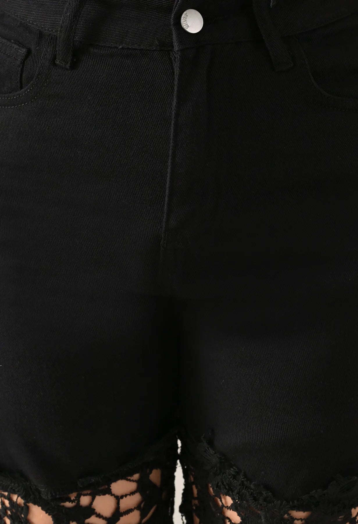 Elevate your denim style with these enzyme-wash jeans featuring a waistband with open fly and silver shank button. Designed with five belt loops and a PU patch at the waist for a classic touch. Includes two front and back pockets with a coin pocket for added functionality. The highlight of the design is the floral lace detailing from mid-thigh down to the ankle, adding a feminine and elegant twist to the rugged denim look. Finished with contrast stitching, this pair offers a soft, comfortable, and stretchable fit, perfect for chic everyday wear.
