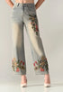Step into effortless glam with these washed denim jeans, designed in a flattering straight fit. Adorned with intricate floral embroidery and shimmering rhinestone embellishments, they add the perfect balance of elegance and edge to your wardrobe. Featuring a front button closure, zip fly, two front pockets with a coin pocket, and two back patch pockets for functionality. Crafted with stretchable fabric, these jeans ensure all-day comfort while making a bold statement.