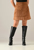 A chic solid suede mini skirt featuring a normal waistband and an invisible back zip closure for a smooth, polished finish. Designed with two darts at the front and back for a tailored fit and a straight-cut silhouette that flatters the figure. Fully lined for added comfort, this soft, non-stretchable suede fabric skirt offers a timeless, elegant look perfect for versatile styling.