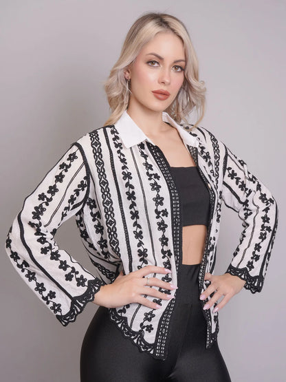 Introducing the Chain Stitch Embroidered Shirt – a versatile piece that is both trendy and elegant. Perfect for any occasion, from formal meetings to casual outings, this shirt features a stylish turn-down collar, drop shoulders, and long comfortable sleeves.